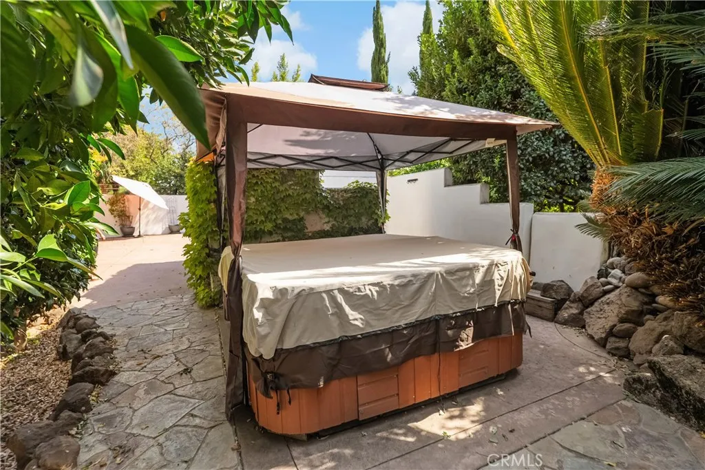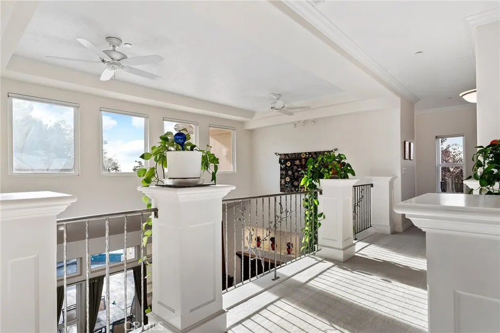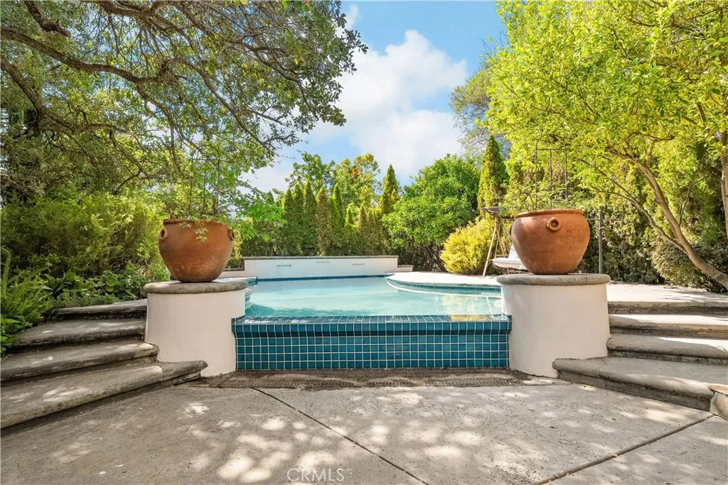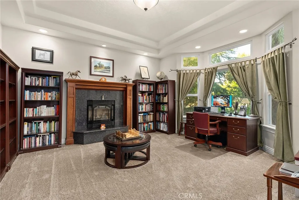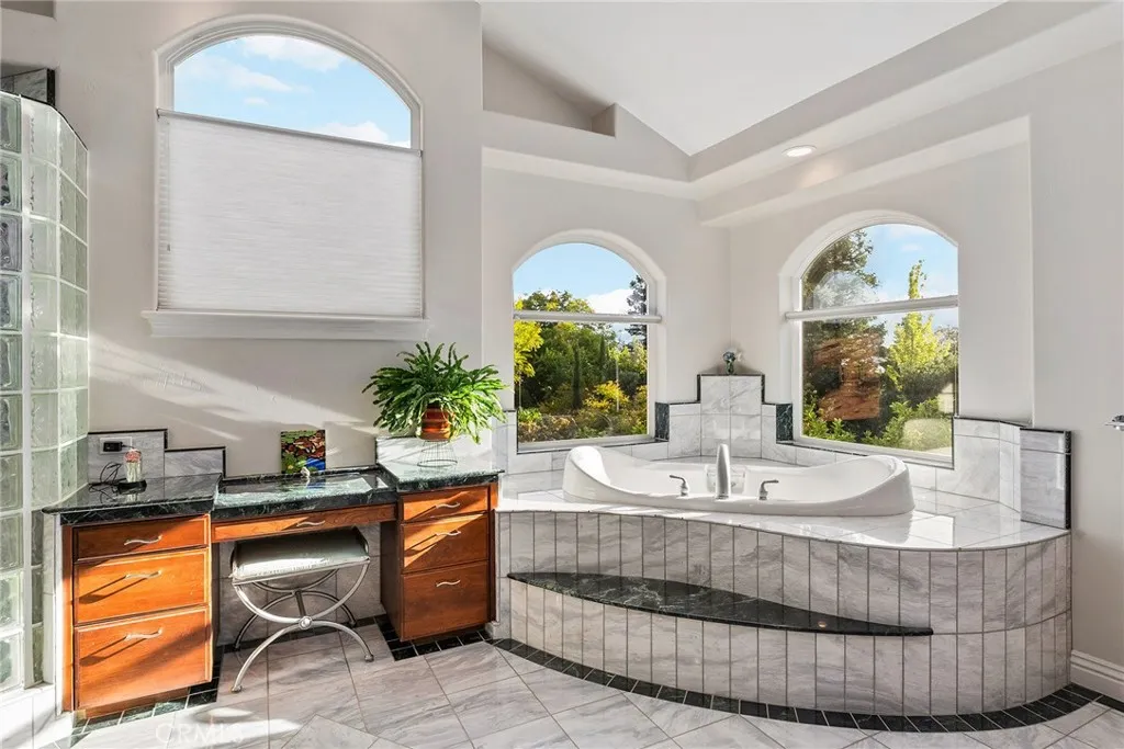 Welcome to a truly remarkable estate within the highly sought-after gated community of Canyon Oaks. Nestled on a private cul-de-sac on a sprawling one-acre lot near the entry gate, this Spanish-inspired residence showcases breathtaking landscaping and elegant design elements throughout. Step through the grand entryway into a home that exudes sophistication, with arched walkways and expansive windows that flood each room with natural light and offer beautiful views of the meticulously crafted grounds. The living room is an entertainer's dream, boasting soaring high ceilings, a cozy fireplace, and seamless flow into a gourmet kitchen. Here, you'll find luxurious granite countertops, double ovens, stainless steel appliances, an island and peninsula, plus a charming dining nook. Additional features on the main level include a climate-controlled wine storage room, two guest bedrooms, two guest bathrooms (one with a relaxing sauna shower), a formal dining room, and a cozy library with its own fireplace. Ascend the stunning wrought iron staircase to a second-floor terrace that overlooks the main living area. The upstairs media room provides a versatile space for entertainment or relaxation. The primary suite is an expansive retreat, featuring a fireplace, skylights, a private reading area, a balcony with scenic views, and a massive walk-in closet. The luxurious ensuite bathroom offers a soaking tub, walk-in shower, double sinks, and a vanity area. Upstairs, youll also find two additional guest bedrooms and a full guest bathroom. The backyard is an absolute oasis with a lush lawn,