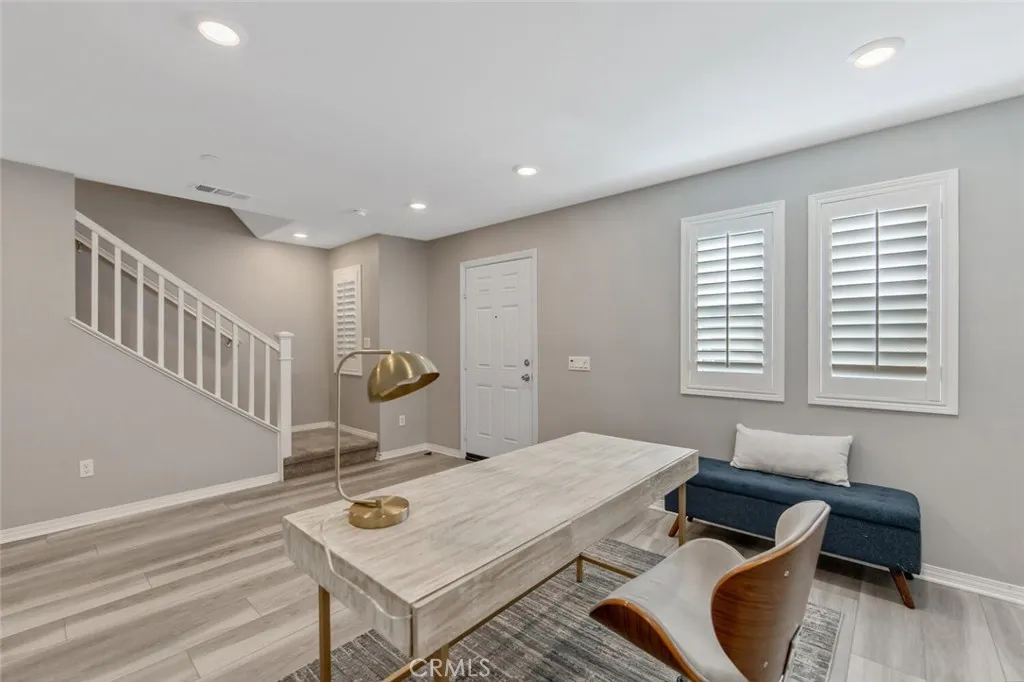 Beautiful townhome in the charming community of Citrus Grove in Fillmore - featuring 3 bedrooms plus an office and 2.5 bathrooms! Upon entry you are greeted by a light and bright flex space ideal for a home office, game room, gym or creative space, which is also conveniently attached to the 2 car garage! Upstairs you will find an open-concept, regal living space that is ideal for entertaining with a beautifully upgraded kitchen boasting timeless quartz countertops, crisp white cabinets, stainless steel appliances, plantation shutters and huge center island with storage on each side, plus extensive walk in pantry with enough room for food storage as well as appliances to hide away! The living room looks out onto the neighborhood and conveniently opens to the kitchen and entertainment area! On the upper level, you will find 3 spacious bedrooms with mirrored closet doors, including a primary retreat with picturesque mountain views in the distance! Luxury vinyl plank flooring, plush carpet, neutral paint, plenty of storage and great natural light plus additional highlights such as leased solar, tankless water heater, 2-car direct access garage with extra storage space, great for luggage, bikes, miscellaneous boxes! The charming curb appeal throughout the community welcomes you with its inviting impression, including gated front patio area! HOA amenities include a sparkling pool which is just a short distance from the house, BBQ area, ample guest parking and even a play area! Plenty of scenic walking and biking trails and Located just minutes to downtown Fillmore, restaurants an
