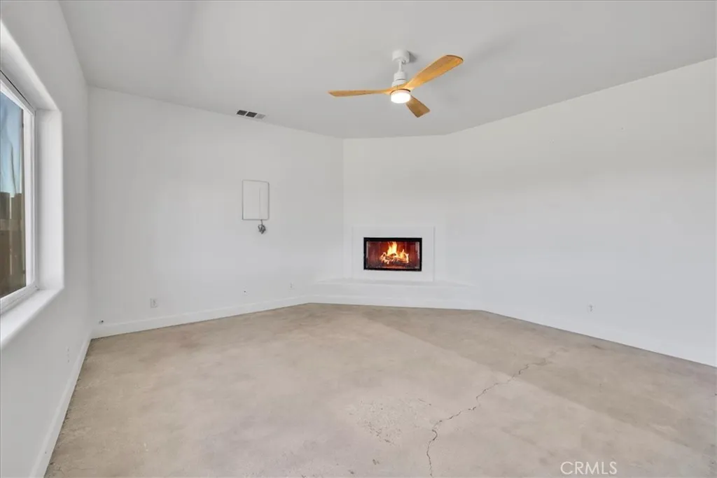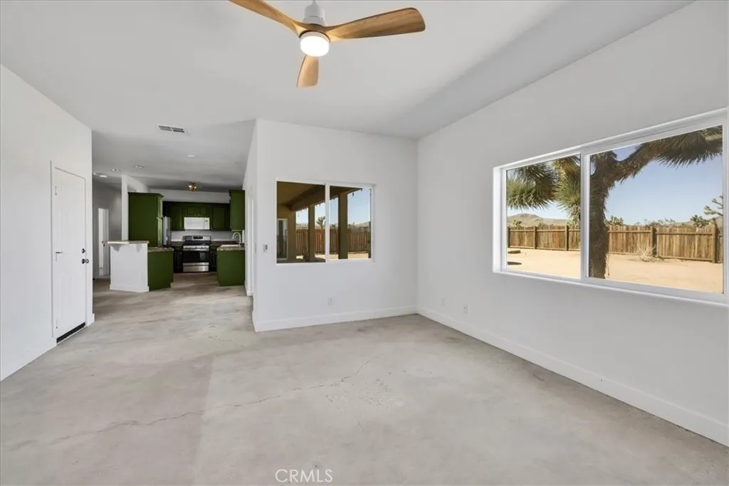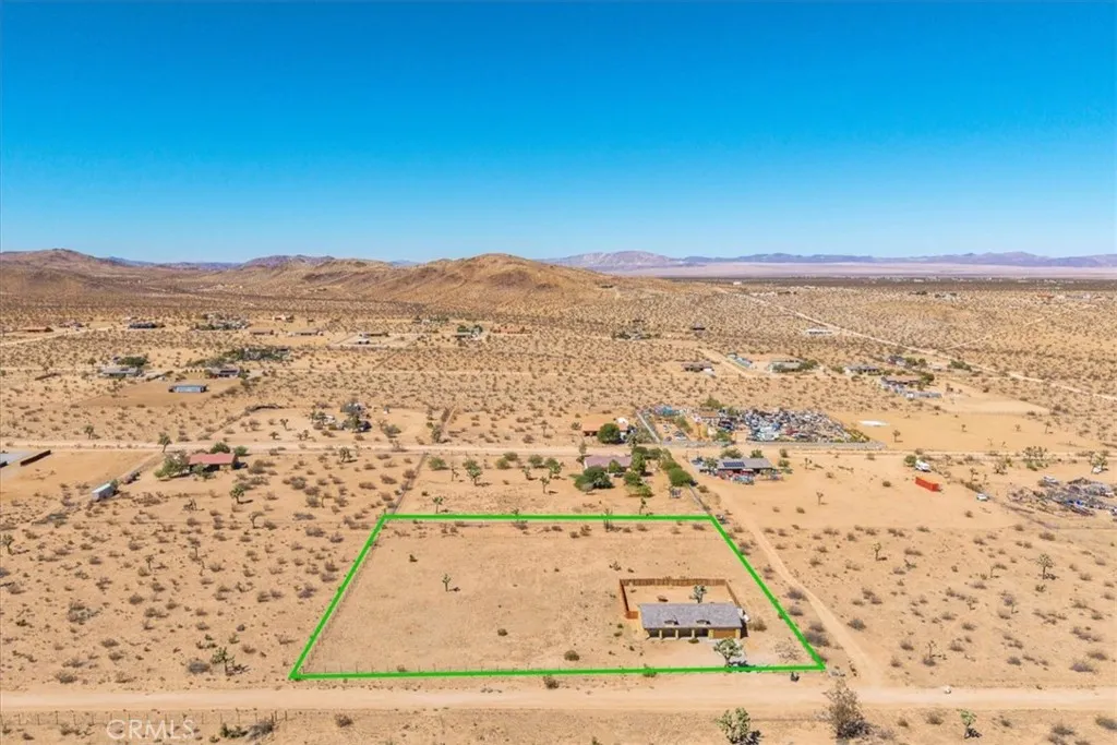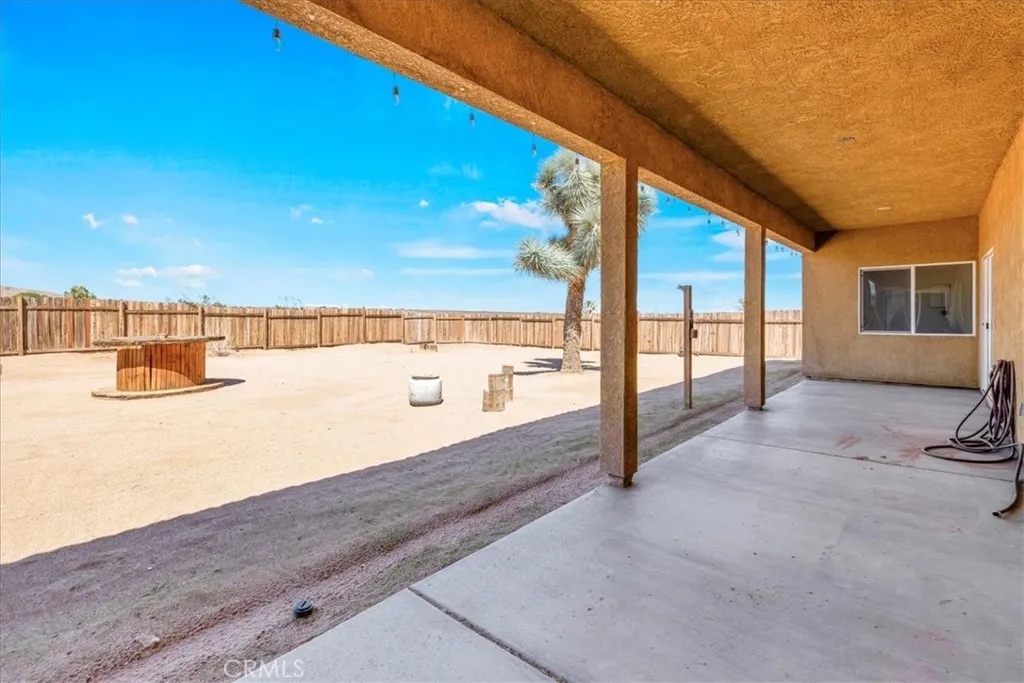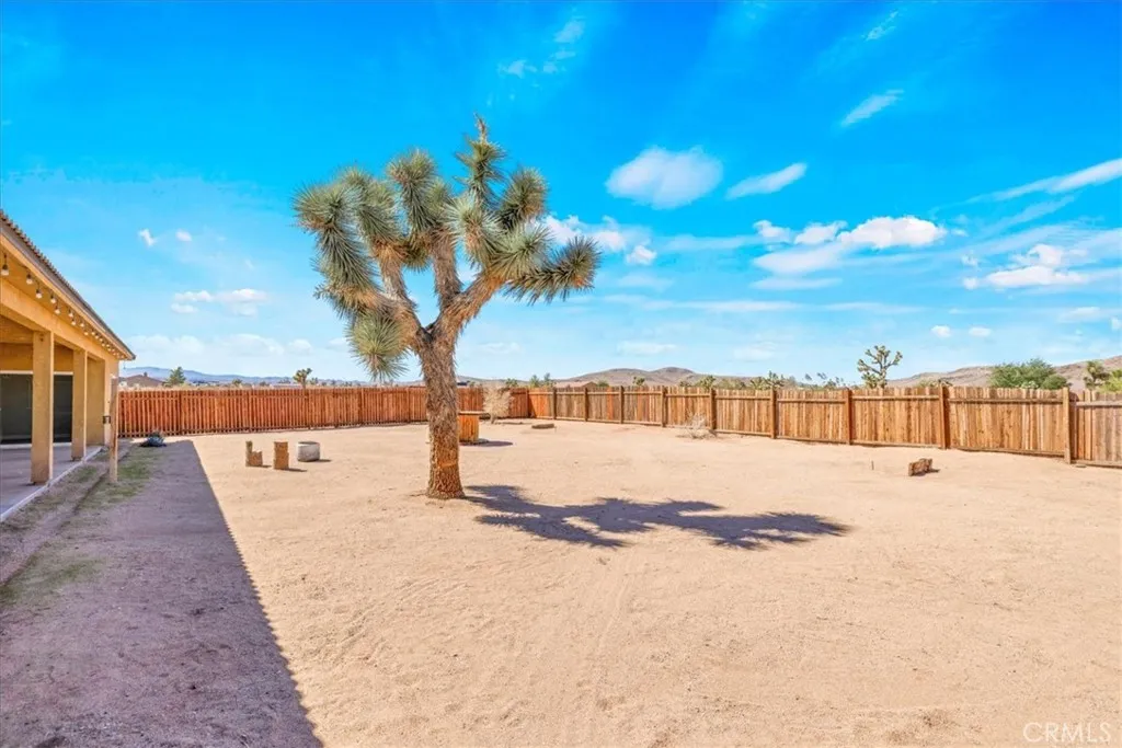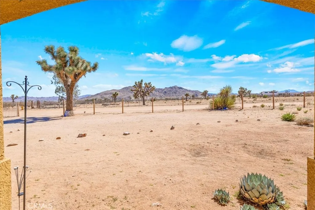 Welcome to your beautiful ranch-style home in peaceful North Joshua Tree! Sitting on 2.5 acres with dormer windows, arches, and sweeping panoramic desert and mountain views, this 3 bedroom, 2 bathroom home offers both charm and modern comfort with no visual power lines to impede the views .Step inside to find high ceilings and a cozy fireplace in the main living area, which flows seamlessly into the dining room and kitchen. The kitchen is a highlight with granite tile countertops, freshly painted cabinets, stainless steel appliances, breakfast bar, and a picture-perfect window view above the sink. Sliding glass doors off the dining area lead to a large covered patioperfect for entertaining or enjoying tranquil desert nights. The spacious bedrooms are bright and airy, each with concrete floors and ceiling fans. The primary suite includes a large walk-in closet, slider access to the back patio, and a private bath with a walk-in shower and matching granite finishes. The guest bath features a tub/shower combo and granite vanity. Additional features include:Fully fenced property with a wooden privacy-fenced backyard area. Underground utilities (no obstructed views!) 2-car finished garage with high ceilings and laundry hookups. Concrete driveway and charming covered front patio Room for a pool, workshop, or ADU etc. All parcels in this sought-after area are on acreage, ensuring space and privacy. Just 10 minutes to Joshua Tree Village and less than 20 minutes to the National Park, the location balances serenity with convenience.Inclusions: Washer, Dryer, Refrigerator Imagine star