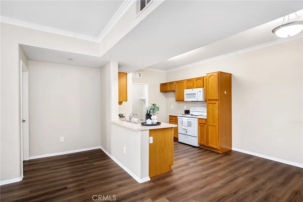 Discover effortless living in this meticulously maintained 2-bedroom, 2-bathroom condo, designed for modern comfort and style. The moment you step inside, you'll be greeted by an inviting, open-concept layout defined by stunning wood-style laminate flooring that extends throughout the main living spaces. The heart of the home is a bright and airy living room, centered around a charming fireplace with a tile surround. It creates the perfect focal point for quiet evenings or casual entertaining. The kitchen is both practical and polished, featuring a full suite of clean white appliances and abundant counter space, ready for your culinary adventures. A convenient breakfast bar provides a seamless transition from the kitchen to the dining area, enhancing the flow of the space. Retreat to the spacious primary suite, a true sanctuary complete with a generous walk-in closet and a private en-suite bathroom. The second bedroom is equally versatile and well-proportioned, ideal for a guest room, home office, or personal gym. Additional peace of mind comes with a brand-new air conditioning unit installed in January, ensuring year-round comfort and efficiency. Experience resort-style living with an array of exceptional community amenities. Enjoy a refreshing dip in the sparkling pool, relax in the soothing spa, or stay active at the on-site racquetball court and fully equipped gym. Added benefits include a 1-car detached garage for secure parking and extra storage, combining comfort with ultimate convenience. This home is not just a place to live; it is a lifestyle upgrade that perfectl