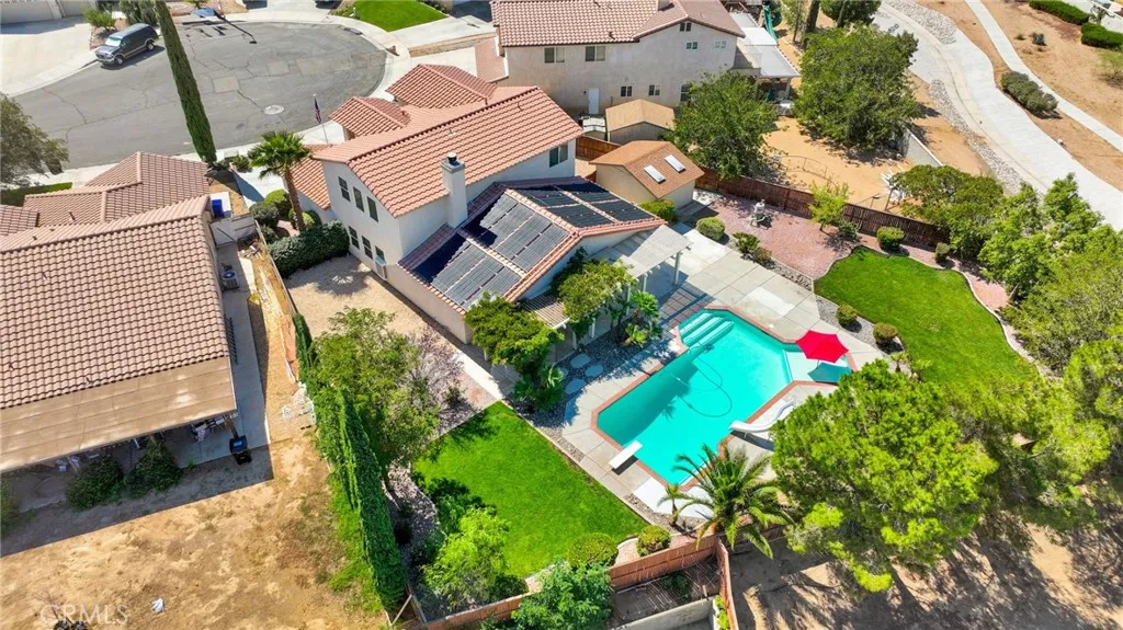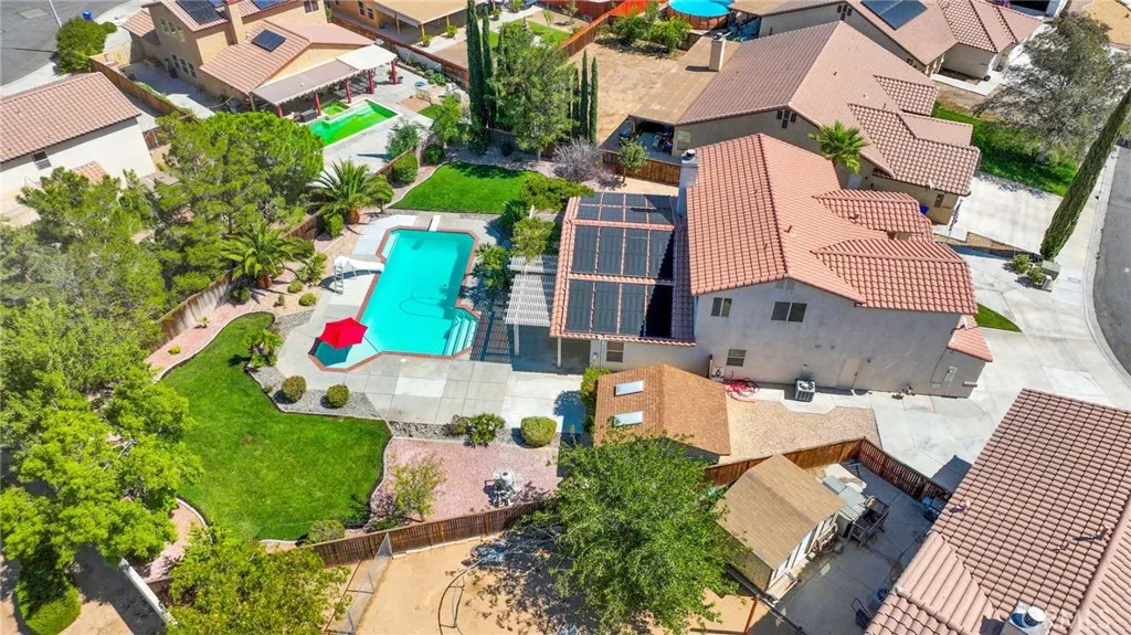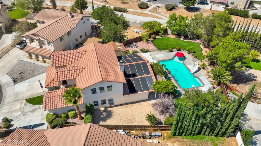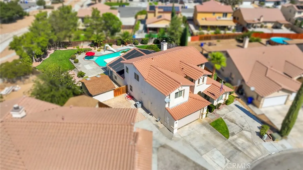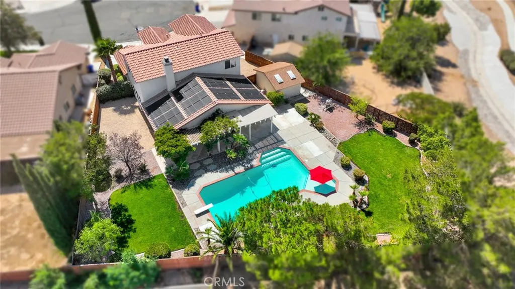This is THE HOME you won't need a vacation from! Welcome to prestigious Eagle Ranchwhere timeless Spanish style meets resort-style living. This spacious 2,799 sq. ft. home sits proudly on a 12,500 sqft cul-de-sac lot and has been lovingly maintained by its original owners since 2003. The true showpiece of this home is the resort-inspired backyardcomplete with an in-ground pool, diving board, slide, lush green grass, apple trees, and a large storage shed. Did I mention it has owned solar panels to heat the pool and keep your costs low! Whether youre hosting family BBQs, relaxing in the sun, or enjoying quiet evenings, youll feel like youre on vacation year-round. Pride of ownership shines throughout, from the American flag proudly displayed on the flagpole to the meticulous care that makes this home move-in ready. Nestled at the end of a peaceful cul-de-sac in one of Victorvilles most sought-after neighborhoods, this is truly the best home available in Eagle Ranch. Step inside to soaring high ceilings, a grand stairwell, and an open layout filled with natural light. The master suite on the main floor is a private retreat with garden-style French doors opening directly to the backyard oasis. The luxurious master bathroom features a soaking tub, dual sinks with additional vanity, a walk-in shower, a private throne room (aka toilet room with door), and a huge walk-in closet. There's also a second bedroom on the main floor that offers flexibility for guests, in-laws, or a home office. Upstairs, youll find two additional bedrooms, full bathroom plus a spacious loft that opens to