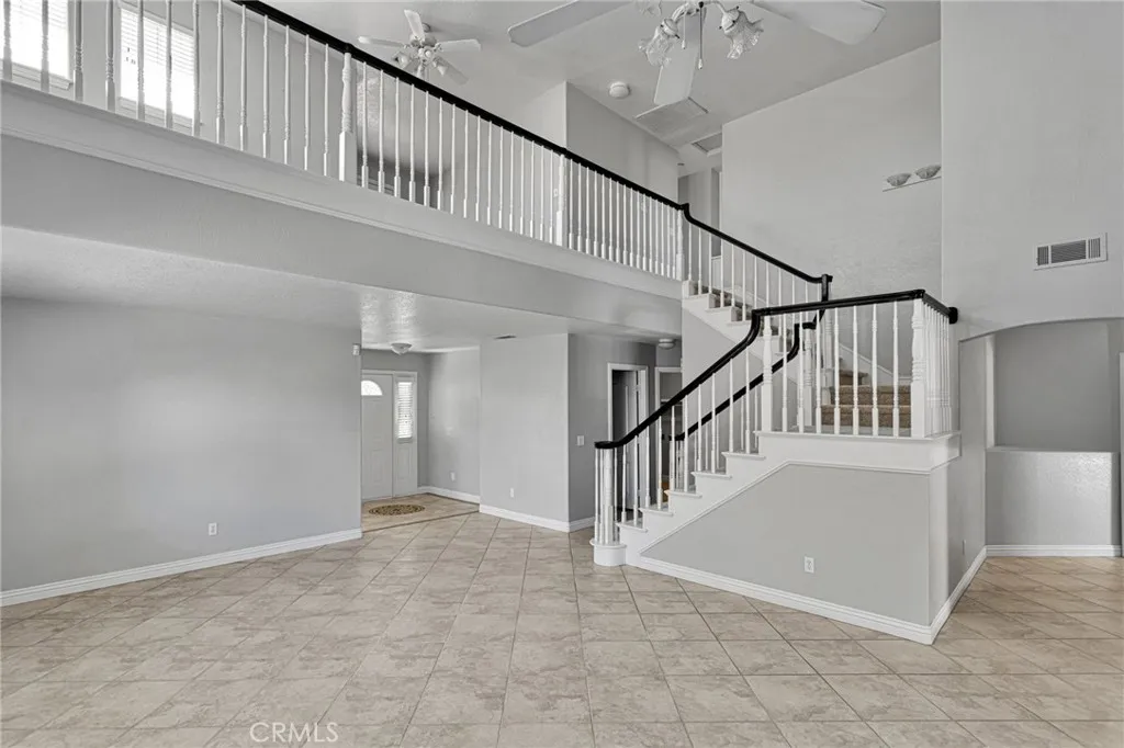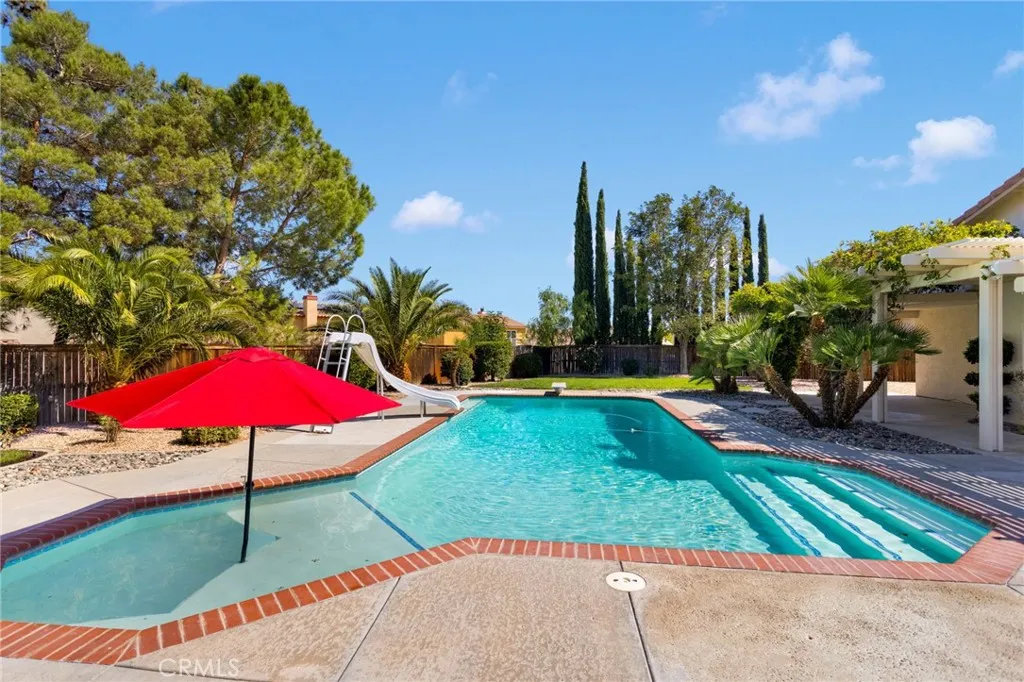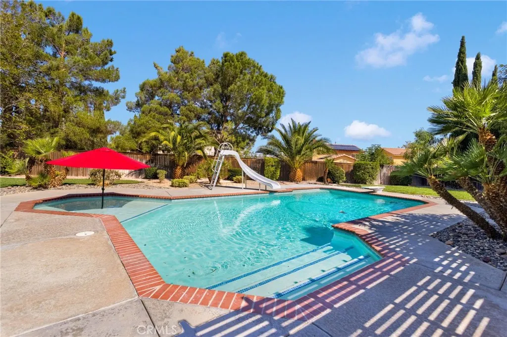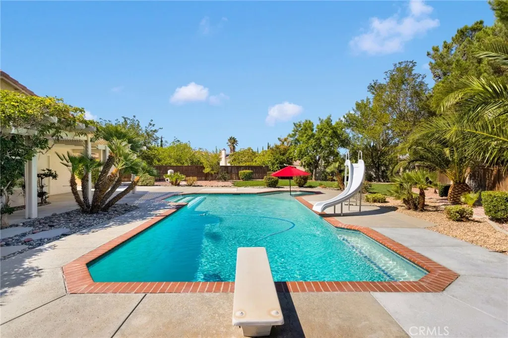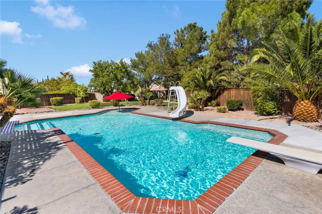 This is THE HOME you won't need a vacation from! Welcome to prestigious Eagle Ranchwhere timeless Spanish style meets resort-style living. This spacious 2,799 sq. ft. home sits proudly on a 12,500 sqft cul-de-sac lot and has been lovingly maintained by its original owners since 2003. The true showpiece of this home is the resort-inspired backyardcomplete with an in-ground pool, diving board, slide, lush green grass, apple trees, and a large storage shed. Did I mention it has owned solar panels to heat the pool and keep your costs low! Whether youre hosting family BBQs, relaxing in the sun, or enjoying quiet evenings, youll feel like youre on vacation year-round. Pride of ownership shines throughout, from the American flag proudly displayed on the flagpole to the meticulous care that makes this home move-in ready. Nestled at the end of a peaceful cul-de-sac in one of Victorvilles most sought-after neighborhoods, this is truly the best home available in Eagle Ranch. Step inside to soaring high ceilings, a grand stairwell, and an open layout filled with natural light. The master suite on the main floor is a private retreat with garden-style French doors opening directly to the backyard oasis. The luxurious master bathroom features a soaking tub, dual sinks with additional vanity, a walk-in shower, a private throne room (aka toilet room with door), and a huge walk-in closet. There's also a second bedroom on the main floor that offers flexibility for guests, in-laws, or a home office. Upstairs, youll find two additional bedrooms, full bathroom plus a spacious loft that opens to
