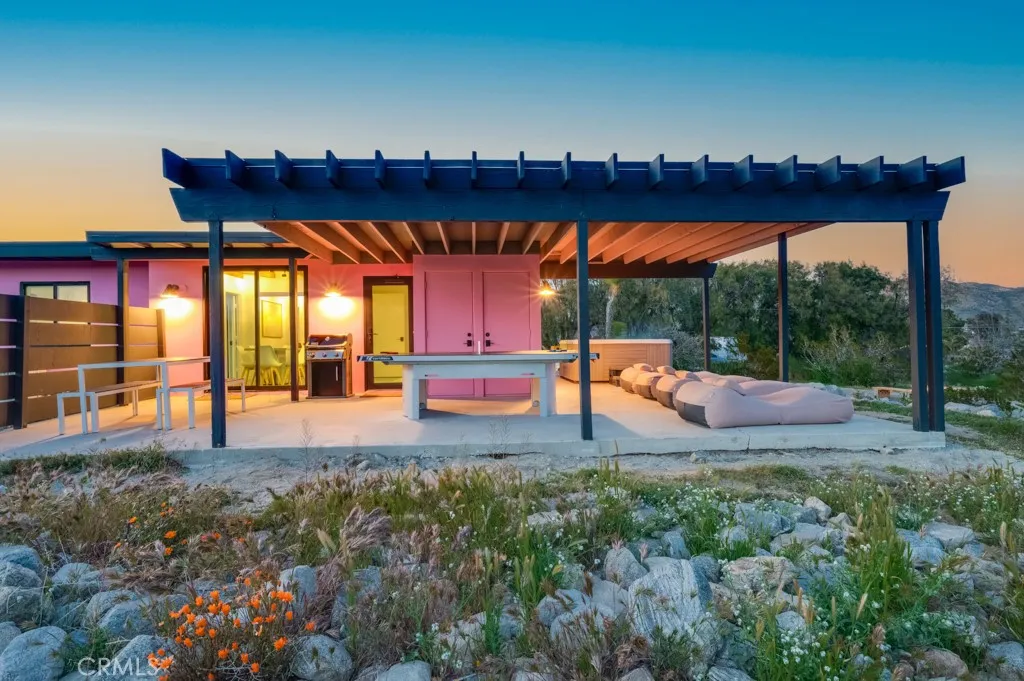 Pink Galaxy holds strong chromatic themes, original art, and is a star grazers dream in a special paradise. Halfway between Joshua Tree and Palm Springs exists a special medium between stars, city, alpine, and an always oasis climate. Magically cooler in summer and warmer in winter than its neighboring areas, large fruit trees grow next to stark Joshua Trees in this special zone of the desert due to its high watertable, subterranean rivers, natural springs, creeks and marshes. This home is a 1961 homestead with a low modern roof line and beamed ceilings, the floor is polished concrete is stained aqua marine in juxtaposition of its pink exterior like an image from Hubble. The Kitchen is socially open to both the living room and dining room separately to left and right. It features under counter appliances and open shelving to preserve head space. The stove and fridge are retro Classic brand in power coated aqua further nodding to the home's mid-century vibe. Island and counters are black marble quartz with waterfall ends, providing extra storage and under counter drawer microwave and dishwasher. There are 2 Large Bedrooms with a third flexible bonus room that is being used as a bedroom, but can be used as an office, den, or yoga room. The living room is centered on an original rock wall and wood stove with entertainment center, perpendicular is a contemporary record player station with high-fi speakers above hangs sveral vintage guitars formed as one-of-a-kind artworks. The dining room has an integrated lighting design consisting of backlit mounted rice hats and a microcrete