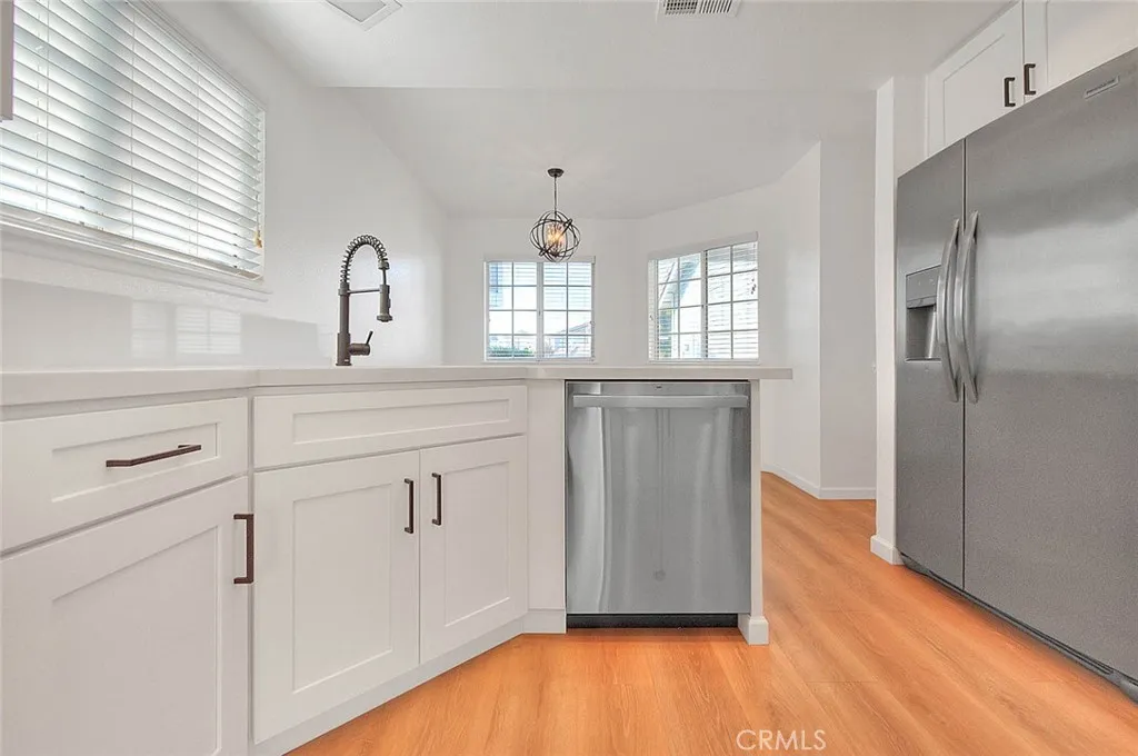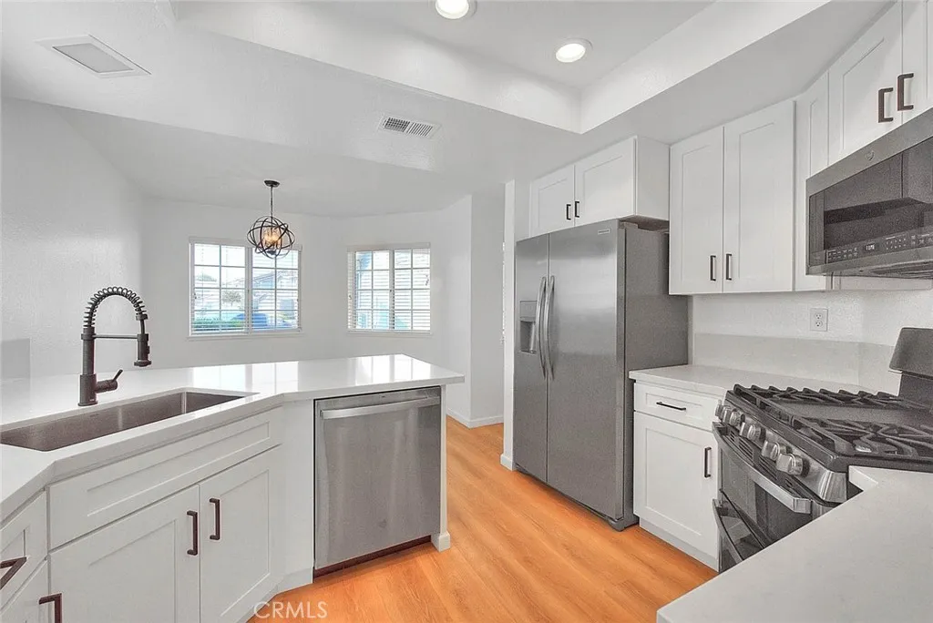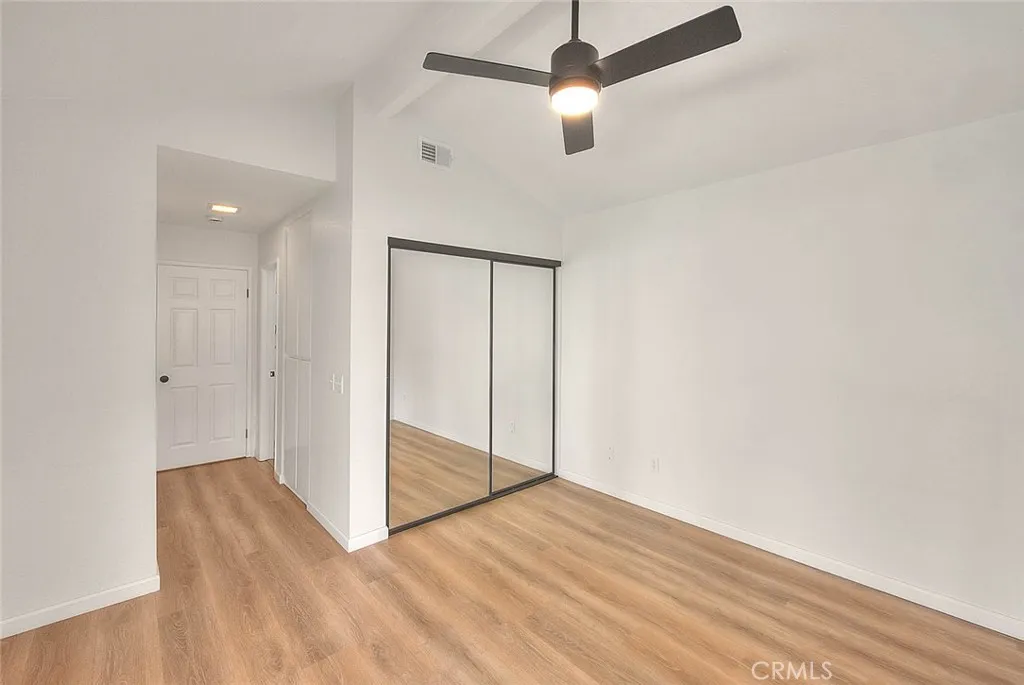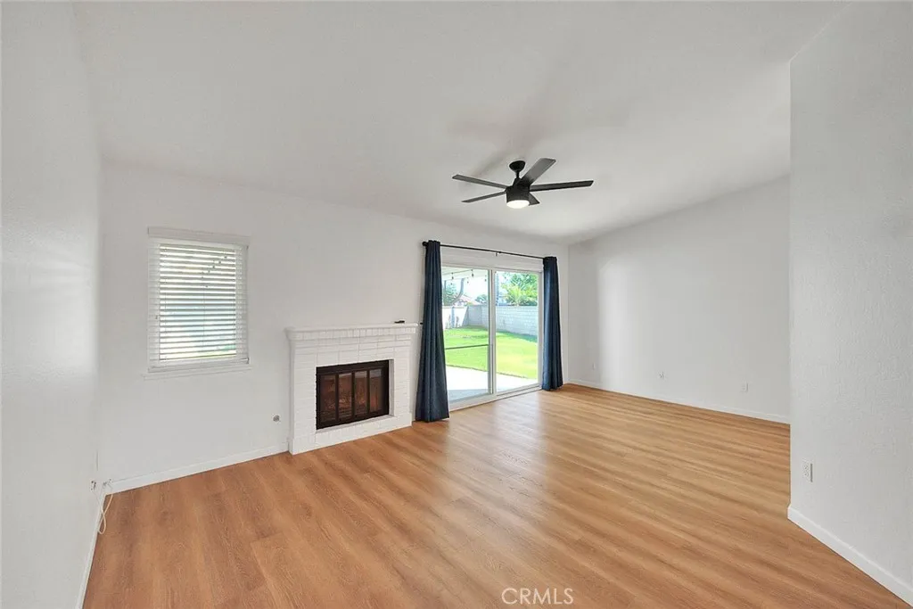 Very desirable Hampshire Village community with low $193 association dues that includes fire insurance, community pool/spa, and front yard maintenance. This one-story floor plan is one of only a handful. Vinyl wood look laminate floors throughout. Brand new kitchen with granite counter tops, tiled back splash, stainless steel appliances (gas range and microwave), shaker cabinets, and recessed lights. Enjoy the breakfast nook for casual dining. Vaulted ceilings in the living room, warm and toasty fireplace burns gas logs or wood. Two new bathrooms with tiled showers, glass shower doors, shaker cabinets, and granite countertops. Indoor laundry room and an attached two car garage with covered walkway to the front door. The ac has been replaced, new front screen door. Two newer dual pane sliding doors exit to the double sized (perhaps the largest lot in the community) private back yard. One slider is off of the master suite the other off of the living room. Both sliders enter the covered patio with concrete deck. Concrete tile roof. This home is in a planned unit development and shares one wall with an adjoining home. Extra parking with the private concrete driveway for two cars. Community pool and spa, sport court, barbecue area, meandering walking path. Excellent schools and nearby shopping. Chino is a multiple award winner of Top 100 Cities for Young Families.