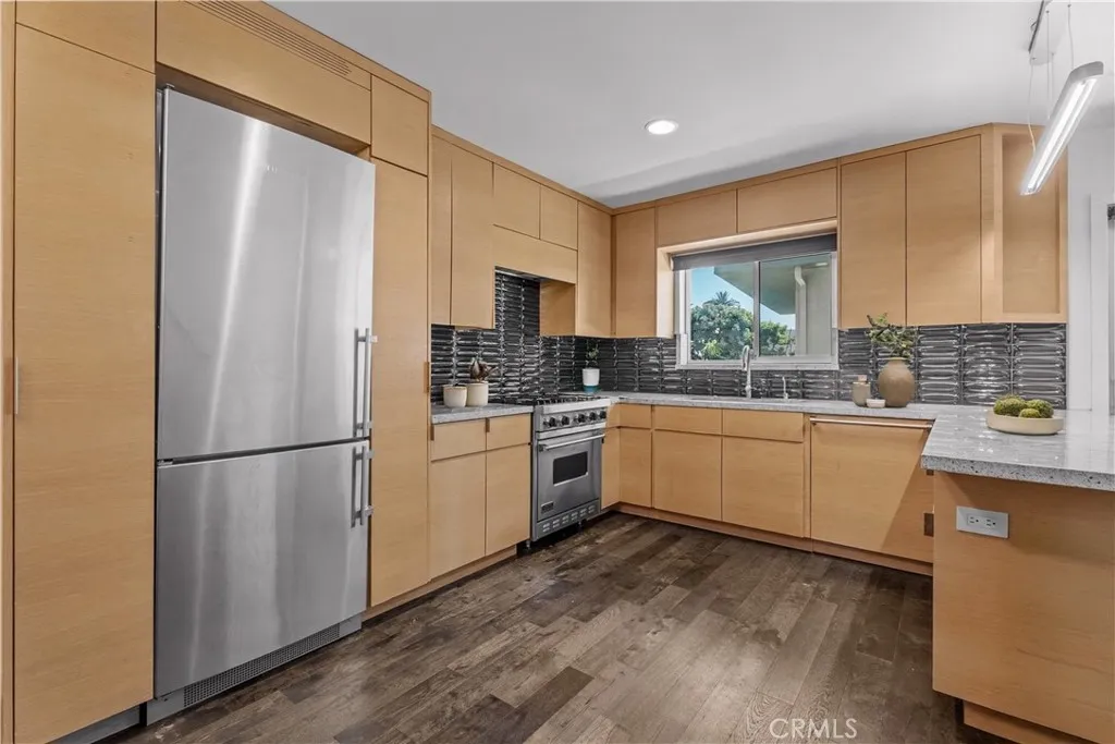 Welcome to Your Chic Top-Floor Mid-Century Retreat with In-Unit Laundry! This light-filled, top-floor condo blends classic mid-century charm with modern-day comfort and functionality. The open-concept layout features an oversized chefs kitchen with premium appliances including a Viking stove perfect for both daily living and entertaining. The spacious living and dining area flows effortlessly to a sun-drenched, south-facing balcony, while a built-in home office nook creates the ideal space for remote work or creative pursuits. The beautifully renovated bathroom includes a convenient stackable washer and dryer. Thoughtful extras include generous storage, one assigned parking space, two guest spots, and permitted street parking. Enjoy year-round relaxation with access to a heated pool. Nestled on the picturesque and tree-lined Hayworth Avenue, this prime West Hollywood location puts you just moments from top-tier dining, cozy cafs, vibrant nightlife, and iconic comedy clubsincluding The Laugh Factory. Plus, Trader Joes, Whole Foods, and Bristol Farms are all within easy walking distance. Don't miss the opportunity to make this stunning top-floor gem your own!