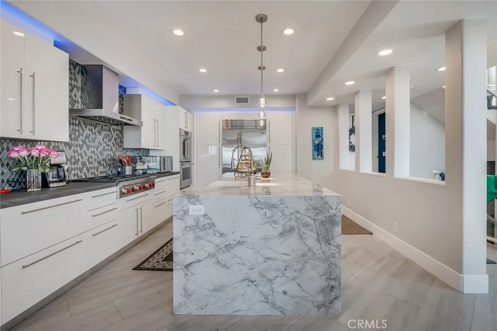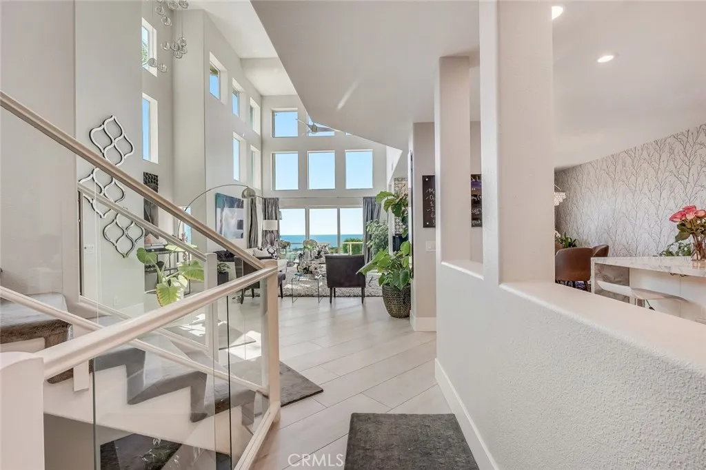 Welcome to Lantern Village, Dana Point with an unbeatable walk to beach location. This luxury coastal residence offers unobstructed views, of Catalina Island, Coastline, the Pacific Ocean and never-ending sunsets. Breathtaking floor to ceiling windows provide a stunning impact of light and water in all seasons. Directly across the street from the coveted Strands beach preserve, Salt Creek beach and easily accessible to the downtown area, shopping, farmer's market, entertainment and nearby Dana Point Marina. 33737 Chula Vista has experienced a complete renovation and will not disappoint at 3,167 sq. ft, 4 bedrooms and 3.5 baths. The open main living floor plan includes living room, dining, a stunning custom glass tile surround, fireplace for intimate gatherings, gorgeous silk Dupioni drapes. The chef's kitchen with a 10ft tailor-made Dolomite stone which resembles marble but more durable, island houses a Thermador dishwasher, Viking microwave and well thought out storage. Italian custom laminate gloss cabinetry, unique Italian overhead pendents, Sub Zero 42" refrigerator, Wolf six burner range and GE Monogram Chef's double oven. Perfectly layered for an extraordinary experience as a guest and superb high end efficiency as Chef, while maintaining the beach-living lifestyle. The dining room displays Vintage wallpaper from the UK, Italian chandelier, ocean view and sliding doors to the outdoor deck. The lower level encompasses an oversized game/media room with glass tile fireplace, wine room, full bathroom and office/bedroom. Sliding doors lead onto a peaceful patio ocean view