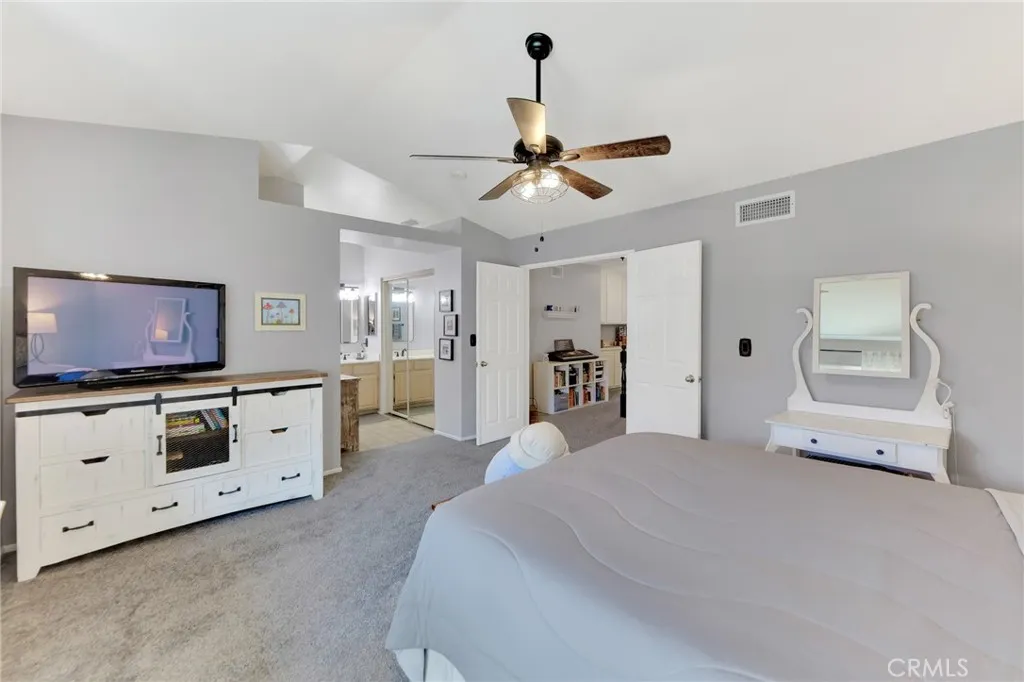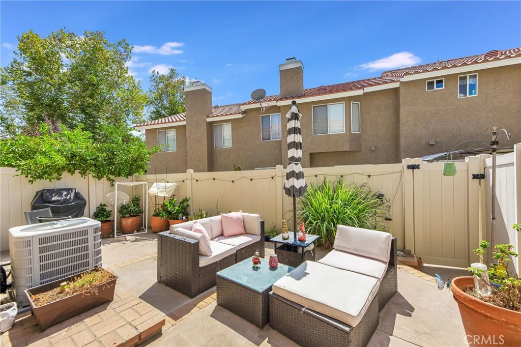 Welcome to this beautifully appointed townhome in the desirable Brock Canyon Villas of Santa Clarita, offering 3 bedrooms, 2.5 bathrooms, and just under 1,500 sq ft of thoughtfully designed living space with a private 2-car attached garage. The entry opens to soaring two-story ceilings and a semi-open floorplan filled with natural light, featuring light wood laminate flooring in the main living areas and tile in the kitchen and powder room. A fireplace serves as the centerpiece between the living and dining spaces, while the kitchen is equipped with granite countertops, stainless-steel appliances, a walk-in pantry, and refinished cabinets. For movie nights or immersive entertainment, the living room is enhanced with a built-in projector, integrated sound system, and a dropdown screen that transforms the space into your own private theater. Sliding doors off the dining area extend the living space to a very large private patio, ideal for outdoor dining or entertaining. Upstairs, all three bedrooms have ceiling fans providing comfort and retreat, including a spacious primary suite with double-door entry, a bay-window alcove, and an en-suite with dual sinks. Notable updates include newer carpeting on the stairs and upper level, replaced AC unit and ducting in 2020, recessed LED lighting added to kitchen, double-pane windows throughout, installed closet systems in 2 bedrooms, reglazed showers and tubs in both upstairs bathrooms, and updated garage door with Wi-Fi enabled opener. The well-maintained Brock Canyon Villas community offers a pool, spa, landscaped greenbelts, guest p