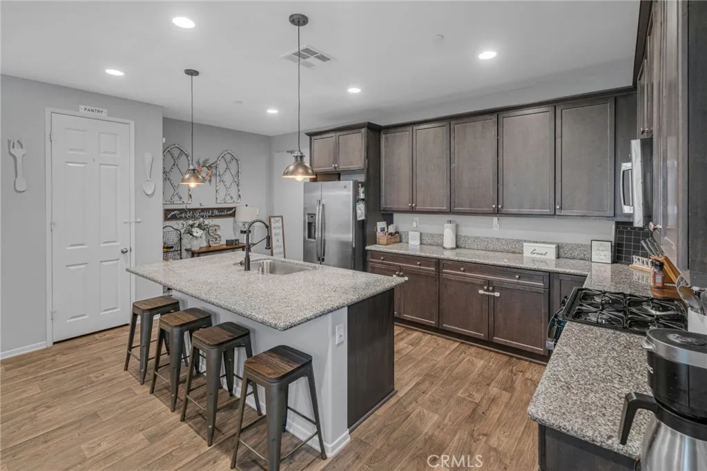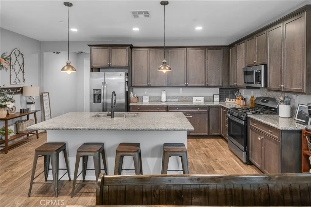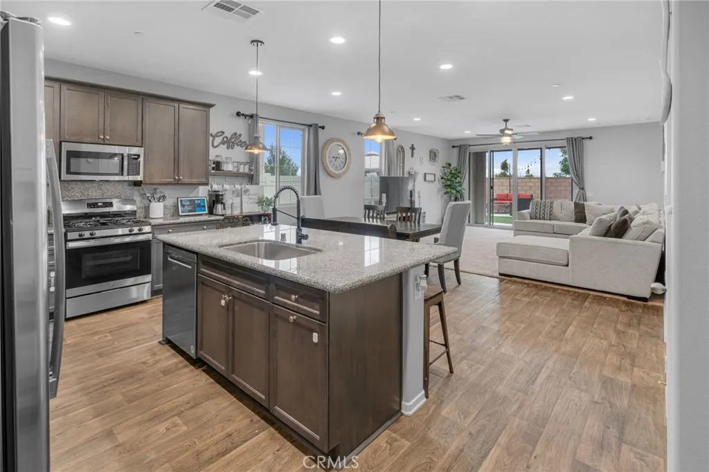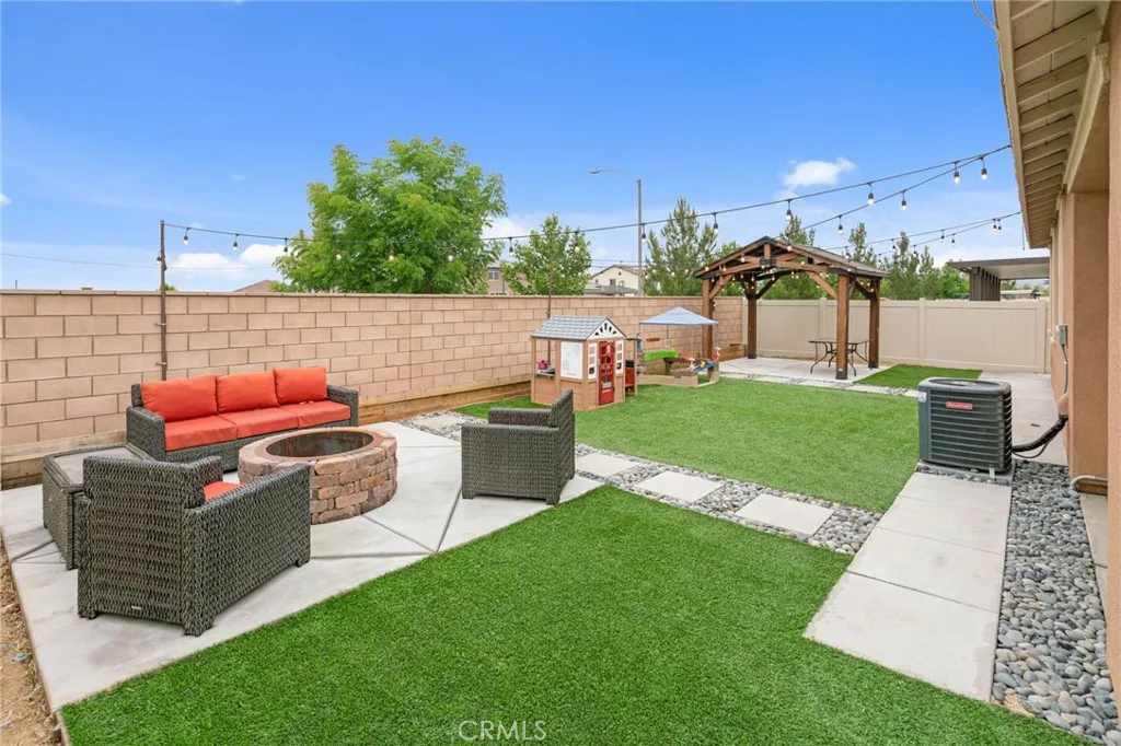 Welcome to this stunning single-story home in the desirable Seasons at Green Valley Ranch community! Built with modern living in mind, this nearly new home offers 3 spacious bedrooms plus a versatile office/flex room that can easily serve as a 4th bedroom. Step inside to discover stylish upgrades throughout, including custom paint, luxury vinyl plank flooring, and recessed lighting. The open-concept floor plan seamlessly connects the great room, dining area, and gourmet kitchen, perfect for entertaining and everyday living. The kitchen is a showstopper, featuring custom cabinetry, a large center island, granite countertops, stainless steel appliances, and elegant pendant lighting. The private primary suite includes a generous walk-in closet and an ensuite bath with dual sinks and a walk-in shower. Two additional bedrooms are generously sized and share a well-appointed full bathroom with upgraded cabinetry and lighting. Enjoy indoor-outdoor living with double sliding doors that lead to a beautifully designed backyard. Highlights include a built-in covered patio, low-maintenance artificial turf, a custom gazebo with lighting, a built-in fire pit, and attractive hardscaping, ideal for hosting guests or relaxing with family. Block walls and vinyl fencing provide privacy and a finished look. Dont miss your chance to own this beautiful home in a growing and vibrant area of Perris. Schedule your private tour today!