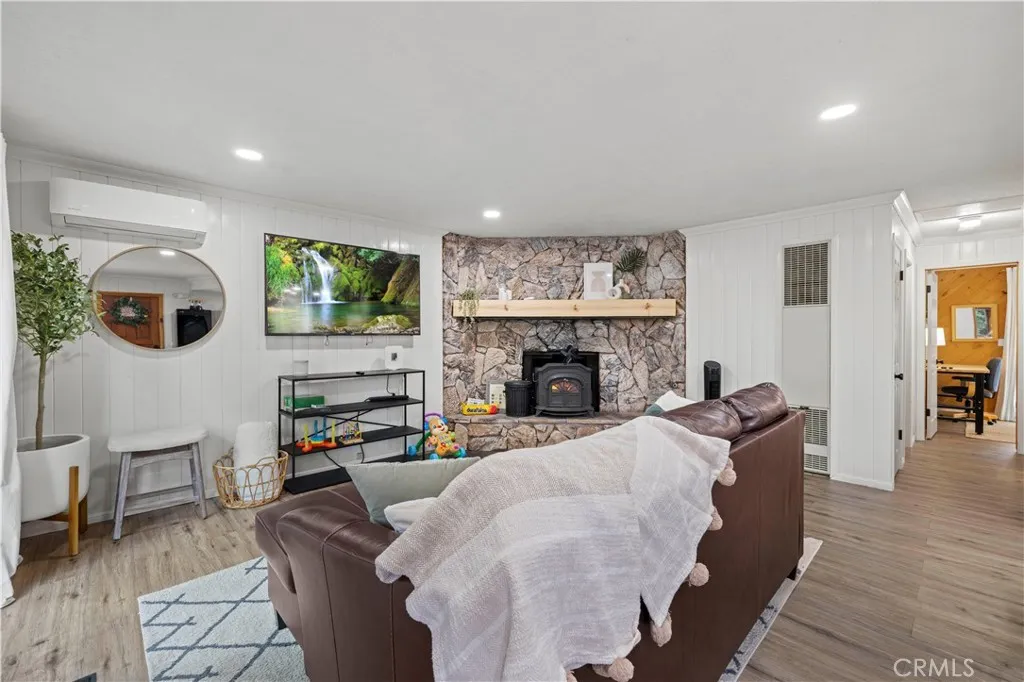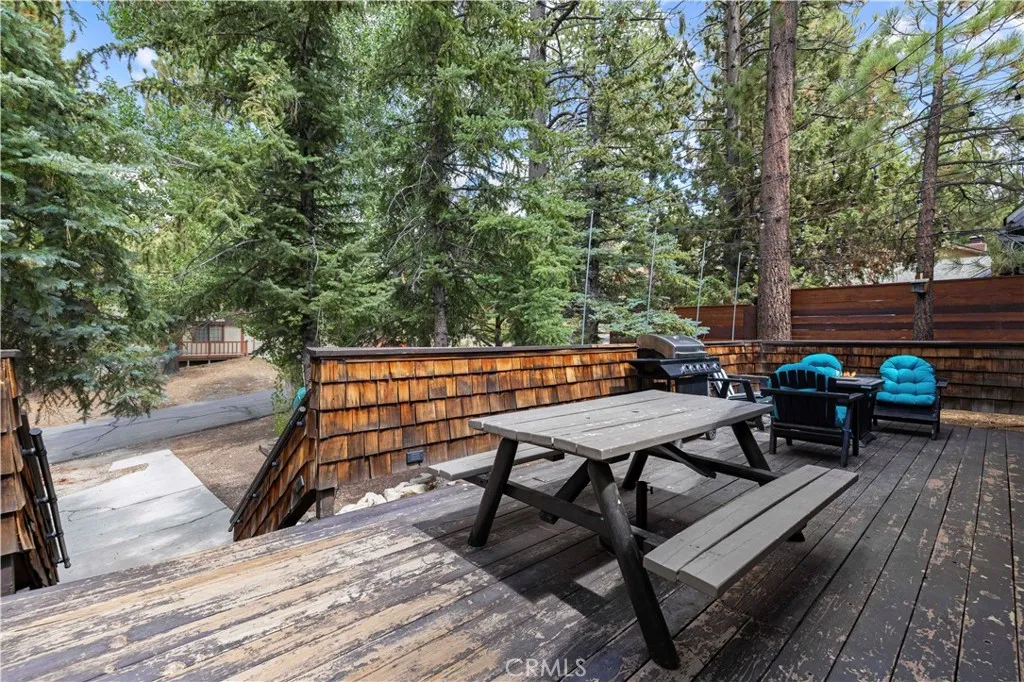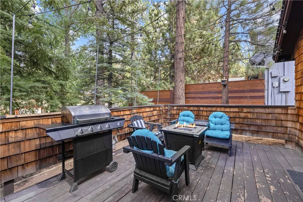 This Moonridge retreat is the mountain escape you have been waiting for, offering Big Bear living in every season. Nearly 1,000 sq ft with 2 bedrooms and 2 bathrooms, it is thoughtfully updated with LVP flooring throughout, fresh finishes, and a new smart ductless A/C in the living room to keep summer days refreshingly cool and winter nights cozy warm, easily controlled from your phone or the included remote. The kitchen opens to the living room where a stunning rock fireplace with a wood burning stove insert anchors a welcoming gathering space. The large front yard boasts a private playground and plenty of room for sledding and snow play in the winter, your own personal winter wonderland, a rare luxury in Big Bear. The front deck is perfect for grilling and entertaining with an included BBQ grill and fire pit. The guest bedroom enjoys a private back deck to take in sweeping views of Snow Summit, Bear Mountain, and the surrounding peaks. The guest bathroom includes a shower in tub combination and a large frameless anti fog LED light wall bathroom vanity mirror. The spacious primary bedroom offers a private bathroom with a walk in shower, dual sinks, and in home laundry for convenience. Centrally located between Bear Mountain Resort, Snow Summit Resort, Bear Mountain Golf Course, The Village, the lake, and a multitude of restaurants, groceries, shopping, and amusement attractions, there is always something to do for all ages. Whether it is skiing and snowboarding in winter, hiking and biking in spring, golfing and lake days in summer, or crisp autumn nights under the stars,