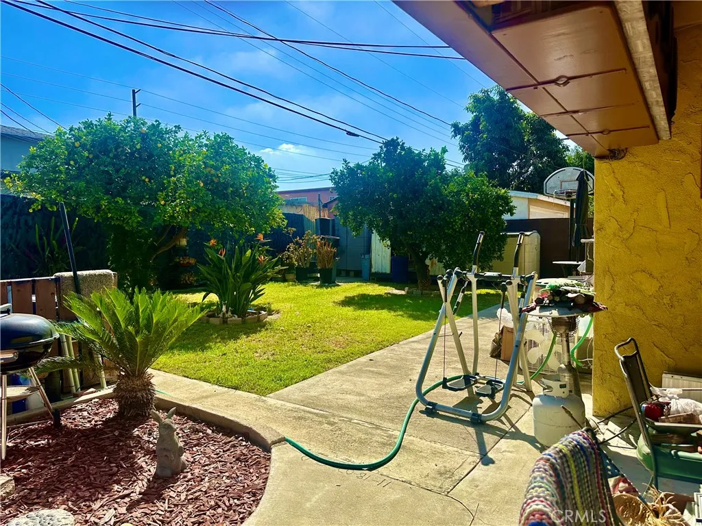 Entertain family and friends in this spacious beautiful backyard, an open patio with mature fruit trees. 3 bedrooms one updated bathroom. Light and bright living room with an adjacent dining area. Formica counter tops with tiled back splash. Plenty of cabinet space. Hallway linen closets. One car attached garage with 2 car spaces/driveway. Tiled front entry. Lovely front porch sitting area with built in planters surrounds. Newly installed 14 panels solar system. Updated electric panel.