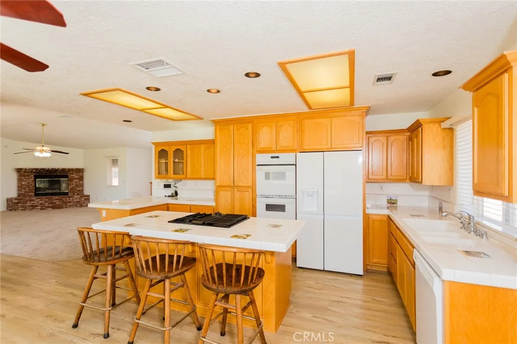 Custom Golf Course Retreat in Silver Lakes Welcome to a thoughtfully designed 3,051 sq. ft. home overlooking the East Golf Course in the heart of Silver Lakes. Built with enduring quality, this two-story residence combines craftsmanship with resort-style living. Enhanced features such as 2x6 framing, added insulation, earthquake reinforcement, and rebar construction reflect foresight and pride of ownership. The entry foyer sets the tone with natural light and a grand chandelier. Downstairs, a spacious family room with wood-burning stove, custom sunken bar, and wrap-around picture windows creates the perfect entertaining space. Sliding doors open to a covered patio with swing seating and outdoor fireplace which directly faces the golf course, while two bedrooms on this level offer comfort and privacy. Upstairs, the kitchen offers generous cabinetry, center island seating, dual ovens, new Energy Star refrigerator and dishwasher, and ample counters for the home chef. The adjoining dining and great room spaces feature abundant windows and a brick lined gas fireplace. The primary suite is a private retreat, highlighted by its own brick lined gas fireplace, dual walk-in closets, jetted tub, shower, and separate vanities. A covered balcony provides sweeping views of the 6th and 7th holes. Additional amenities include a laundry chute, central vacuum, intercom system, utility sink, and a 3-car garage with golf cart bay. Comfort is ensured with both central air and a swamp cooler. Thoughtful details such as oak cabinetry, mirrored closets, and functional storage enhance daily living.
