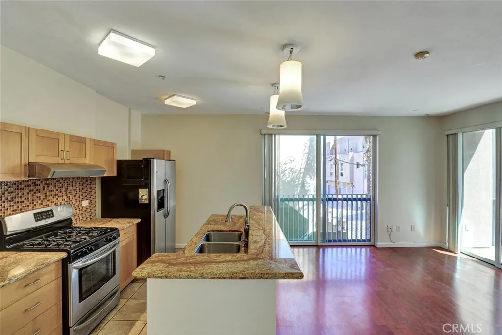 Welcome to this bright and inviting residence that blends modern style with everyday comfort. Step inside to find a thoughtfully designed kitchen, complete with granite countertops, rich wood cabinetry, a colorful mosaic backsplash, and stainless-steel appliances. The gas range makes cooking a joy, while the large island with dual sinks and bar seating offers the perfect place for casual meals or entertaining friends. Just beyond the kitchen, sliding glass doors lead to a private balconyan ideal retreat for morning coffee or evening relaxation. Upstairs, youll find two comfortable bedrooms and a full bathroom, with a skylight at the top of the stairs filling the space with natural light. Each room provides a welcoming atmosphere, making it easy to settle in and feel at home. For added convenience, this unit includes a washer and dryer combo and a private one-car garage, giving you both storage and secure parking. With its smart layout, modern finishes, and touches of charm, this home is perfect for those seeking comfort, function, and style all in one.
