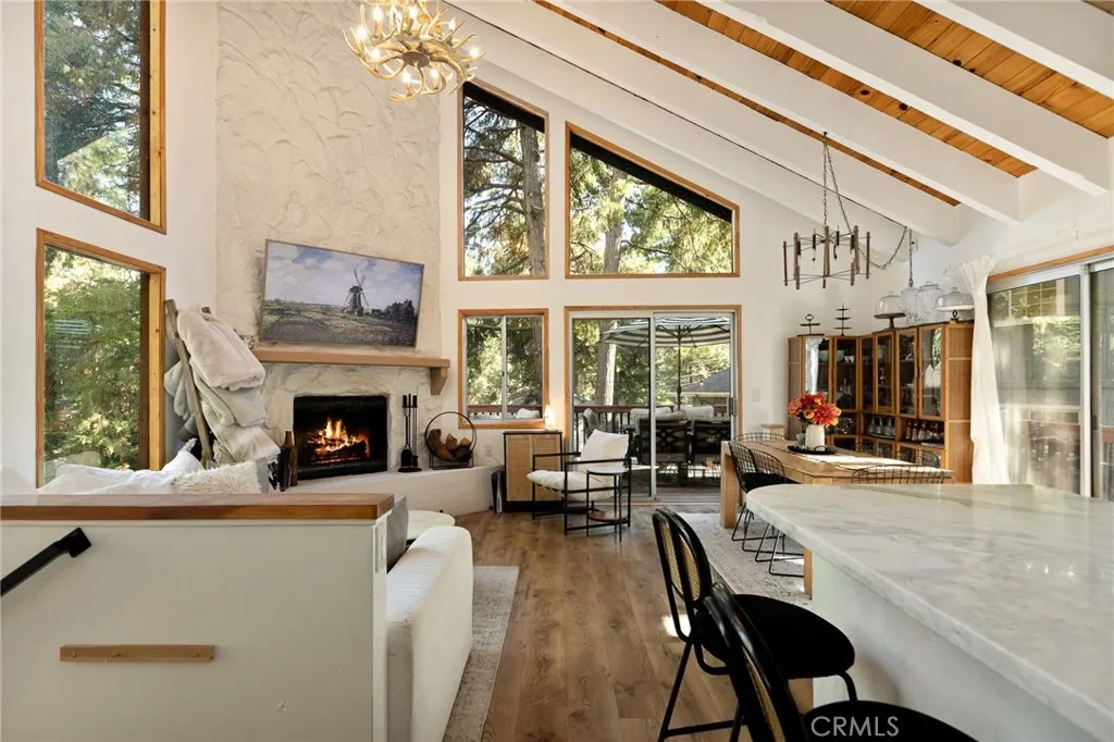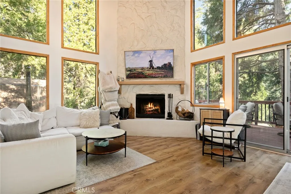 Windows! Windows! Windows! Welcome to 31353 Overhill, an exquisite, fully renovated 3-BR, 2-BA pristine modern mountain retreat with a detached fully finished shed in the heart of Running Springs. Flooded with an abundance of natural light, this home features vaulted ceilings, expansive windows, and a cozy gas/wood-burning fireplace. Enjoy mountain living year-round from the expansive private deck. The dream kitchen boasts stainless steel appliances, farmhouse sink, new cabinets, open shelving, beautiful one of a kind Quartzite countertops, and a breakfast bar, flowing seamlessly into the dining and living areas. The main floor primary suite offers a walk-in closet, walk-in shower and a separate bathtub, while the lower level provides versatile space with 2 bedrooms, a full bath and a dry heat sauna. The partially fenced yard and plenty of on-site parking add convenience. Just minutes from Lake Arrowhead, Big Bear, Snow Valley Ski Resort, and hiking trails, this turnkey property is perfect as a full-time home, vacation escape, or rental investment. Enjoy the quaint town of Running Springs with its markets, restaurants, shops, post office and library. Quick access to 330 for an easy commute. Schedule your showing today and experience mountain living at its best!