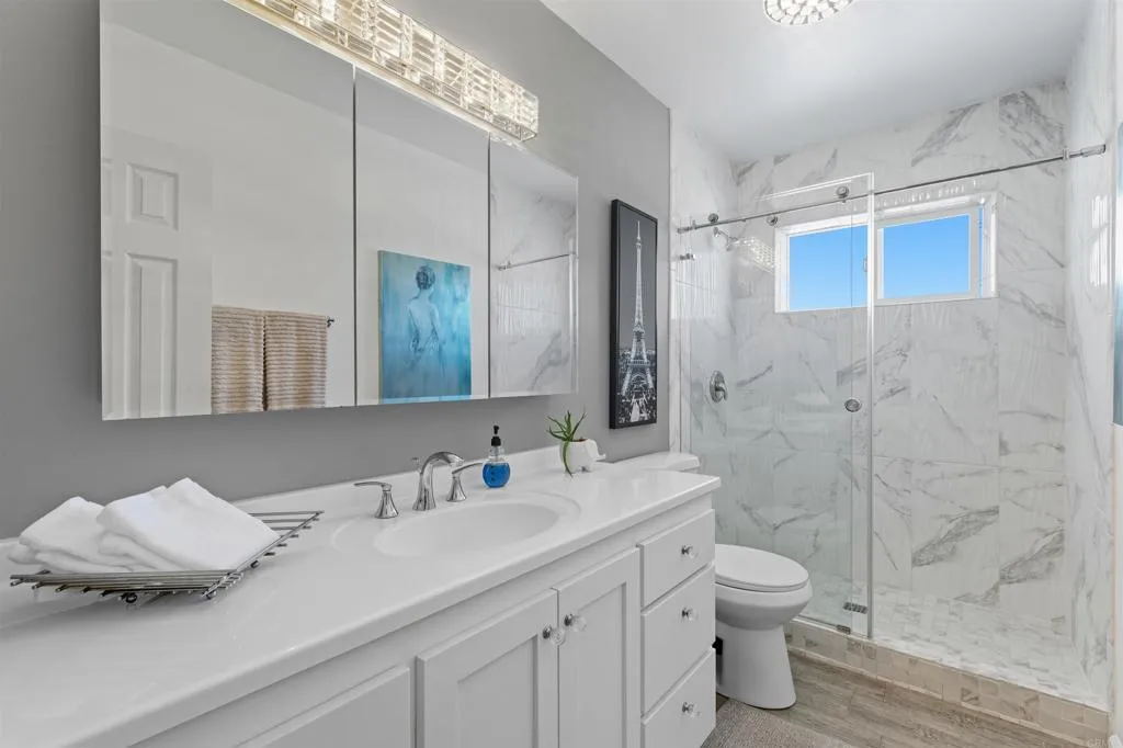 WOW!!! You have to see this one in person!! Beautifully remodeled top to bottom. Step into a space that seems like it's out of a magazine! Huge open concept kitchen/dining/living. New dual pane windows bring in amazing light, reflecting the beautifully maintained garden oasis courtyard. Melodic sound from water feature. New plumbing & electric.HUGE island with lots of storage, easily seats 6. Beautiful cabinetry with pull outs, quartz countertops, wood design tile flooring throughout, except bedrooms. Carpet is new. Mini splits in LR & Bedrooms, stackable washer/dryer in hall, brand new dishwasher. Abundant light, glass front door, security screen door. Sits at end of walkway offering total privacy. Gorgeous courtyard with sitting area, water feature and beautiful landscaping. 1 block off of El Cajon Blvd. Total North Park vibe without the traffic. HOA pays water/trash. Very quiet, fantastic neighborhood. Close to all you need walking or driving. Must see in person, photos do not reveal the charm and warmth of this unit or courtyard. Lowest HOA fees in North Park! Building has new electric panel box. Beautifully maintained building. Onsite laundry room as well. Additional storage north side of bldg. Owners may put storage/shed, all secure. 1 dedicated parking spot, in front. Additional storage in rear of building.