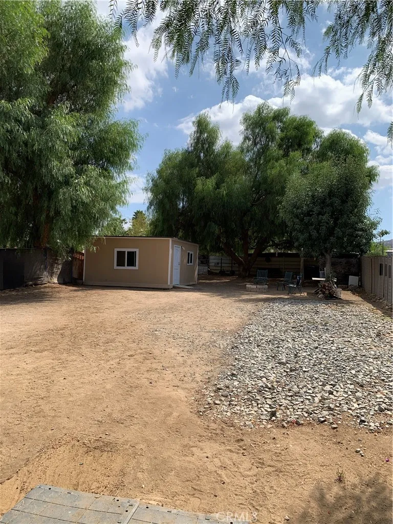 Welcome to this beautiful and cozy home on a spacious lot in Perris! The home includes 2 bedrooms (including a main bedroom with walk-in closet), Office room, Can be easy convert to a third bedroom. Large living room, an attached storage room, an expansive raised side patio, Newer Roof, On a permanent foundation. multi-purpose detached structure (approx. 250 sq. ft.) with utilitiesideal for a workshop, studio, or storage. Featuring a long driveway with plenty of parking, this property is fully fenced, private, and perfect for hosting parties or simply enjoying the great outdoors. Inside, youll find an inviting open floor plan with hardwood-style flooring, a large kitchen with ample counter space, and Large bathrooms. Nestled near scenic hills with stunning views, this location is ideal for outdoor enthusiasts. Enjoy dirt biking, ATV off-roading, horseback riding, and easy access to the lake for recreation. A new marketplace and shopping center is also being developed just minutes away, adding extra convenience. The property is great for gardening and already features fruit trees, including lemon, orange, avocado, plum, and pomegranate. Its located in a peaceful, safe neighborhood with friendly neighborsmaking it a true sanctuary and a wonderful place for a family.