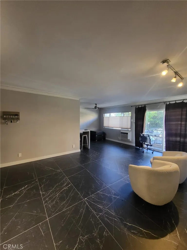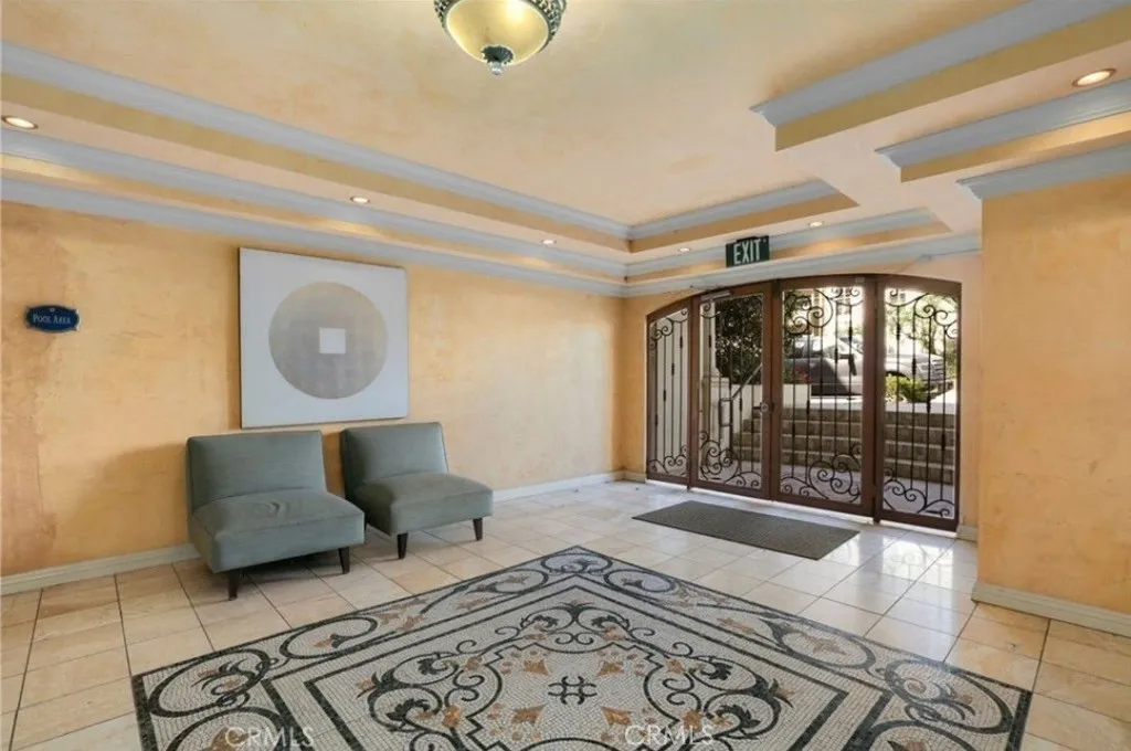 Modern, move-in ready 1BD/1BA with balcony in gated Brentwood Villas. Sunlit, north-facing, single-level home features an open living/dining area finished in oversized marble-look porcelain tile, crown molding, recessed/track lighting, and a ceiling fan. Designer kitchen with white quartz counters and a waterfall peninsula for stool seating; full-height travertine backsplash; custom dark cabinetry with glass uppers; matte-black faucet; double-bowl sink; pantry/utility niche; and a stainless appliance suite including a 5-burner gas range with chimney hood and dishwasher. The spacious bedroom offers bamboo flooring, a ceiling fan, and a walk-in closet with built-ins. Updated bath showcases a floating vanity with LED mirror, stone mosaic tile, and a tub/shower with glass enclosure. In-unit stacked laundry behind louvered doors. Private balcony overlooks a tree-lined streetperfect for morning coffee. Community amenities include a pool, dry sauna, renovated fitness center (2020), secure lobby with elevator, and gated entry; HOA includes earthquake insurance. One assigned gated parking space. Additional highlights: a true cooks kitchen with long prep runs and abundant cabinet storagethe peninsula doubles as a breakfast bar and serving counter. Expansive approx. 23-ft living room accommodates a full dining set plus a work-from-home nook; wide windows and smooth ceilings amplify light and volume. The bedroom fits a king bed with nightstands; the closet provides generous hanging and shelving. Practical upgrades include modern hardware and ceiling fans in both rooms. Exceptional loca