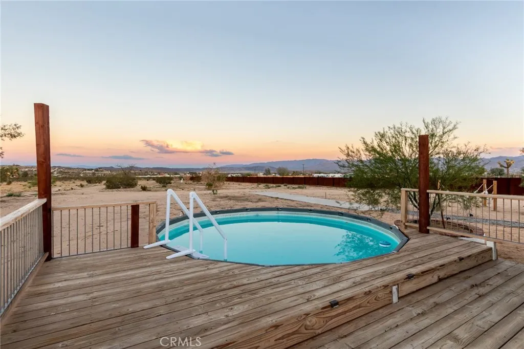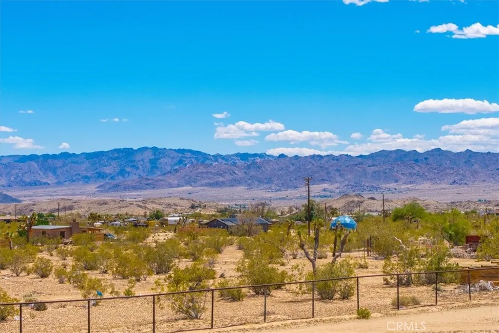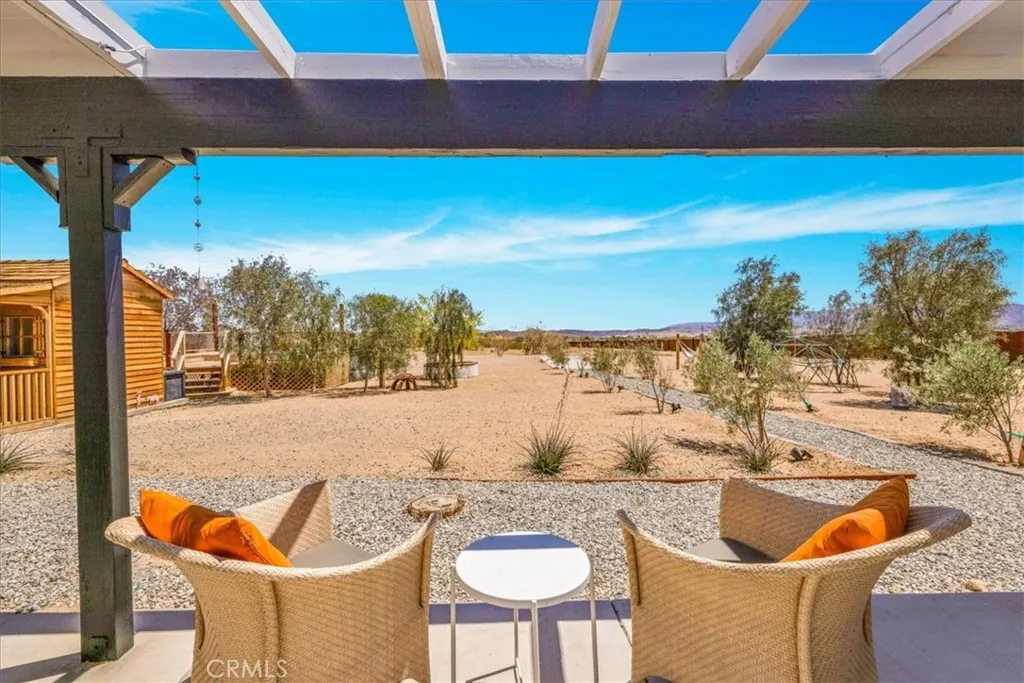 This FULLY FURNISHED 3-bedroom, 2-bath rustic-modern compound rests on 3.51 acres in scenic Joshua Tree. Set on the mesa and fully fenced for privacy, the property offers sweeping views of the surrounding hills and mountains along with a tranquil desert atmosphere. Thoughtfully renovated, the home features polished concrete floors, white wood-paneled walls, skylights, and sliding glass doors in the bedrooms that fill the interiors with natural light. The open-concept kitchen, ideal for entertaining, includes a large island, sleek black cabinetry and fixtures, granite countertops, and a tile backsplash. The adjoining living area with large slider overlooking the backyard is enhanced by vaulted ceilings and exposed beams. Both bathrooms have been stylishly updated with tiled walk-in showers and contemporary lighting. Comfort and efficiency are ensured with Mitsubishi mini splits, upgraded electrical, a new water heater, and full gutters. Outside, a generous covered patio invites relaxation and gatherings, accented with rattan light fixtures and black-and-white Aztec tile at the entry and steps. A detached cedar shed with a covered porch, dedicated power, vinyl flooring, extra fridge, and lighting offers versatile use as an art studio, office, or yoga space. The property also includes an RV electrical hookup, ample parking, and a Tuff Shed for added storage. The L-shaped lot features paved road frontage and a side gate off Shifting Sands Trailperfect for a potential second dwelling with private access. Outdoor highlights include two water meters, a pool with custom wood deckin