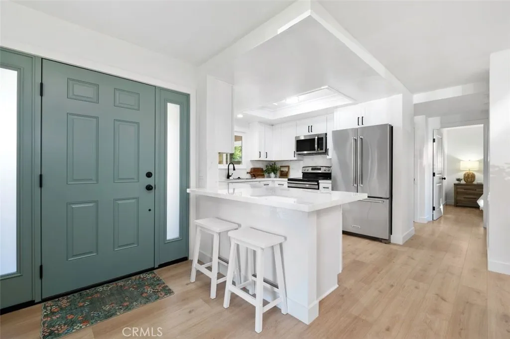 Beautifully Remodeled Light-Filled Villa Nova Single Level Living. Welcome to 3025 Calle Sonora #D, a rare single-story, single-level Villa Nova model in Laguna Woods. Perfectly positioned on a light-filled corner location surrounded by lush greenery, this home offers exceptional privacy while remaining conveniently close to Gate 7. Recently remodeledand never lived in since the remodelthis 2-bedroom, 2-bath residence combines comfort, elegance, and modern upgrades. With no stairs and direct access from the parking lot, it is handicap-friendly and easy to navigate. Step through an iron-gated entryway into a charming private courtyard, leading to a stylish new front door. Inside, youll be welcomed by a bright and airy floor plan featuring smooth ceilings, recessed lighting, fresh paint, luxury vinyl plank flooring, and double-pane windowsa perfect blend of style and functionality. The brand new open-concept kitchen is a true showpiece, boasting quartz countertops, custom soft-closing cabinetry, and top-of-the-line stainless steel appliances. Adjacent to the kitchen, the dining area and atrium invite in natural light and fresh air, enhancing the homes indoor-outdoor flow. The spacious primary bedroom features mirrored wardrobe doors and a generous closet, while both bathrooms have been beautifully upgraded with quartz-top vanities and designer-tiled showers. The secondary bedroom also offers mirrored closet doors, a large closet and abundant natural lightperfect for guests or a home office Additional highlights include: Private patio with extra storage closets One carport