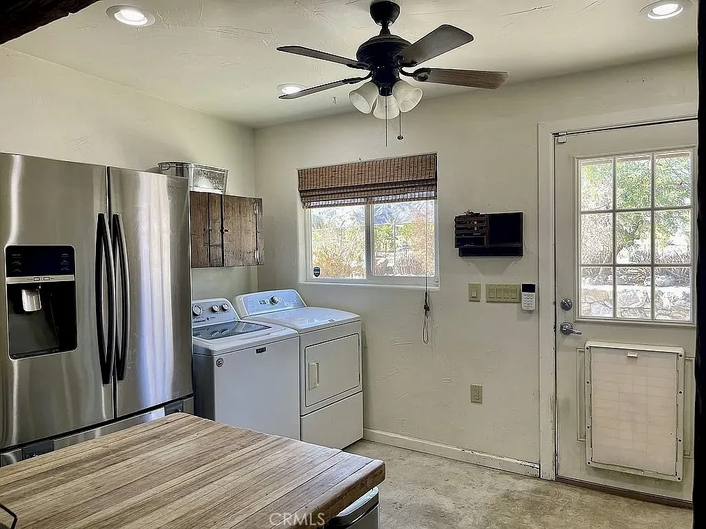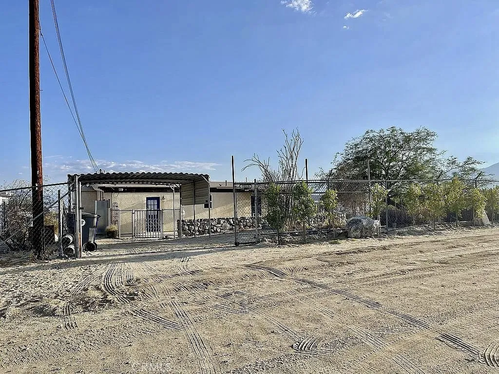 Escape the city and enjoy serene, private living on this gorgeous 2.5-acre property featuring 66-73 Medjool Date trees with room to plant many more. Zoned for agriculture and equestrian use, this secluded retreat offers spectacular mountain and desert vistas, perfect for appreciating stunning sunsets, sunrises, and starry nights in peace. The charming, furnished 4-bedroom, 1-bath Sky Valley home boasts a European kitchen with white and gray granite countertops, Old World cabinetry, and spacious dining area. The bathroom features a high vanity with a glass bowl sink and an open tile shower. The living room is warm and inviting, with French doors and a real wood-burning stove, complemented by a spacious 6 x 40 screened-in porch for outdoor relaxation. A fourth bedroom on the west side of the home provides additional flexibility. Outside, the property includes a trailer for a project ideal for guests, a caretaker, or in-law quarters as well as four sheds for storage. For entertainment and gatherings there is 20x40 concrete slab on the lower part of the property offers versatile space for additional projects or structures. The home is partially gated for privacy and features a covered carport, making it perfect for families, artists, musicians, or contractors seeking a peaceful rural lifestyle. This property offers a unique blend of natural beauty, functional living spaces, and agricultural potential, making it a truly special retreat in Sky Valley