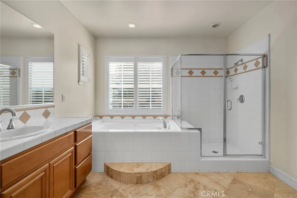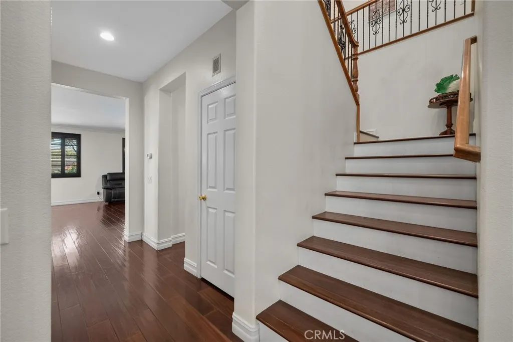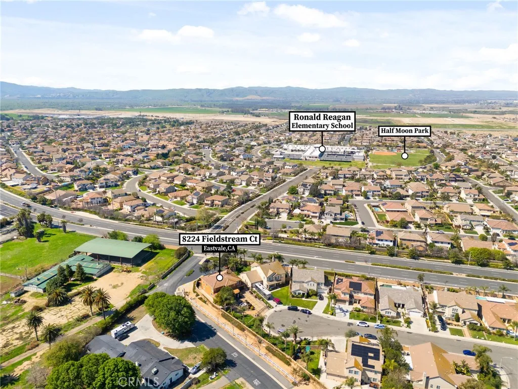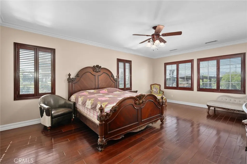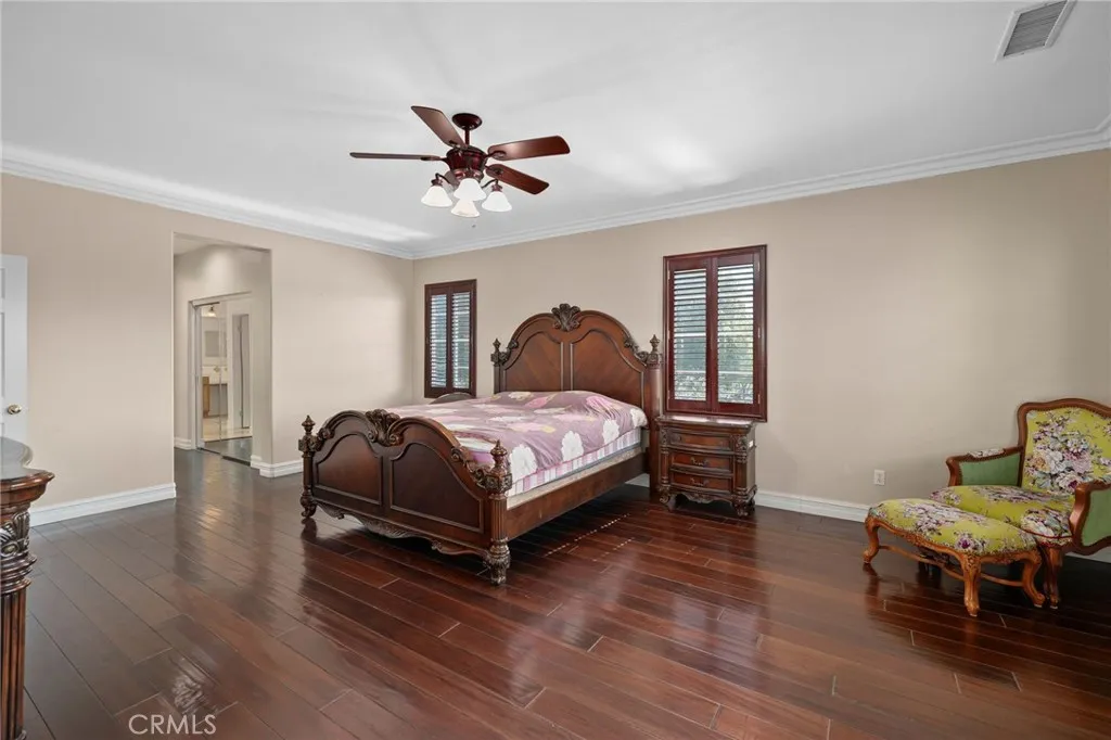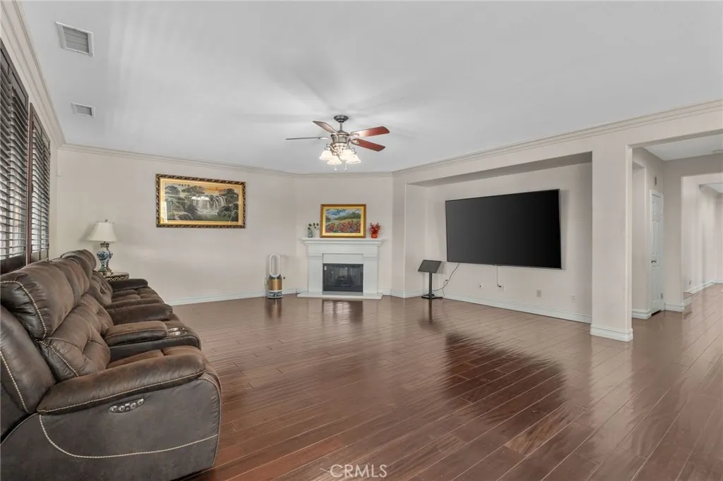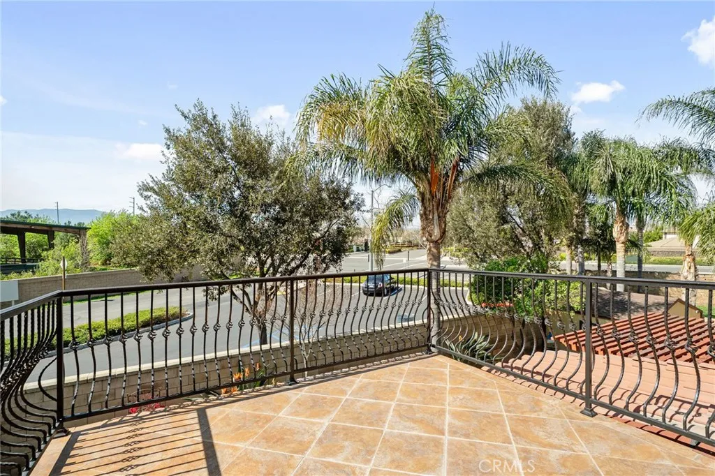 Welcome to this stunning, turnkey, one of a kind home located in the highly sought-after River Glen community of Eastvale. Situated on a spacious 13,068 sq. ft. lot at the end of a peaceful cul-de-sac, this well-maintained residence offers a blend of elegance, comfort, and practicality. With 5 bedrooms, a loft, and 4.5 bathrooms, this home is designed for family living and entertaining. The grand entrance features a circular driveway with a beautiful fountain, providing additional parking for over 8 cars alongside the 4-car garage, totaling over 12 parking spaces! The front yard is beautifully landscaped and securely gated with a combination of block and wrought iron fencing, creating a private oasis with stylish light fixtures and an automatic gate for added security. Relax and enjoy breathtaking views of the city lights and surrounding hills from the custom, oversized balcony and patio, perfect for outdoor gatherings. The backyard is designed for easy maintenance, featuring artificial grass, and offers ample space to build a pool, allowing you to customize your outdoor retreat. Inside, you'll find real wood flooring throughout, complemented by crown molding and plantation shutters on every window. The open-concept living areas are ideal for entertaining, while the spacious primary suite offers a relaxing sanctuary with a cozy sitting area, private balcony, a soaking tub and separate shower, and 2 separate, generous walk-in closets. The downstairs suite has its own en suite bathroom, separate from the guest bathroom. Additional highlights include a convenient upstairs laun