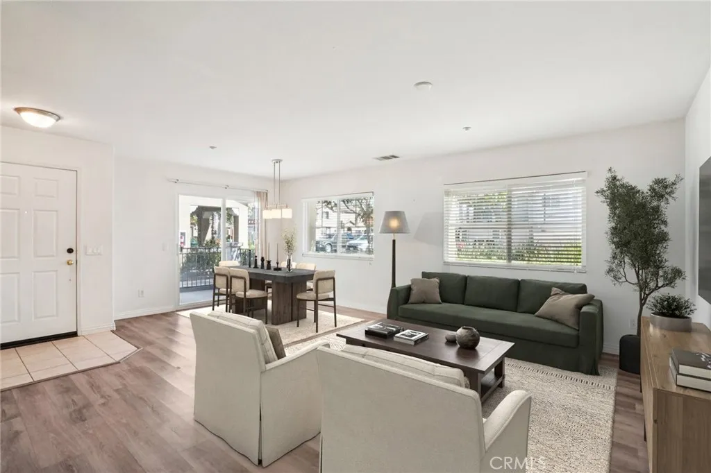 Welcome to this spacious residence in the sought-after Palacio De Oro community, offering comfort, convenience, and modern living. Go inside to find an inviting open-concept layout where the living, dining, and kitchen areas flow seamlessly togetherperfect for entertaining or everyday living. The home features laminate flooring, a main-level bedroom and full bathroom, plus a private gated front patio with direct access from the dining areaideal for outdoor dining or morning coffee. Upstairs, the huge primary suite impresses with a spacious walk-in closet and en suite bathroom with dual vanities, while an additional bedroom and bathroom provide plenty of space for family or guests. Enjoy the benefits of an attached 2-car garage, and take advantage of the communitys amenities including outdoor cooking and picnic areas surrounded by beautifully landscaped grounds. Conveniently located near markets, schools, and dining options, this home offers the perfect blend of style and practicality.
