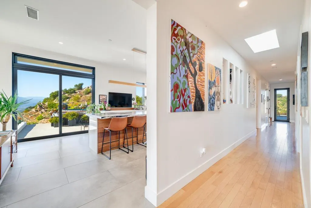 A rare architectural gemmodern, private, unforgettable. This striking dramatic home is in a breathtaking natural setting on nearly 12 acres with panoramic views of the valley and thousands of acres of Cleveland National Forest. Inside, 11- and 12-foot ceilings, skylights, and architectural windows fill the space with light and style. Rich wood floors and a massive island kitchen with both granite and quartz counters make it ideal for entertaining. The sunken living room centers around a fireplace and showcases spectacular views of hawks in flight and endless mountains. The primary suite is its own retreatseparate wing, walk-in closet with built-ins, window niches, coffee station, and a spa-like bath with a soaking tub. Outside, stone paths lead to more views. The private pool surrounded by endless viewslike living in your own nature preserve. Paid for solar and whole house generator. No other home in Ramona offers this level of modern design in such a serene setting. Its truly a showstopper.