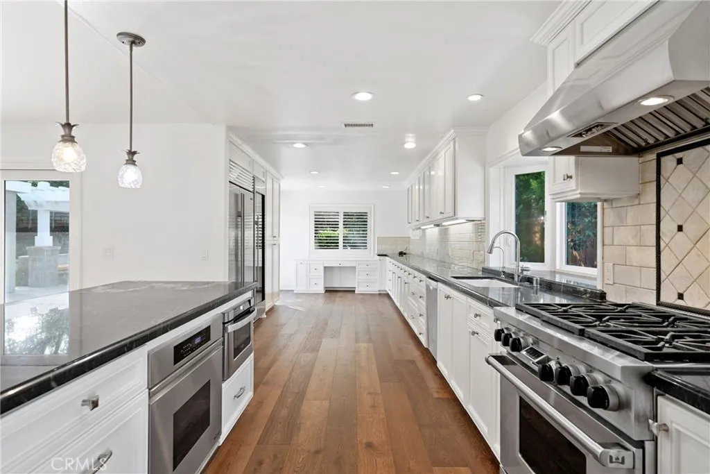 Entering past a lovely ornamental pear tree, youll walk on brand new hardwood floors into the spacious gourmet kitchen: Wolf range and oven, Sub-Zero fridge, full size Sub-Zero wine fridge, Bosch dishwasher, and a Dacor second oven. Granite countertops span nearly 20 feet, extending to a built-in computer station with another sliding door opening to the backyard. Great flow for entertaining. Custom pineapple motif lighting and accents, and dark wood floors extending throughout the home, evoke a subtle luxury tropical ambiance for entertaining with Ohana. Stepping through the living room, with vaulted ceiling and fireplace, the courtyard offers mature fruit trees, and a covered dining/lounging area complete with a custom Italian pizza oven, fireplace, built-in gas BBQ with concrete counters, and dedicated Holiday electrical outlets. The primary suite has been enlarged, featuring an oversized walk-in closet, custom cabinetry, soaking tub, walk-in shower with two shower heads, and a sliding glass door that opens directly to the private backyard. The three car garage has custom cabinets and storage (including a kayak/SUP rack and overhead luggage racks), work bench, Epoxy flooring, and one of the garage bays has been converted to carpeted workout room with AC, and could also be a playroom area or office. Also: recently installed HVAC, new roof, updated plumbing and tankless hot water heater, updated electrical panel, dedicated 220V outlet for electric vehicles, and an enclosed laundry room. Neighborhood: a private community pool and hot tub with BBQ, a private playground and ba