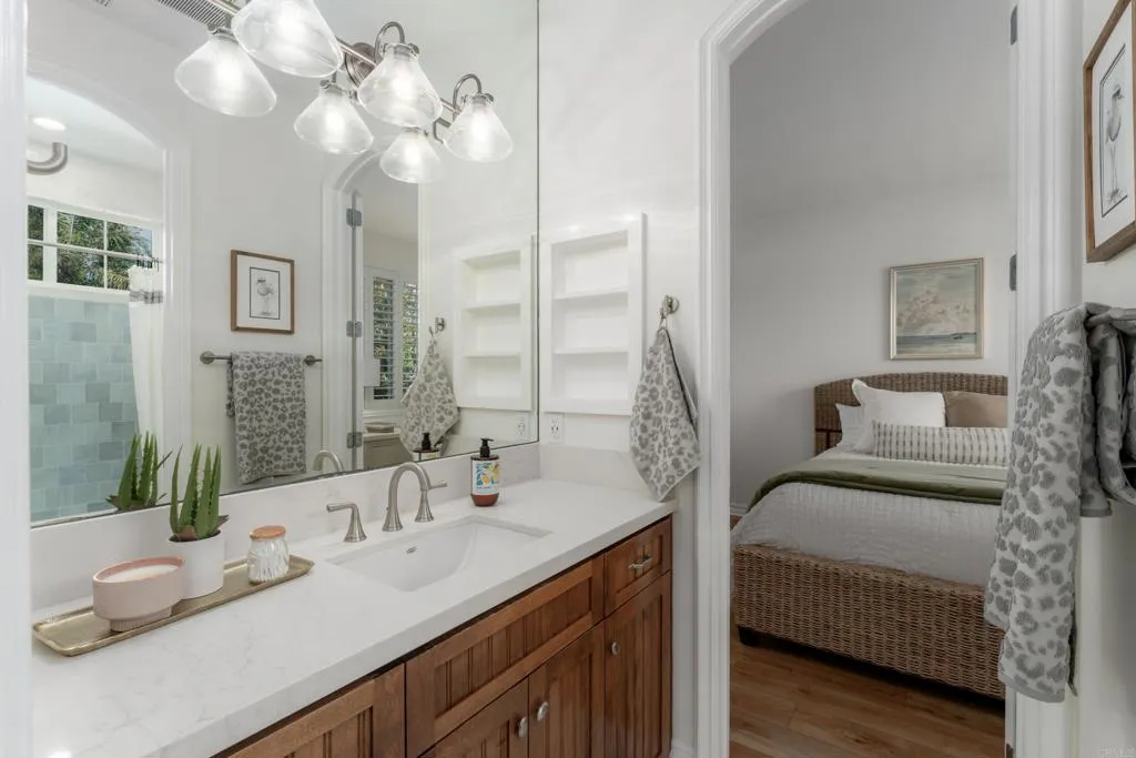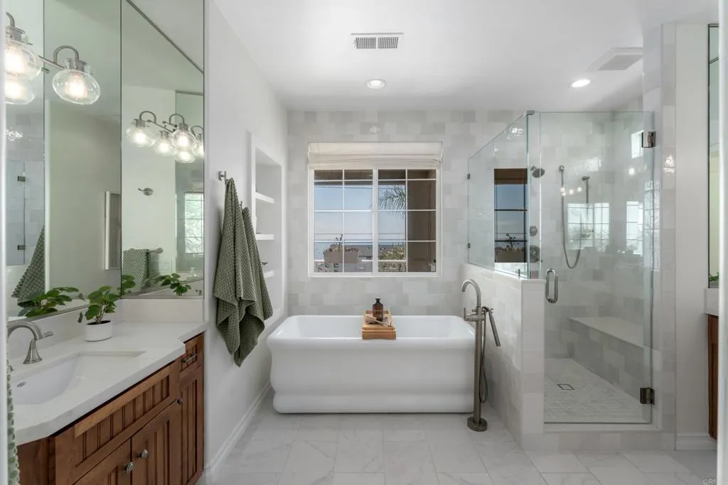 Welcome to coastal luxury living on Neptune, Encinitas most coveted oceanfront street. From the moment you enter, youre swept away by an expansive open floor plan perfectly framed by breathtaking sit-down ocean views. High ceilings with coffered details, wide-plank luxury flooring, custom built-ins, and a staircase wrapped in rich wood detail set an elevated tone, while walls of west-facing glass sliders invite the ocean into your living space-a true blend of elegance and laid-back coastal living. At the heart of the home is the great room with endless ocean viewsa gathering space where cooking, dining, watching TV, or simply relaxing all unfold with the Pacific as your backdrop. The remodeled kitchen is a showpiece, boasting a farmhouse sink, oversized island with prep sink, stylish custom cabinetry, 6-burner gas range with hood, warming drawer, wine fridge, dcor refrigerator, and quartz countertops. Extensively renovated, this home features smooth wall finishes, recessed lighting, shutters, newer AC, surround sound, and luxury flooring throughoutperfect for sandy toes. A main-level junior suite with its own fireplace and full bath provides flexibility for a guest retreat, office, or first-floor primary option. Upstairs, the ocean-view primary suite is a true sanctuary with a private lanai, spacious walk-in closet, and a remodeled spa-like bath. The centerpiece is a soaking tub with panoramic ocean views, complemented by dual sinks and a walk-in shower with bench. Two additional bedrooms share a Jack & Jill bath, while the upstairs laundry room with sink and cabinetry adds
