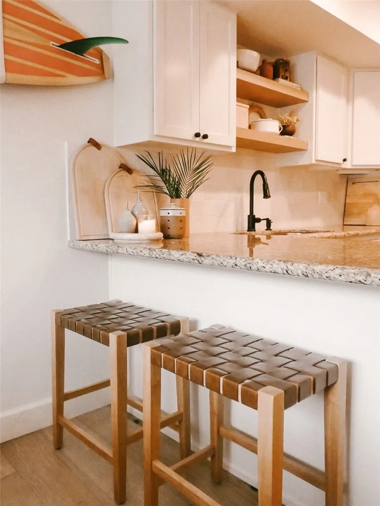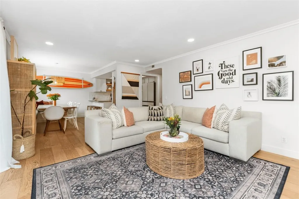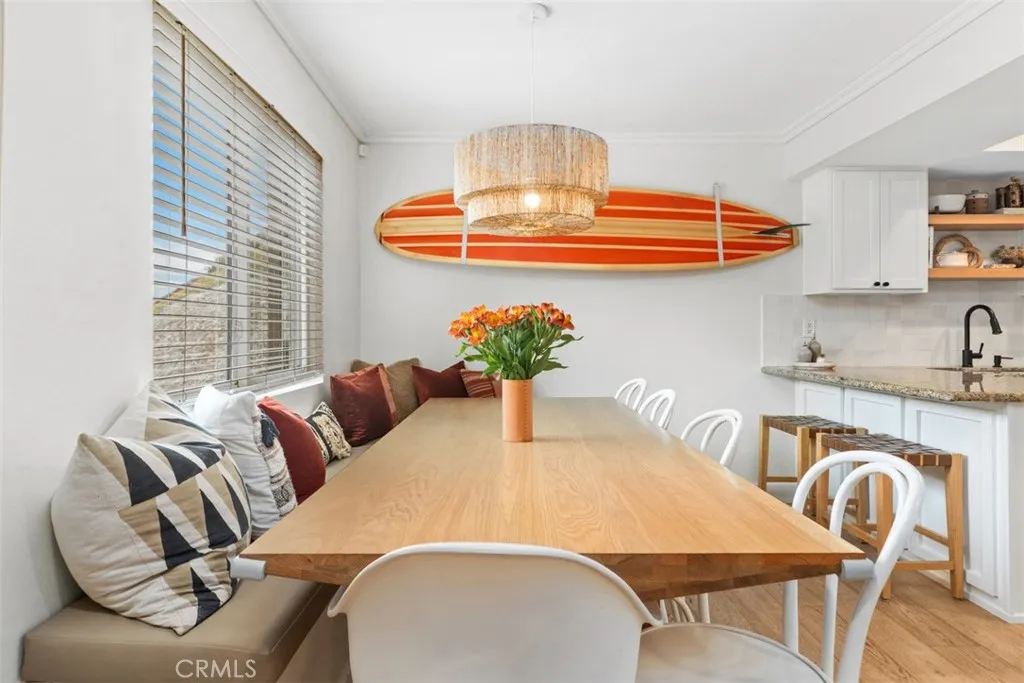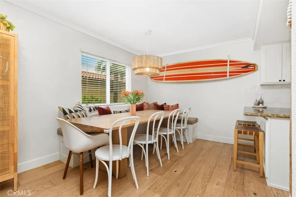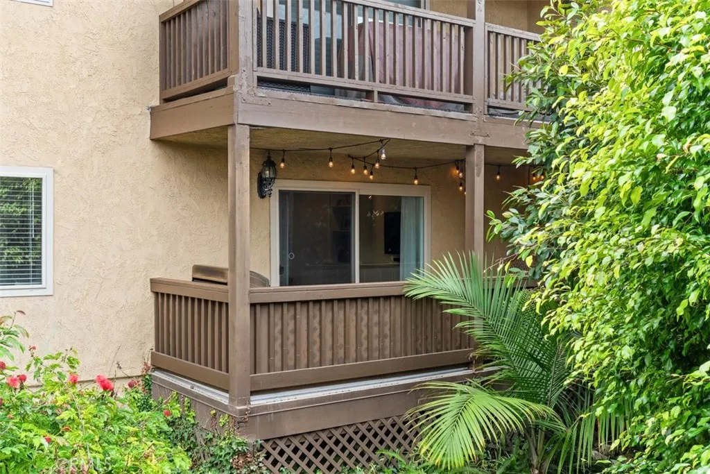 214 Via Robina #5 presents a stylishly renovated condo in the hills of San Clemente with inviting indoor spaces and relaxing views from the upgraded floating floor deck. Two bedrooms, two bathrooms and one car garage located on large cul-de-sac. The showpiece kitchen features modern Shaker cabinetry with CB2 matte black hardware, a handmade Zellige Moroccan tile backsplash with tight grout lines for sheer beauty, and granite countertops with a deep double sink. A suite of Samsung Bespoke matte black appliances, accented with white glass fronts, includes a five-burner gas range with oven, coordinating refrigerator, microwave and dishwasher. A raised ceiling with recessed lighting and an adjacent built-in banquette with custom cushions create a warm, functional dining space ideal for gatherings of up to 1012. Both bathrooms have been elevated with designer mirrors, the primary featuring timeless marble flooring and the hall bathroom showcasing large-format porcelain floors and custom shelving. Throughout the home, brushed European oak engineered wood floors, finished with polyurethane for durability and beauty, add richness. Additional details include 4-inch crown molding, six-panel doors, and textured cut-pile carpet in the bedrooms. Each bedroom also offers a matte black ceiling fan for style and comfort. Other highlights include a central heater (installed 2016), dual-pane windows, custom built-in Shaker-style entertainment cabinetry in the living room, and a full-size stacked washer/dryer. For leasure enjoy the HOA common area garden for residents and common area patio wi