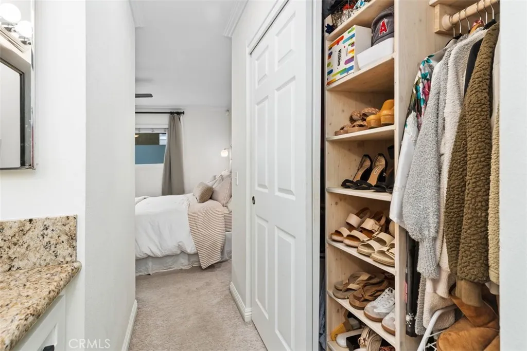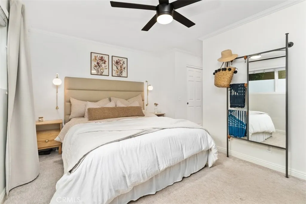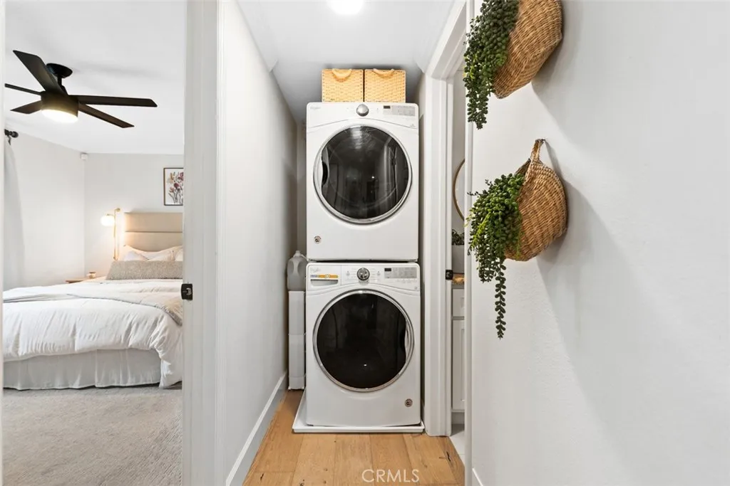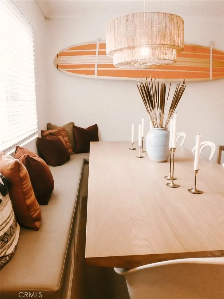 214 Via Robina #5 presents a stylishly renovated condo in the hills of San Clemente with inviting indoor spaces and relaxing views from the upgraded floating floor deck. Two bedrooms, two bathrooms and one car garage located on large cul-de-sac. The showpiece kitchen features modern Shaker cabinetry with CB2 matte black hardware, a handmade Zellige Moroccan tile backsplash with tight grout lines for sheer beauty, and granite countertops with a deep double sink. A suite of Samsung Bespoke matte black appliances, accented with white glass fronts, includes a five-burner gas range with oven, coordinating refrigerator, microwave and dishwasher. A raised ceiling with recessed lighting and an adjacent built-in banquette with custom cushions create a warm, functional dining space ideal for gatherings of up to 1012. Both bathrooms have been elevated with designer mirrors, the primary featuring timeless marble flooring and the hall bathroom showcasing large-format porcelain floors and custom shelving. Throughout the home, brushed European oak engineered wood floors, finished with polyurethane for durability and beauty, add richness. Additional details include 4-inch crown molding, six-panel doors, and textured cut-pile carpet in the bedrooms. Each bedroom also offers a matte black ceiling fan for style and comfort. Other highlights include a central heater (installed 2016), dual-pane windows, custom built-in Shaker-style entertainment cabinetry in the living room, and a full-size stacked washer/dryer. For leasure enjoy the HOA common area garden for residents and common area patio wi