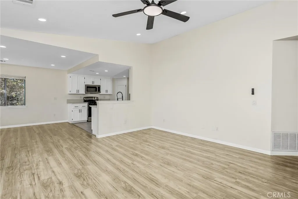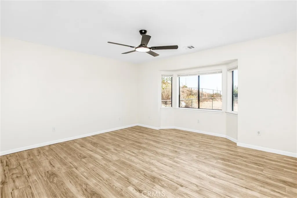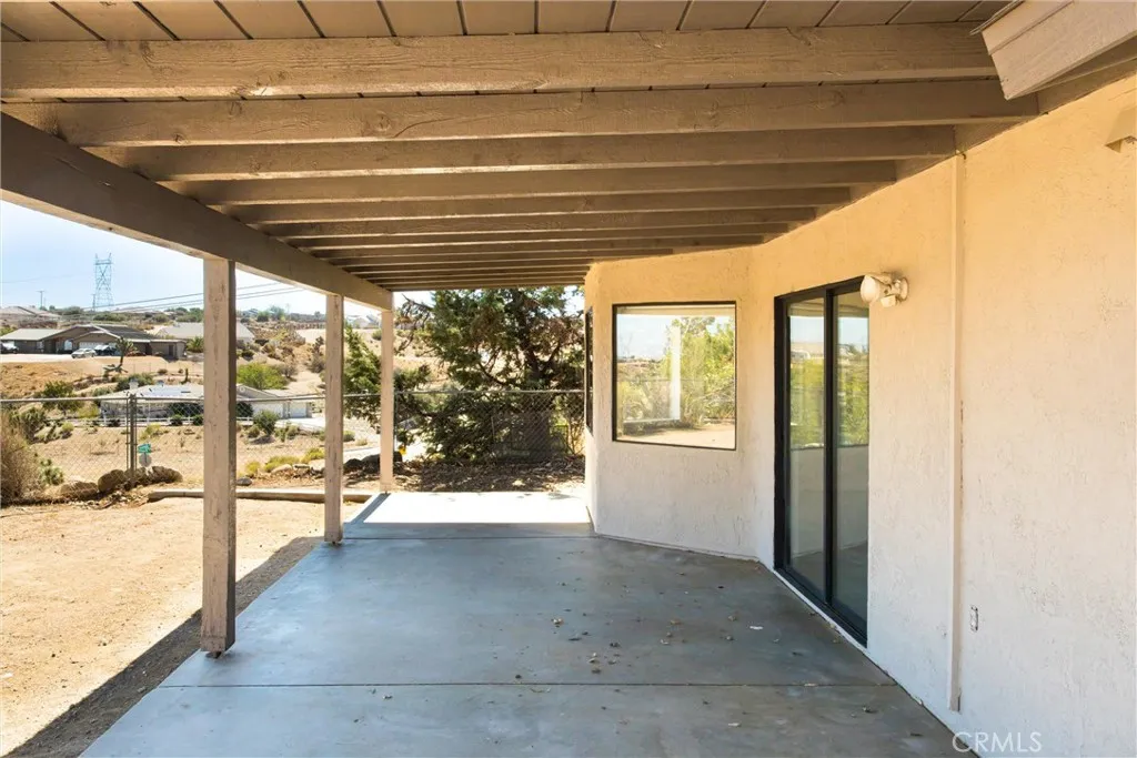 Updated 3-bedroom, 2-bathroom home with attached 2-bedroom, 1-bath ADU on 1.07 acres with hillside and desert views. The main home features laminate wood flooring, recessed lighting, and a remodeled granite kitchen with stainless steel appliances, walk-in pantry, and breakfast nook open to the family room. Family room offers recessed lighting, wood-burning fireplace, and sliding door access to the rear covered patio and fenced yard. Primary suite includes a large walk-in closet, ceiling fan, and remodeled bath with dual granite vanities, tiled walk-in shower, soaking tub, and skylight. Two additional bedrooms feature ceiling fans and share a full bath with granite vanity and shower/tub combo. Attached ADU (converted garage) includes its own separate entrance, kitchen area with sink, spacious living area, two bedrooms with ceiling fans, full bath with tiled walk-in shower, and laundry hookups. The property is fully fenced with a covered front carport, usable lower area with chicken coop, and plenty of open space for future use. Conveniently located with beautiful natural views, this home offers versatile living and move-in-ready updates.
