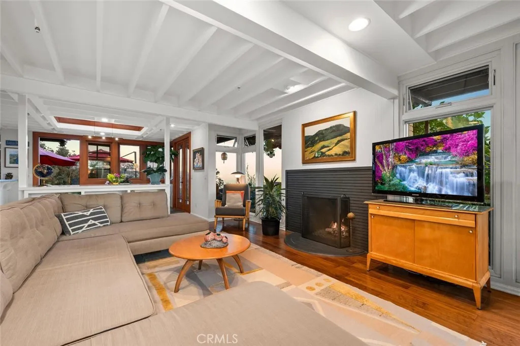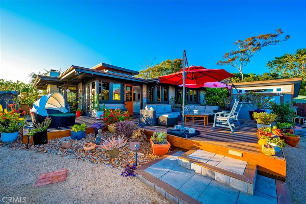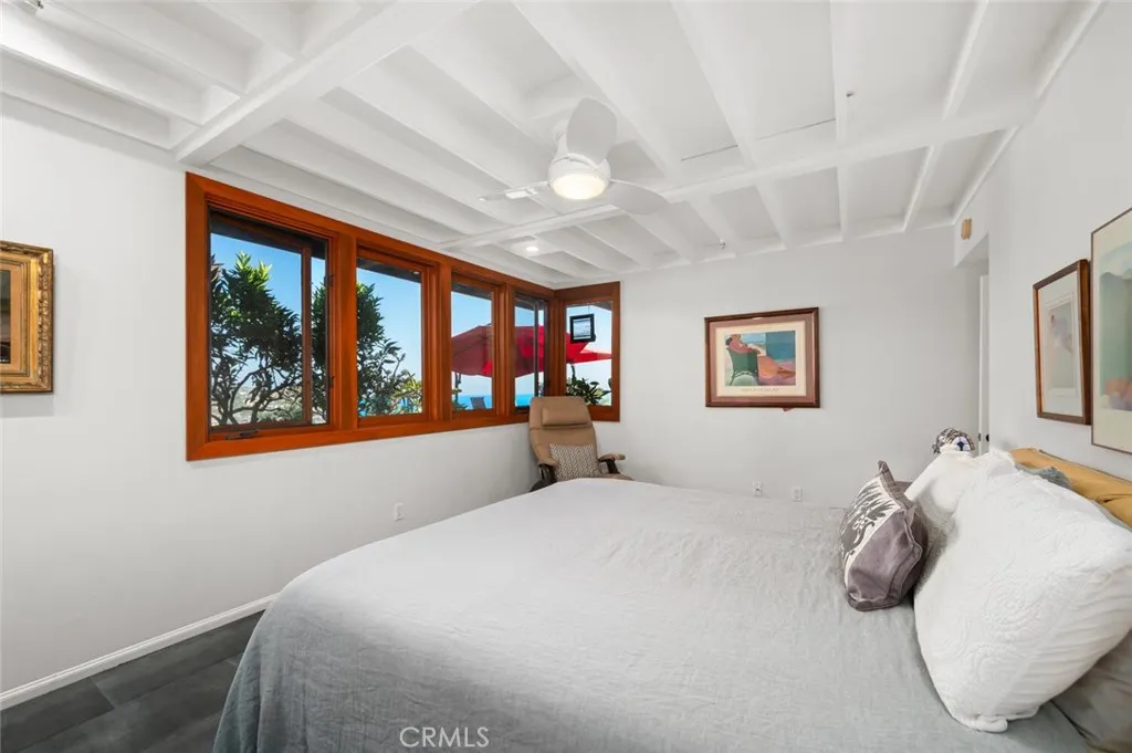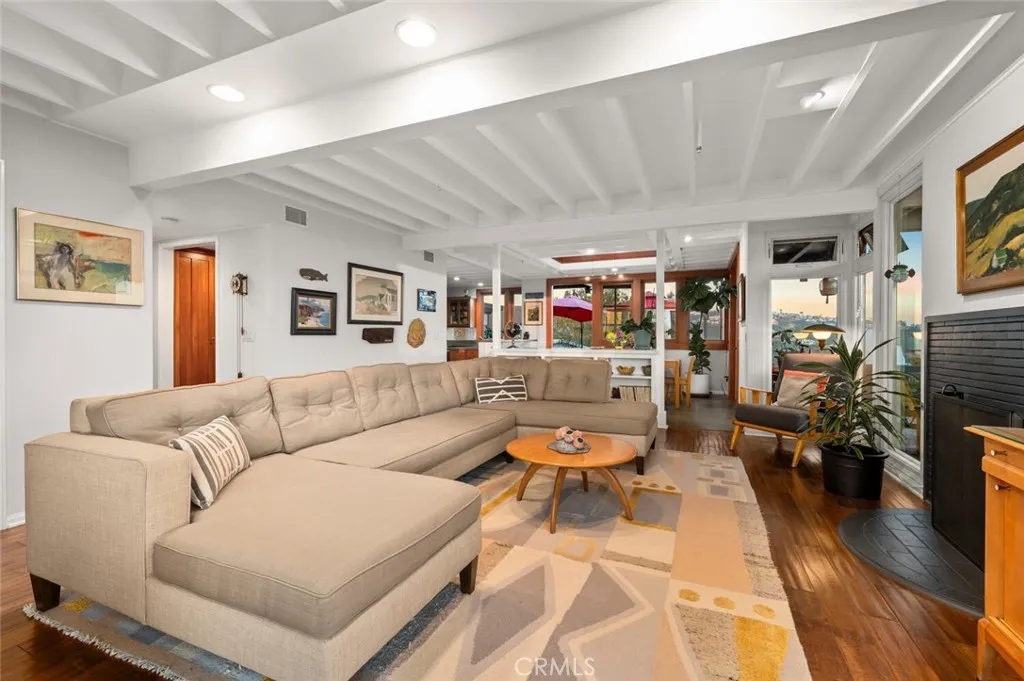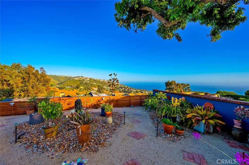 Perched above the pristine coves of laguna beach, this mid century modern masterpiece echoes the timeless influence of early Frank Loyd Wright design. With iconic post-and-beam construction and dramatic walls of glass, the home is thoughtfully positioned to capture sweeping ocean and canyon vistas from every angle. This single level, two bedroom two bath retreat has been beautifully remodeled to blend classic architecture with modern comforts. New floor to ceiling windows and elevated skylights flood the space with natural light, while lush landscaping and panoramic views create a seamless indoor outdoor living experience. Set on nearly 10,000 square feet of flat, useable land, the home offers privacy, serenity, and room to grow-complete with architectural plans included in the sale and potential for an ADU. Inside, a chef's ocean view kitchen flows effortlessly into the open plan living and dining rooms, grounded by rich wood flooring, and elegant stone surfaces throughout. Step outside onto the expansive wrap around deck, where a gentle breeze and post card worthy sunsets await. Cozy up by the wood burning fireplace as day turns into night and the coastline begins to glow. Whether you're seeking a peaceful retreat, an entertainer's dream, or a foundation for future expansion, this one of a kind architectural jewel delivers it all.