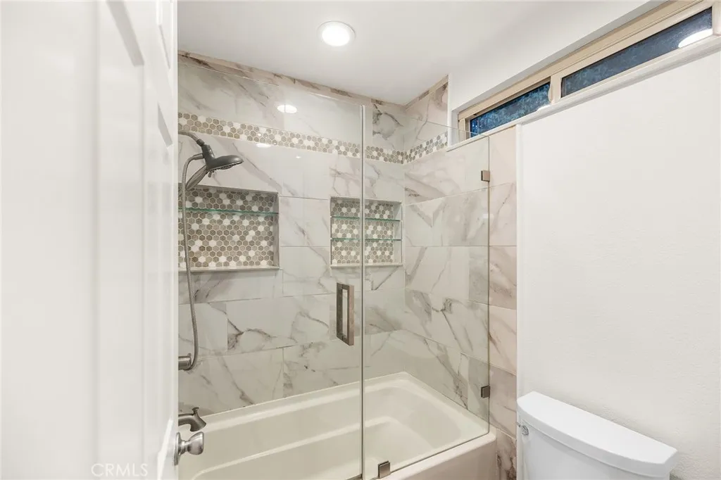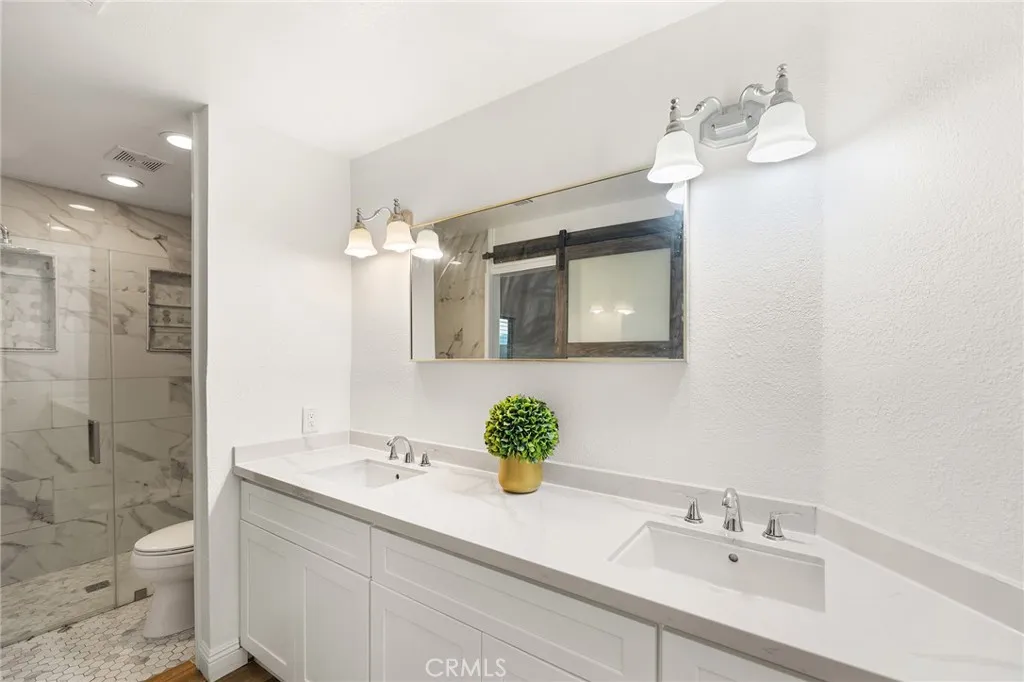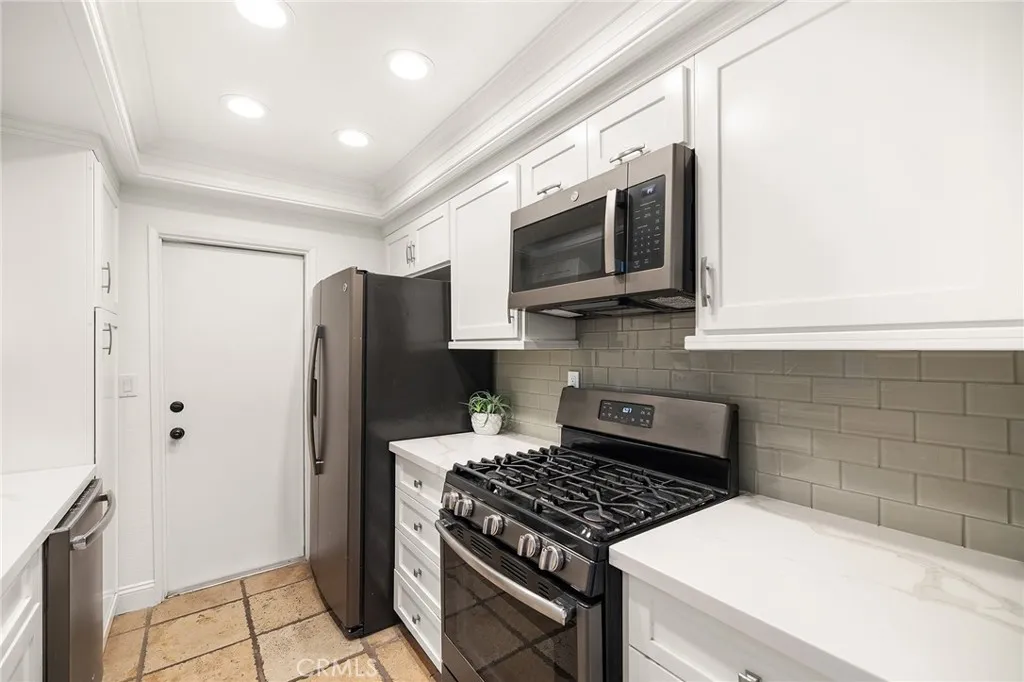 Welcome to this beautifully upgraded two-bedroom, two-bath condo offering modern style, comfort, and convenience. Freshly painted throughout, this home features a bright and inviting interior with timeless finishes. The kitchen has been updated with classic white shaker cabinets, sleek quartz countertops with subway tile backsplash, stainless steel appliances (including a brand-new microwave), perfect for everyday cooking and entertaining. Flooring is a stylish mix of tumbled travertine and faux-wood ceramic tile, combining durability with warmth and charm. The open-concept living area flows seamlessly, creating a comfortable space to relax or host guests. Both bedrooms (1 upstairs and 1 downstairs) offer custom sliding barn style closet doors and are both generously sized, while the two bathrooms offer updated touches for a more modern feel. Additional highlights include a one-car attached garage with direct access for convenience and security. Ideally located, this property is a commuters dream with easy access to Orange County and Los Angeles County, while still providing a peaceful neighborhood atmosphere. Dont miss this turnkey condo that blends thoughtful upgrades with an unbeatable location!