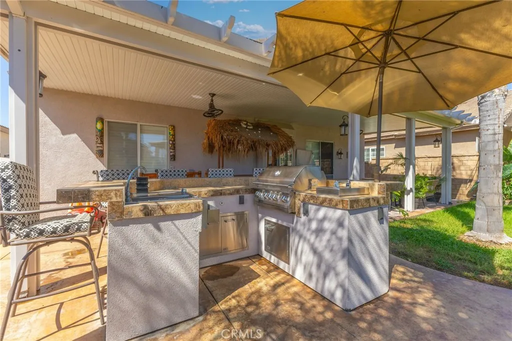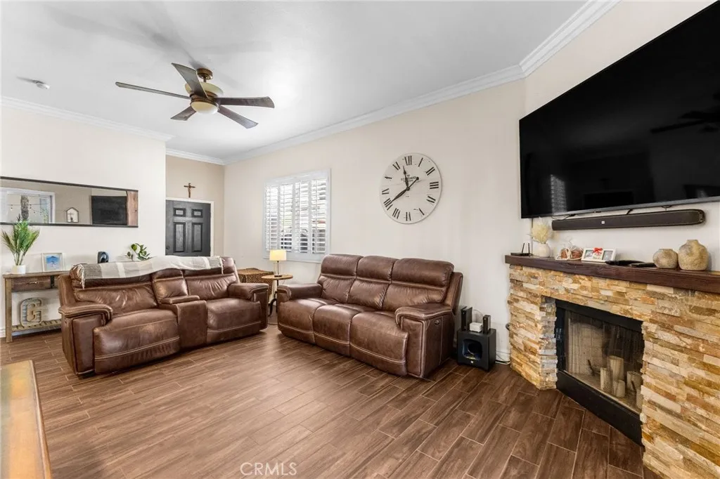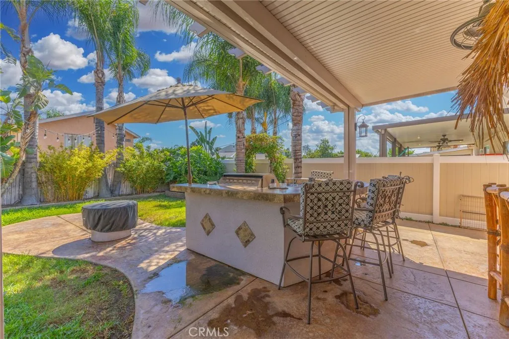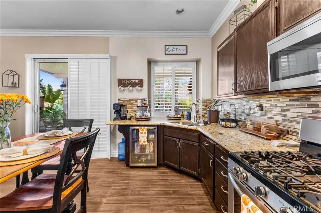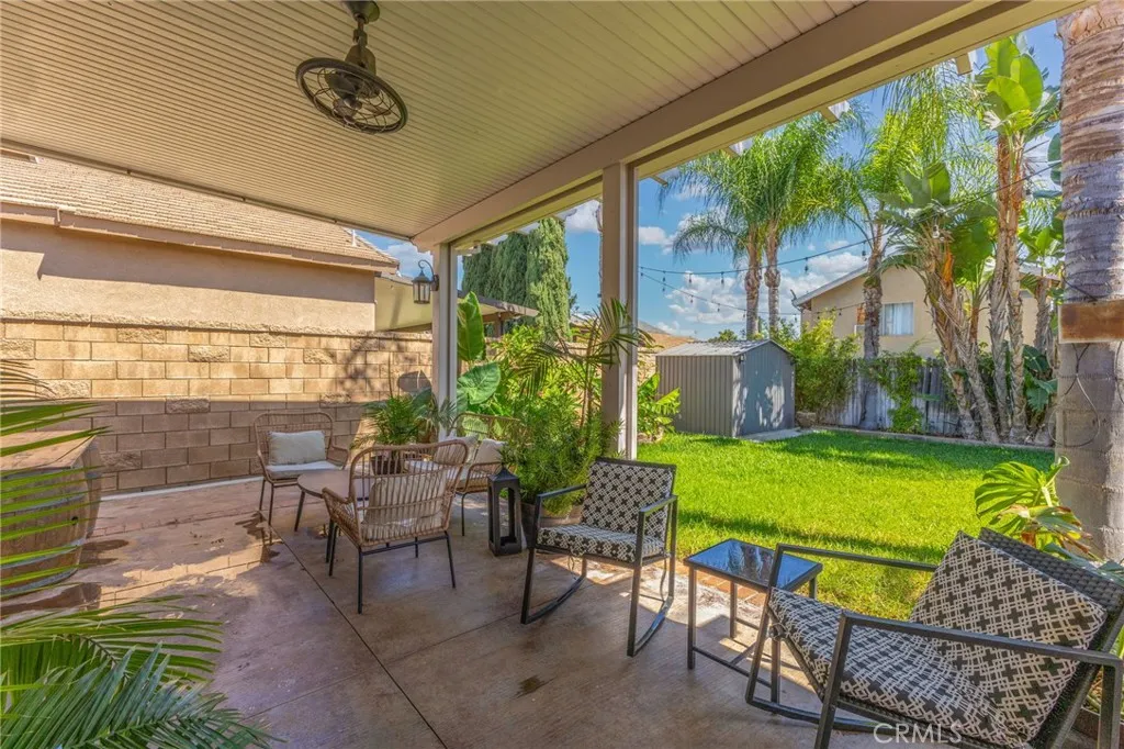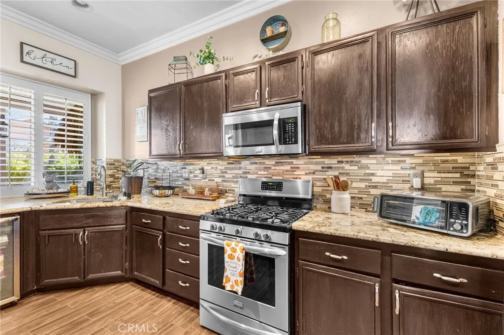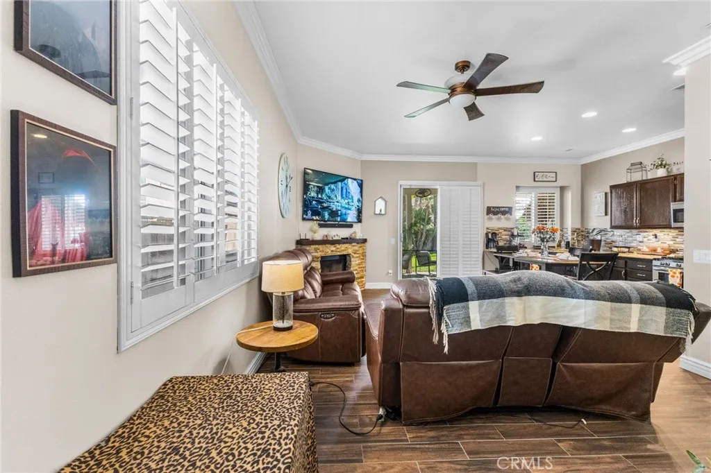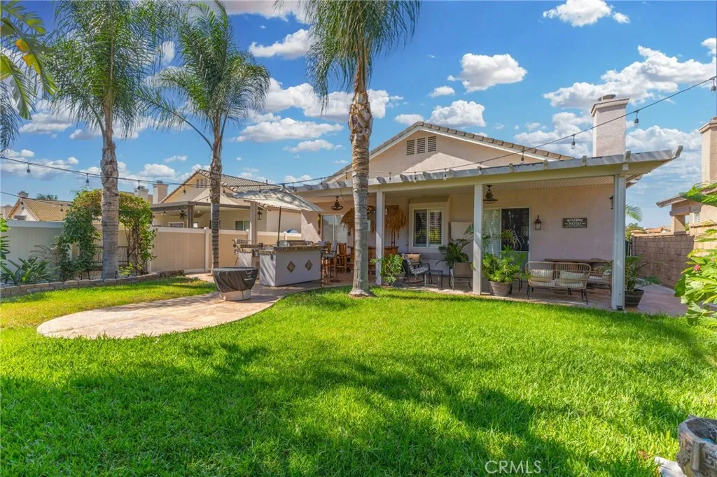 Elegance is defined from the moment you enter, where classic crown molding accents the inviting open-concept living area, drawing your eye toward the cozy gas fireplace and charming white wood window shutters. This sense of refined style flows seamlessly into the kitchen, a space designed to impress with its beautiful cabinetry, premium countertops, and stylish backsplash, all set upon a foundation of rich, chocolate-brown tile flooring. Thoughtful design extends to the conveniently tucked-away laundry area. Step outside to your private retreat, where a lush lawn and a generous patiocomplete with a built-in BBQ and a fire pitset the stage for countless joy-filled memories to come. Perfectly completing this exceptional home are the practical luxuries of a spacious two-car garage and a prime location close to shopping, offering a lifestyle of unparalleled comfort and convenience.