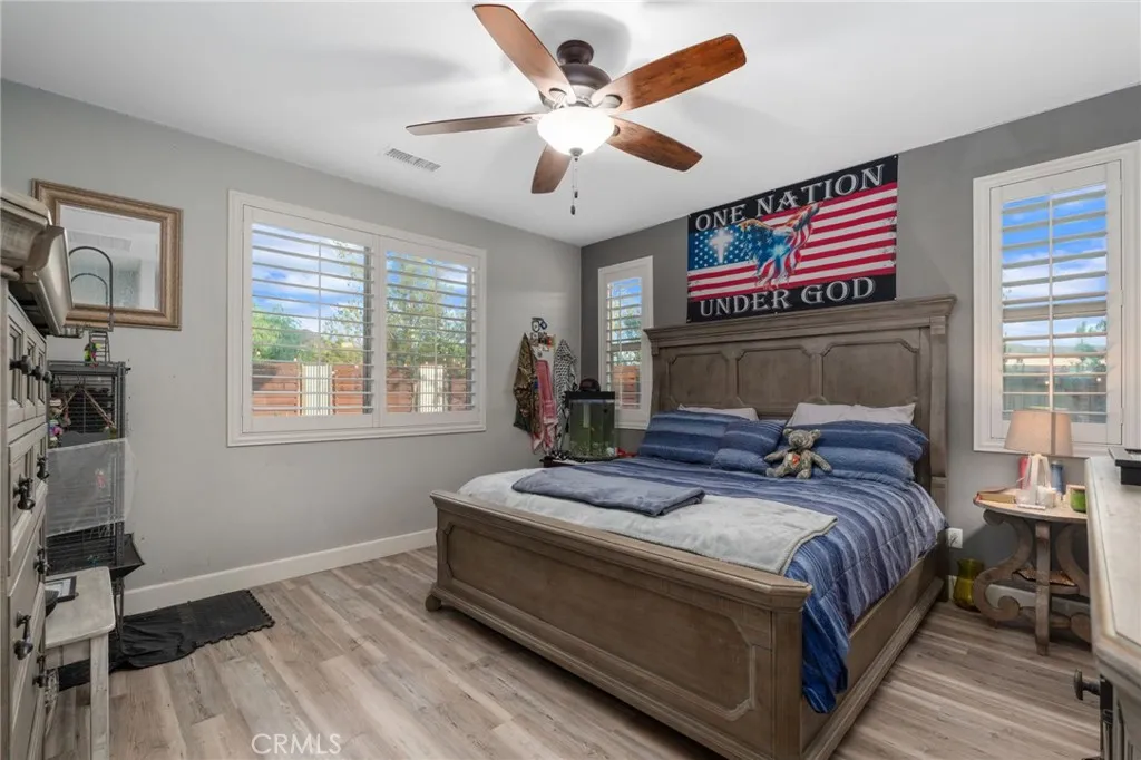 Welcome to this beautifully maintained 3-bedroom, 2-bath home located in the highly sought-after Summerly Community of Lake Elsinore. This thoughtfully designed two-story residence has all bedrooms and bathrooms on the main floor, along with a spacious upstairs loft that is perfect as a media room, home office, or creative retreat. Step into a light-filled interior with a welcoming open-concept layout that connects the living room, dining area and kitchen, perfect for entertaining or relaxing at home. The living space features laminate flooring, neutral paint tones and plantation shutters in the dining room, primary suite and one bedroom, offering comfort and timeless style. The kitchen boasts granite countertops, ample cabinet space, a functional layout and a microwave that's approximately one year old. A breakfast bar adds convenience for quick meals or casual dining. The dining area is ideally positioned with easy access to the backyard for indoor-outdoor living. The primary suite is private and spacious, featuring laminate flooring, dual sinks, a roomy closet and a good-sized shower. The two additional bedrooms offer carpet flooring with new carpet (approx. 6 months old) in one room and they share a full hall bathroom with a bathtub/shower combo. Upstairs, the loft provides additional flexibility that is ideal for a second living area, playroom or guest space. The backyard offers the perfect setting for gatherings and quiet evenings featuring a large covered patio with lights, a separate sitting area with a moveable firepit, a gated dog run and full fencing in the backy