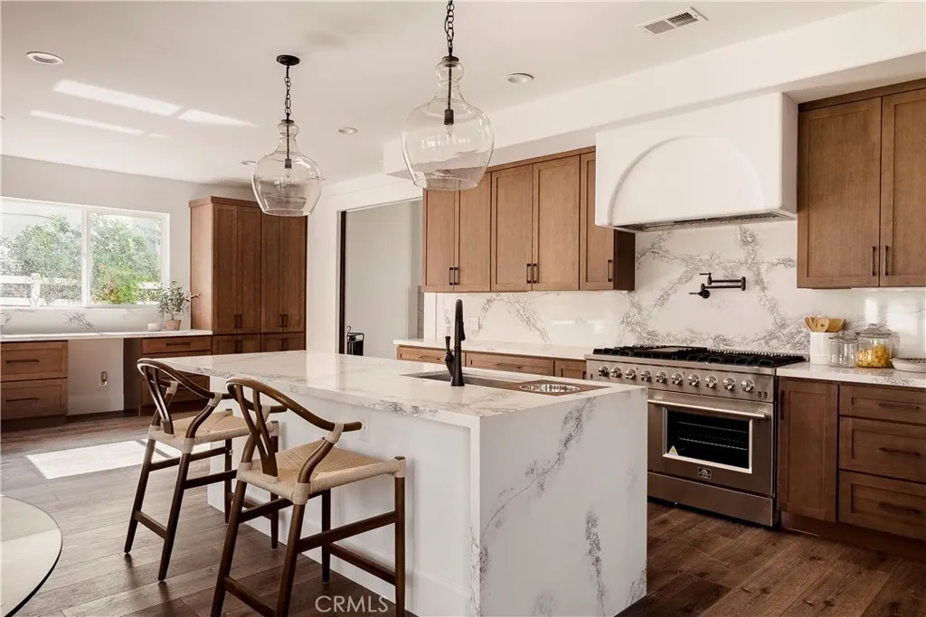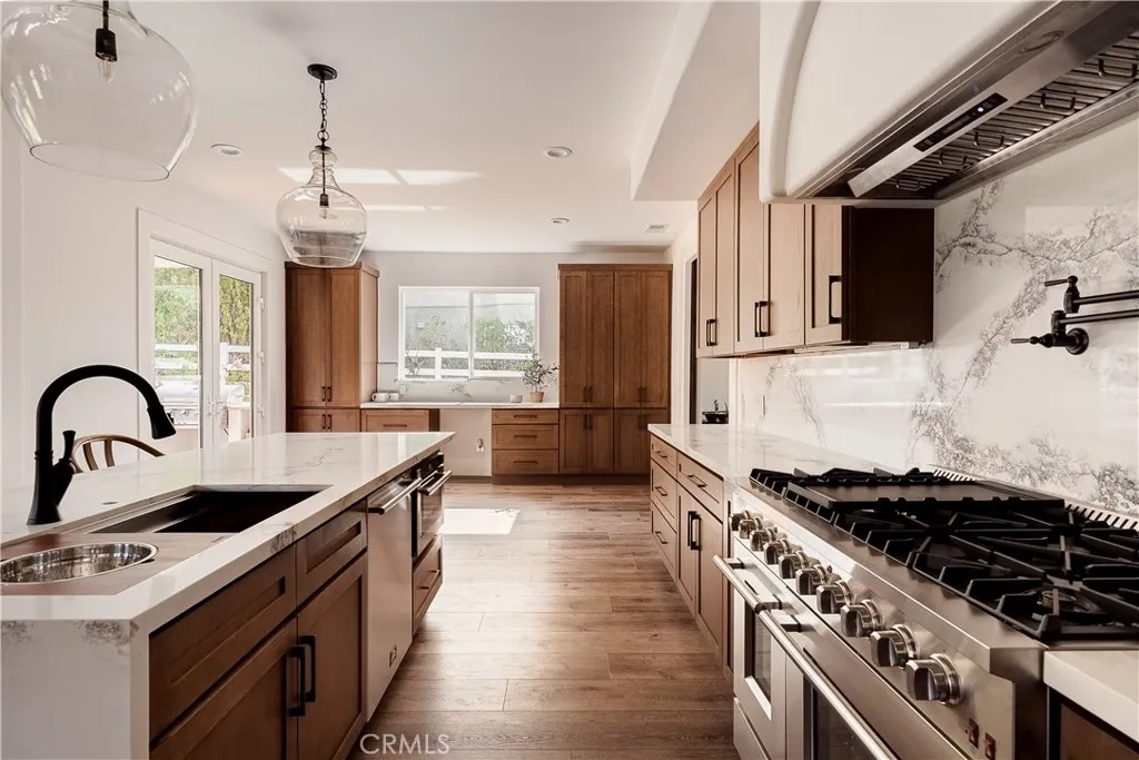 Welcome to Sand Canyons finest masterpiece, a true piece of art. Situated near Sand Canyon Country Club, this fully curated estate offers 5 bedrooms, 4 bathrooms, and 3,812 sq. ft. of living space on an expansive 34,874 sq. ft. lot. Upon entry, youre greeted by a grand entrance where soaring ceilings and sunlight set the tone for the elegance of the home. Every detail has been thoughtfully redesigned, showcasing brand-new wide-plank flooring, new cabinetry, fresh interior and exterior paint, all-new windows, dual French doors, new interior doors, and seamless quartz countertops across its interior. With signature hardware and exquisite finishes, this home combines an inviting ambiance with elevated design, highlighted by graceful arches that enhance its architectural appeal throughout. Step into a true chefs dream kitchen showcasing a professional 48-inch range, 42-inch sink, brand-new appliances, a 10-foot island, pot filler, wine fridge, built-in microwave, and a charming breakfast nookperfectly designed for both cooking and entertaining. The primary suite serves as a private sanctuary with a cozy fireplace, balcony overlooking the backyard and pool, a luxurious stand-alone tub, his and her sinks with marble countertops, and a spacious walk-in closet, complemented with a bonus room ideal for a home office, nursery, or personal fitness space. Along with the primary suite, the home features four additional bedrooms and a spacious loft offering versatility for a game room, home theater, or additional lounge area. Walk outside to your resort-style backyard oasis featuring a s