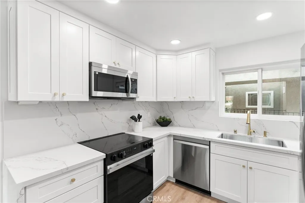 Experience luxury and comfort in this fully remodeled 2BD/2BA, 1,199 sq ft Garden Villa condo in the heart of Laguna Woods Village! Located in a Tri-level building with elevator access and subterranean parking, this single-level unit features a modern split-bedroom layout, each with its own new mini-split HVAC system. The designer kitchen impresses with quartz countertops, waterfall island, full quartz backsplash, custom soft-close shaker cabinets, under-cabinet and recessed lighting, and bespoke Samsung stainless appliances. Enjoy tranquil mountain and magnolia tree views from the private balcony or through brand-new Milgard windows and doors. Bathrooms include a spa-like walk-in shower and a luxurious Jacuzzi soaking tubplus upgraded vanities and Toto toilets. Additional highlights: luxury vinyl plank flooring throughout, smooth ceilings, new Bradford White water heater, and fully permitted upgrades. Steps from Clubhouse 4 with world-class amenities. Resort-style 55+ living!