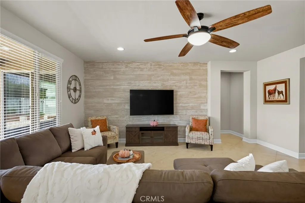 This is ityour turnkey Haven model in one of Southern Californias most sought-after active adult 55+ communities. This spacious single-story offers 3 bedrooms, 2 bathrooms, and 2,030 sq. ft. of well-designed living space, plus one of the largest backyards in the neighborhood. Inside, youll find low-maintenance 20" porcelain (installed on a diagnal) square tile flooring and an inviting open-concept layout. The gourmet kitchen is a showstopper, featuring a massive granite island with sink, walk-in pantry, and premium KitchenAid and Bosch appliances including a sleek stove hood and separate dining area. Entertain with ease thanks to the built-in wet bar with wine rack, sink, wine fridge, and abundant cabinetry. The family room shines with a modern shiplap accent wall, while the primary suite provides its own backyard access and a spa-inspired ensuite with dual sinks, soaking tub, walk-in shower, and large walk in closet with upgraded built in system. Two additional bedrooms and a full bath are located down a seperate hallway and seperated from the primary. The backyard is an entertainers dreamcomplete with a covered patio and ceiling fan, stamped concrete with gas-wired firepit, lush landscaping, and vinyl fencing. Gardeners will love the six cedar planter boxes with drip irrigation, producing fresh vegetables (including green peppers) alongside mature orange and lemon trees on the side yard. Additional upgrades include: Mohawk RevWood engineered flooring in bedrooms, tankless water heater, ADA-friendly doorways, hallways and toilets, recessed LED lighting, ceiling fans in eve