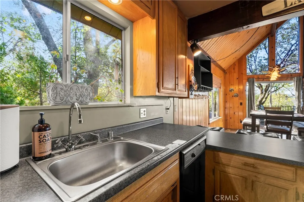 Location matters! This charming 3 bedroom/2.5 bathroom, A frame mountain retreat is located in a prime location only 1.2 miles to Lake Arrowheads Tavern Bay Beach Club & National Forest hiking/off road trails right up the street! Pride of ownership top to bottom(exterior recently professionally painted), with EASY ENTRY from a LEVEL concrete driveway. This accommodating floorplan offers a full bathroom and bedroom on the main living level. The front door enters directly into the beautiful living room boasting quality tongue and groove wood paneling, open beamed cathedral ceilings, and wood burning stove centered perfectly between floor to ceiling wall of glass. Kitchen open directly to the dining area and living room, ideal for hosting holiday gatherings. Quality engineered hardwood flooring throughout the entry level and upstairs bedroom. The upstairs bedroom en suite offers ample closet space, a cozy reading nook, and full bathroom boasting a soothing custom stone shower. Downstairs offers a spacious game room serving as a 3rd bedroom area with attached powder room bath, laundry room, and ample storage room. Plenty of usable outdoor space here via a large, covered concrete lower patio area with storage shed for the tools and toys. Host Summer BBQs on an oversized 27x26 entertainers deck perfectly positioned under a canopy of mature Black Oaks with gorgeous sunset views and Mt Baldy. Full lake rights to private Lake Arrowhead and move in ready condition make this a front runner of its price range. Just in time for holidays in the mountains, tour today!