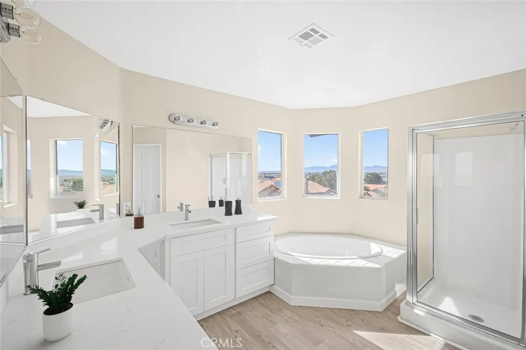 This beautifully renovated home is move-in ready and offers fresh curb appeal with brand-new trim paint on the exterior and a completely repainted interior that brings a clean, modern feel throughout. Step into a bright and stylish kitchen featuring freshly painted cabinets with new hardware, gleaming granite countertops, a new stainless steel appliance suite, and an upgraded faucetperfectly complemented by the adjacent breakfast nook and formal dining area. The home boasts brand-new vinyl plank flooring downstairs and plush new carpet in all the bedrooms, enhancing the warmth and comfort of every living space. Enjoy two spacious living areas, a convenient downstairs bedroom and full bath, and a thoughtfully updated Jack & Jill bathroom upstairs with a new vanity, counter, faucet, lighting, and toilet. The luxurious master suite is your private retreat, complete with a dual vanity, new counters and under-mount sinks, updated faucets, a separate soaking tub and shower, and a large walk-in closet. The front yard features fresh new rock landscaping, while the backyard is built for entertaining with custom concrete, two covered sitting areas, and a built-in BBQ. A rare feature of this property is the oversized 3-car garage with special doors that allow walk-through access without raising the door, and a full pass-through into the backyardideal for extra parking or recreational use. Centrally heated and cooled, this home is located in a desirable neighborhood near schools, shopping, and dining. This is a rare offeringdon't miss your chance to tour this exceptional home today!