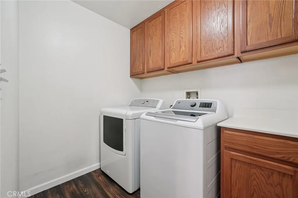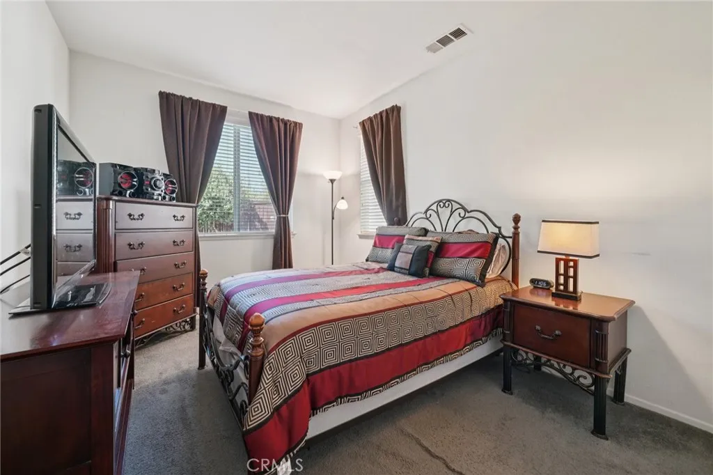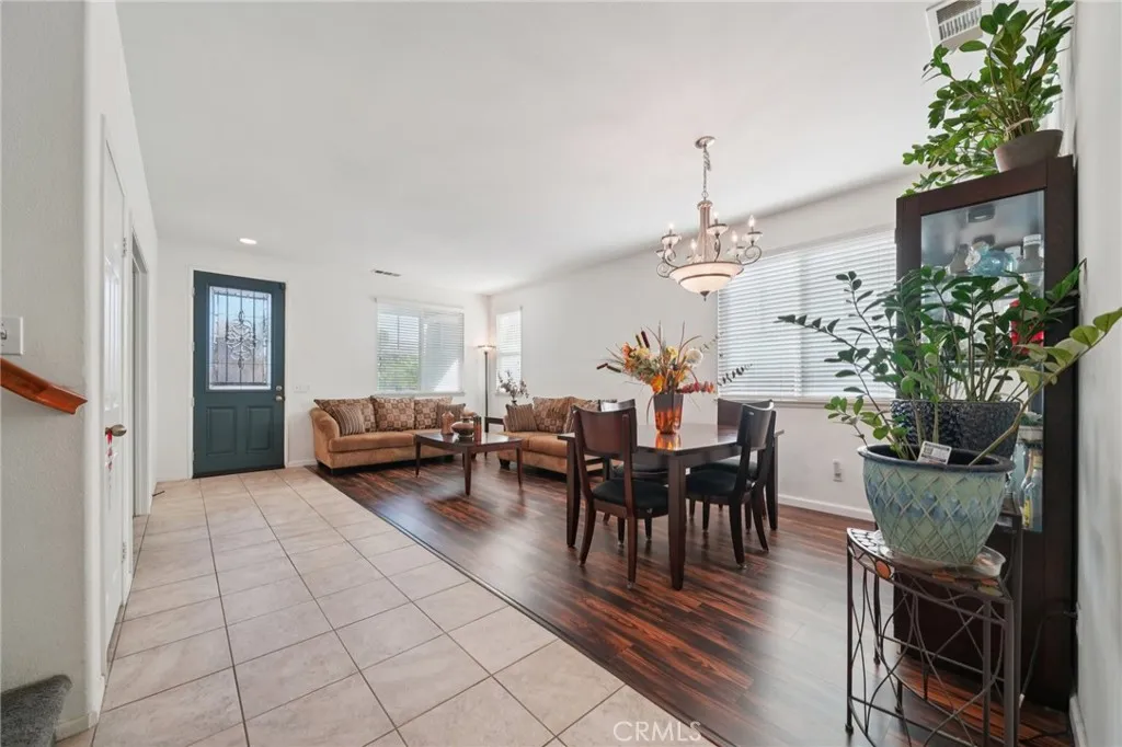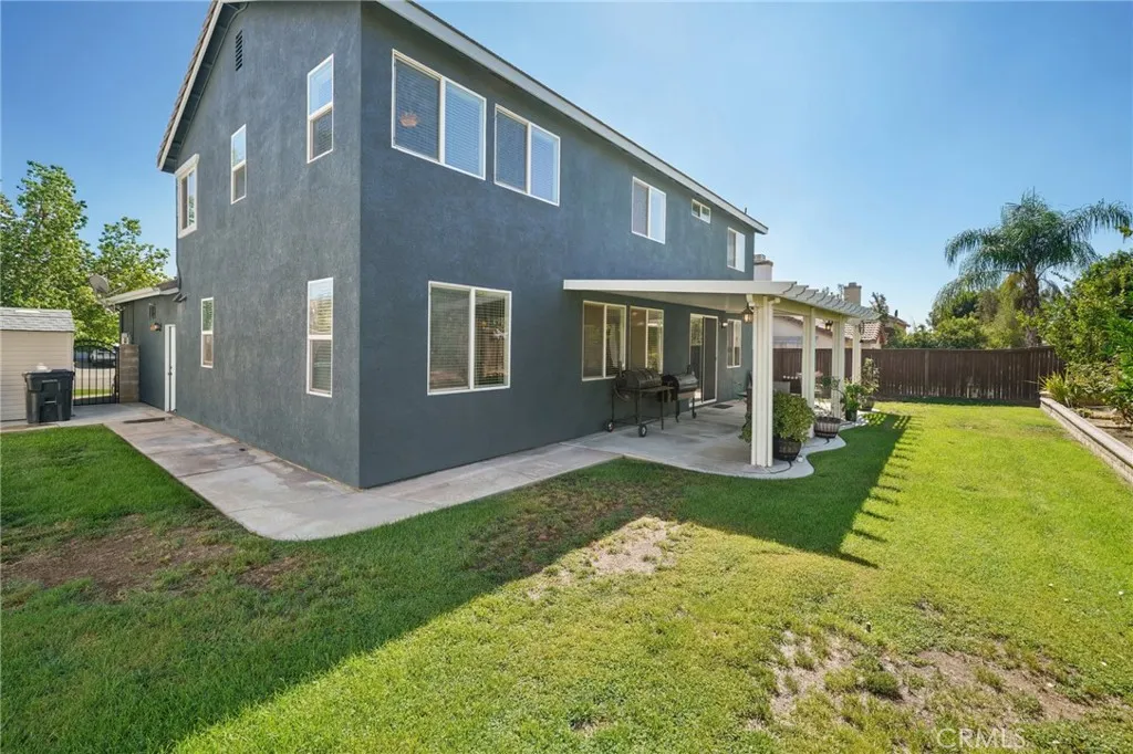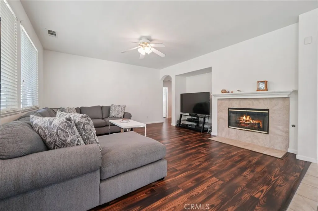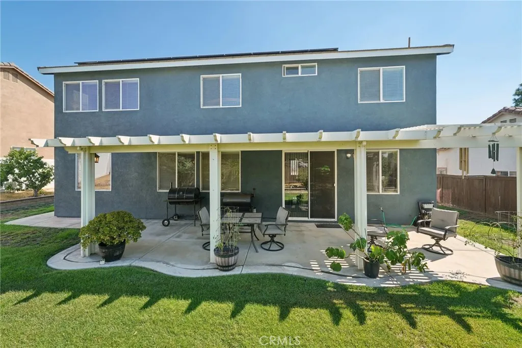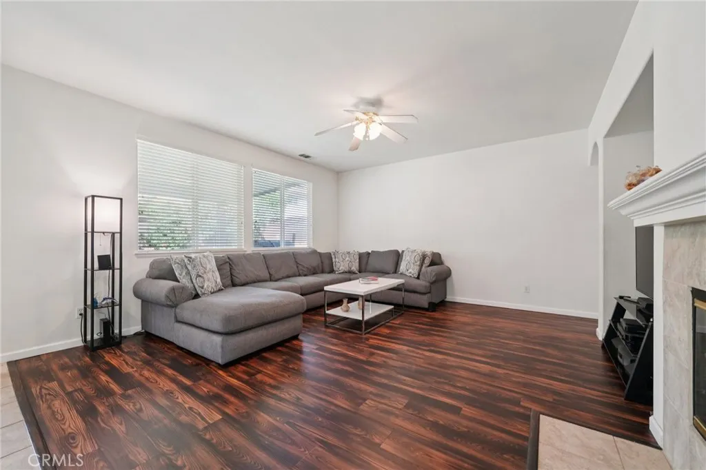 Welcome to this clean and well-maintained home offering spacious living, great natural light, and fantastic curb appeal with its beautiful blue exterior with crisp white trim and lush grassy front yard. Inside, the inviting floorplan begins with formal living and dining areas off the entry, along with a versatile den/office with double doors. Richly hued laminate flooring flows through the main living spaces, with tile in the entry and kitchen and cozy carpeting in the bedrooms. The spacious kitchen features wood cabinetry, a center island, stainless steel appliances, and a sunny breakfast area that opens seamlessly to the family room with a tile-framed fireplace and mantle. A glass slider leads to the backyard patio, perfect for lounging, dining, and barbecues, surrounded by a manicured yard with mature shrubs and grassy space. This home offers a main floor bedroom and full bathroom with shower, as well as a convenient laundry room with abundant storage cabinetry and direct access to the 2-car garage. Upstairs, enjoy a spacious loft, three additional bedrooms, and two full bathrooms. The oversized primary suite boasts a walk-in closet and an en suite bathroom with a soaking tub, shower, and dual-sink vanity. Additional highlights include a leased solar system for energy efficiency and a prime location close to schools, shopping, and the 60 freeway.