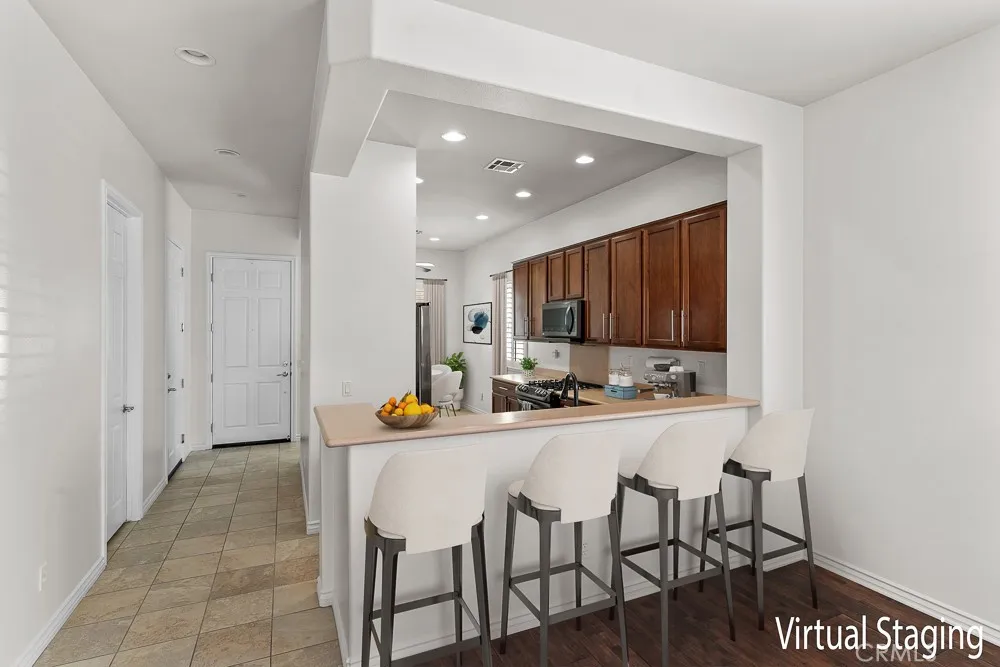 Welcome to Solera Diamond Valley by Del Webb 55 + community. This single-story, 2-bed/2-bath home pairs easy, low-maintenance living with resort amenities. Interior highlights include high ceilings, window shutters, high-end wood floors, new interior paint, carpet, a gas fireplace and an open great room that extends to covered patio. The kitchen offers Corian counters, a gas range, and a separate breakfast nook perfect for morning coffee and afternoon shade. The primary suite features dual sinks, a walk-in shower, and two closets (one walk-in, one standard). The garage adds three overhead storage racks for extra space. Friendly, pet-accommodating community. Enjoy the Lodge with indoor lap pool & spa, two outdoor pools, fitness center, courts, clubs, and trailsminutes to Diamond Valley Lake, shopping, and dining.