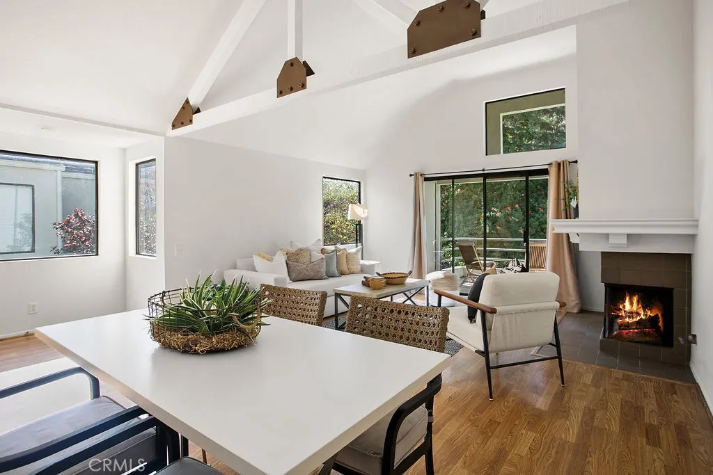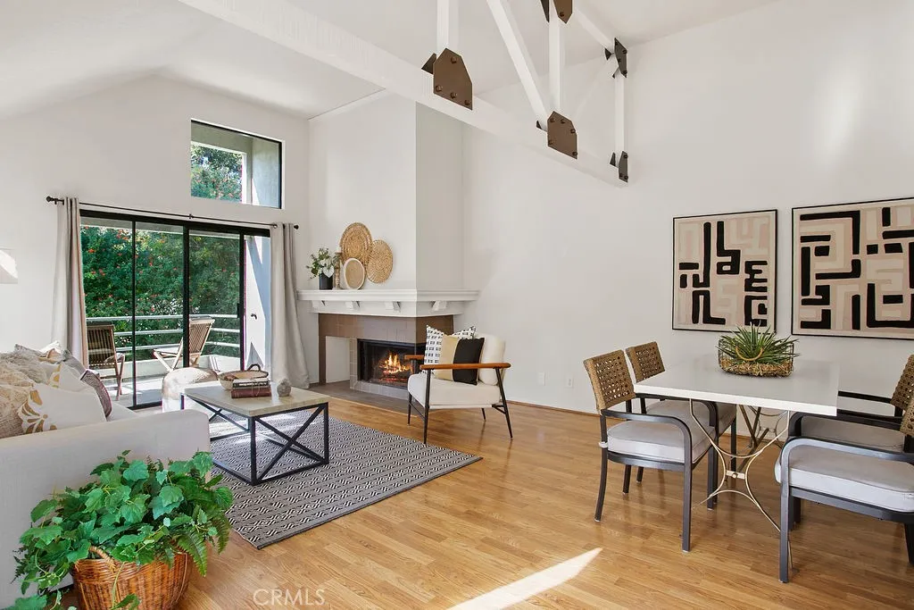 Welcome to your own private retreat in the highly desirable Villeurbanne Community of Orange! This charming one-bedroom, one-bath condo is perfectly situated in one of the community's most sought-after locations, surrounded by lush trees and greenbelts. Step inside to find a bright and open layout featuring dramatic vaulted ceilings, oversized skylights that flood the home with natural light, and a cozy fireplace as the centerpiece to the living room. The spacious dining area offers bar-top seating to the kitchen. A private balcony extends your living space outdoors, ideal for al fresco dining or simply relaxing with the peaceful greenery. The generously sized bedroom is bathed with natural light and features ample closet space. Additional highlights include an inside laundry closet with full-size washer and dryer. Residents of Villeurbanne enjoy resort-style amenities including sparkling pools, relaxing spas, BBQ areas, and access to a private reservable community center. Outdoor enthusiasts will love the nearby walking paths, hiking trails, and close proximity to Peter's Canyon and Irvine Regional Park. Convenient freeway and toll road access makes commuting a breeze. This home is an incredible opportunity to enjoy peaceful living in the hills of Orange.