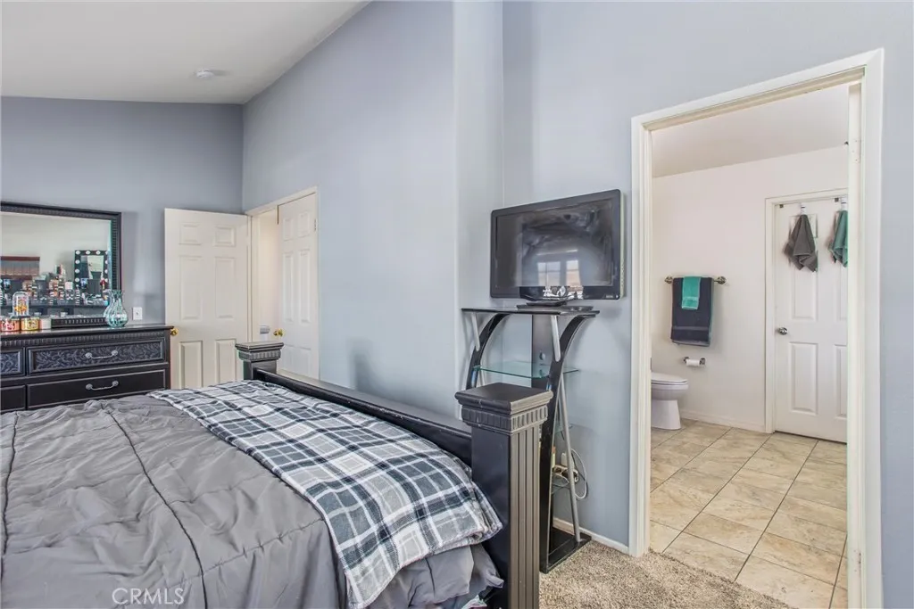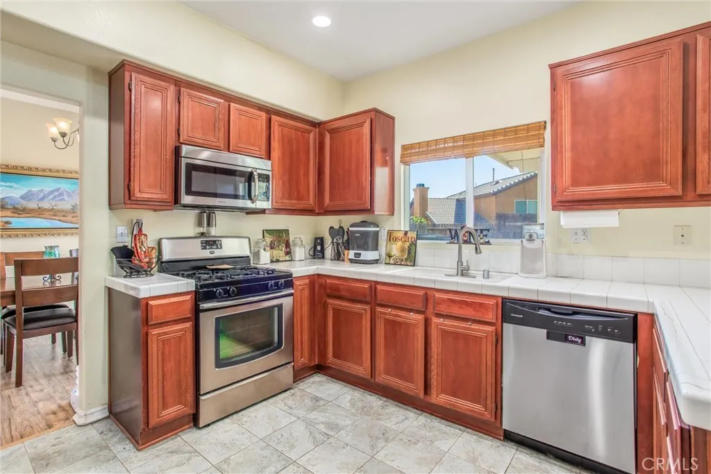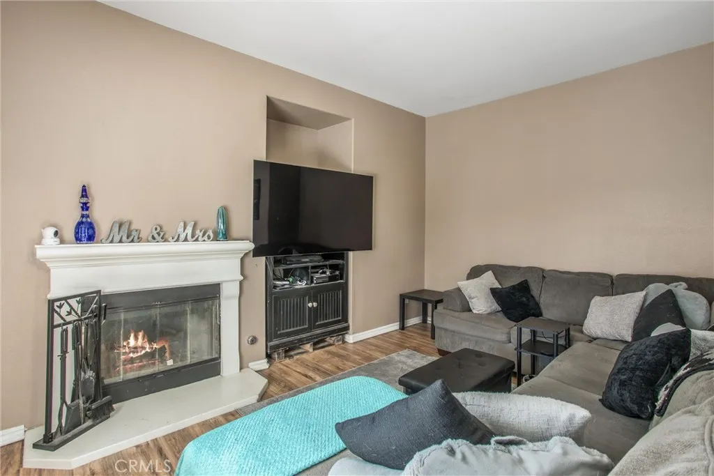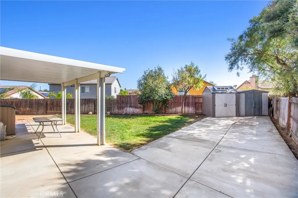 Welcome home to this well-maintained 3-bedroom, 2.5-bath residence featuring double-sided gated RV parking on both sides of the property and fully paid-off solar panels for energy savings and peace of mind. As you enter, a cozy living room with soaring two-story ceilings welcomes you and flows seamlessly into the formal dining area at the rear of the home with direct kitchen access. The kitchen offers white tile countertops, recessed lighting, stainless steel appliances including a gas range, microwave, and dishwasher, a built-in pantry, breakfast counter seating, and neutral tile flooring. The kitchen opens to the comfortable family room featuring a gas fireplace and sliding door access to the covered rear patio. Laminate wood flooring extends through most of the downstairs, complemented by neutral paint and wood blinds throughout. A convenient downstairs half bath adds to the functionality of the layout. Upstairs features three spacious bedrooms with neutral carpeting and two full baths. Both secondary bedrooms offer walk-in closets and share a centrally located full bath with a shower/tub combination. The primary suite provides a relaxing retreat with dual vanities, a soaking tub, separate walk-in shower, and a large walk-in closet. The backyard provides plenty of space to entertain or unwind with a grassy area, a large covered patio, and an oversized storage shed that will remain with the property. Additional highlights include a recently painted exterior (completed approximately one year ago), a two-car garage with laundry hookups, and no HOA. This home combines everyd