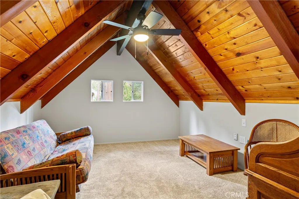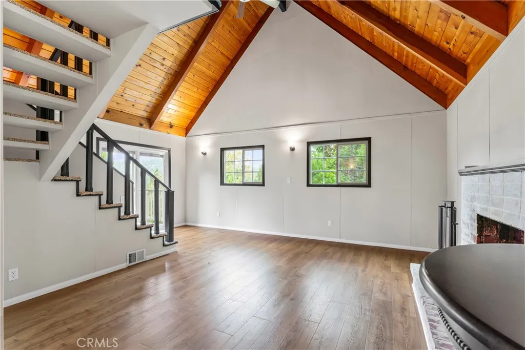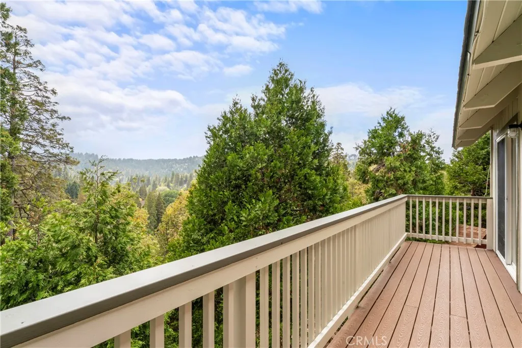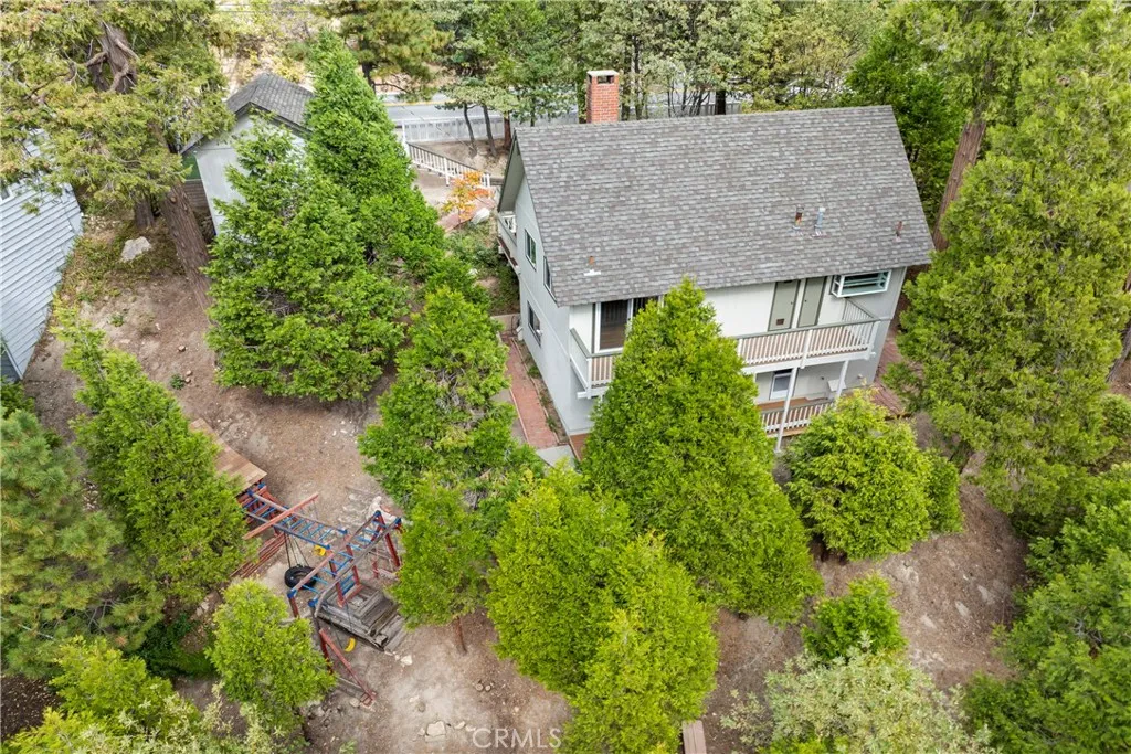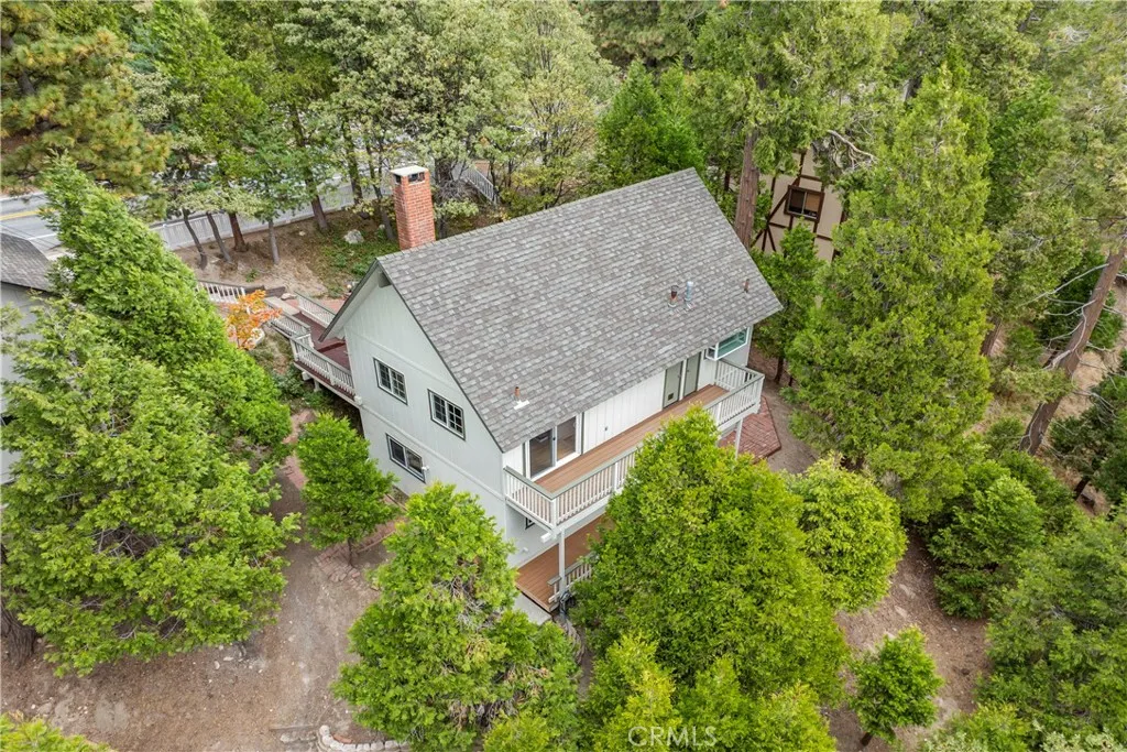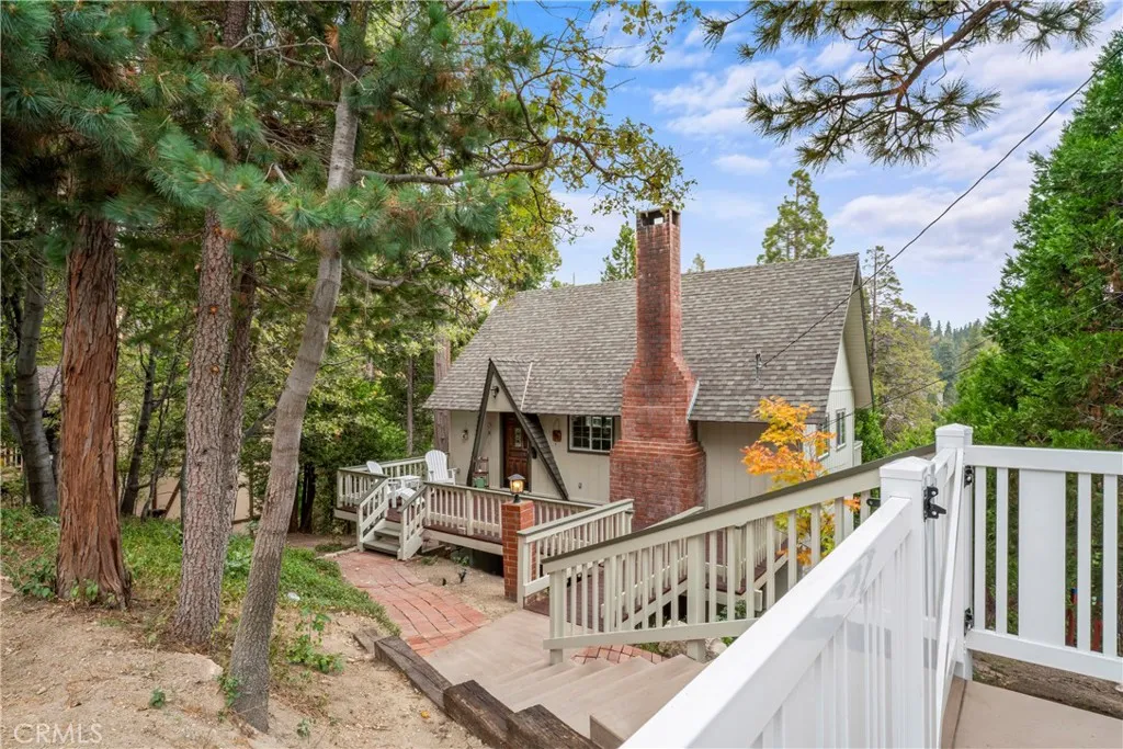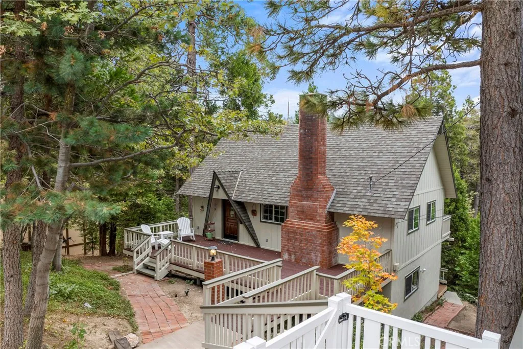 MID-CENTURY GEM WITH LAKE RIGHTS IN PRESTIGIOUS GRASS VALLEY NEIGHBORHOOD. Join one of the premier residential areas in Lake Arrowhead with LAKE RIGHTS and its own Grass Valley Lake. This home blends modern updates with classic mountain charm, offering privacy, views, and a lifestyle thats both tranquil and connected. PROPERTY HIGHLIGHTS: This meticulously renovated cabin w/2 BD, 2 Full BA on two levels and THREE SCENIC DECKS (front, back and lower level). The cozy homes entrance is set back well off the street. Street-LEVEL garage entry plus lighted concrete steps lead to a custom front door with vintage glass and A-Frame overhang. OPEN FLOOR PLAN: Step inside to an inviting open-concept layout featuring a foyer, bright kitchen w/island, dining nook and expansive living room. Soaring cathedral ceilings in wide plank caramel pine pair beautifully with ebony wood-framed windows and doors, while a whitewashed brick fireplace anchors the large living area with timeless elegance. Sliders open to a spacious deck for morning coffee or evening entertaining. Above the main living area, a sun-drenched loft offers flexible space for a home office, reading retreat or guest sleeping. LOWER-LEVEL COMFORT: Two generously sized bedrooms with large windows and custom cabinetry are downstairs. One BD has wood wainscotting accents and is adjacent to the first large, gleaming full bath. The ensuite bedroom leads to deck with entrance to this level for easy backyard access. BONUS SPACES & OUTDOOR LIVING: A finished workroom/office with a large window is just steps from the garage. A brick-pave