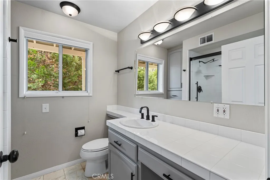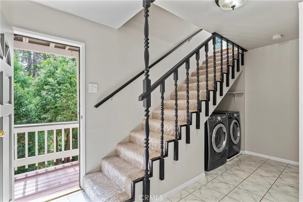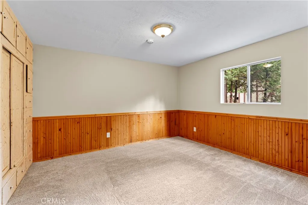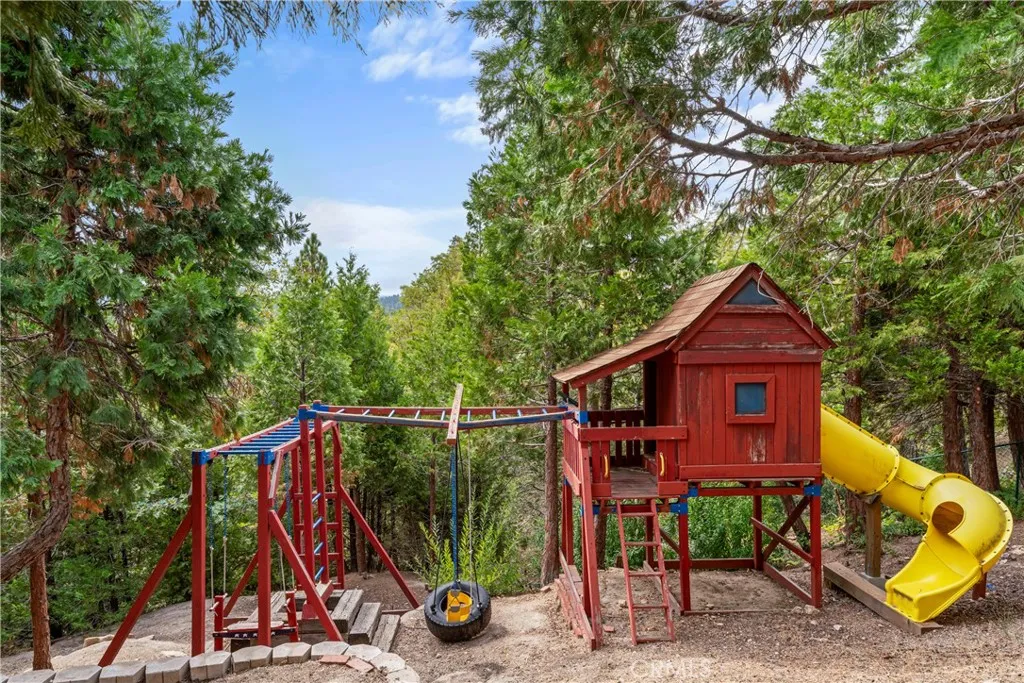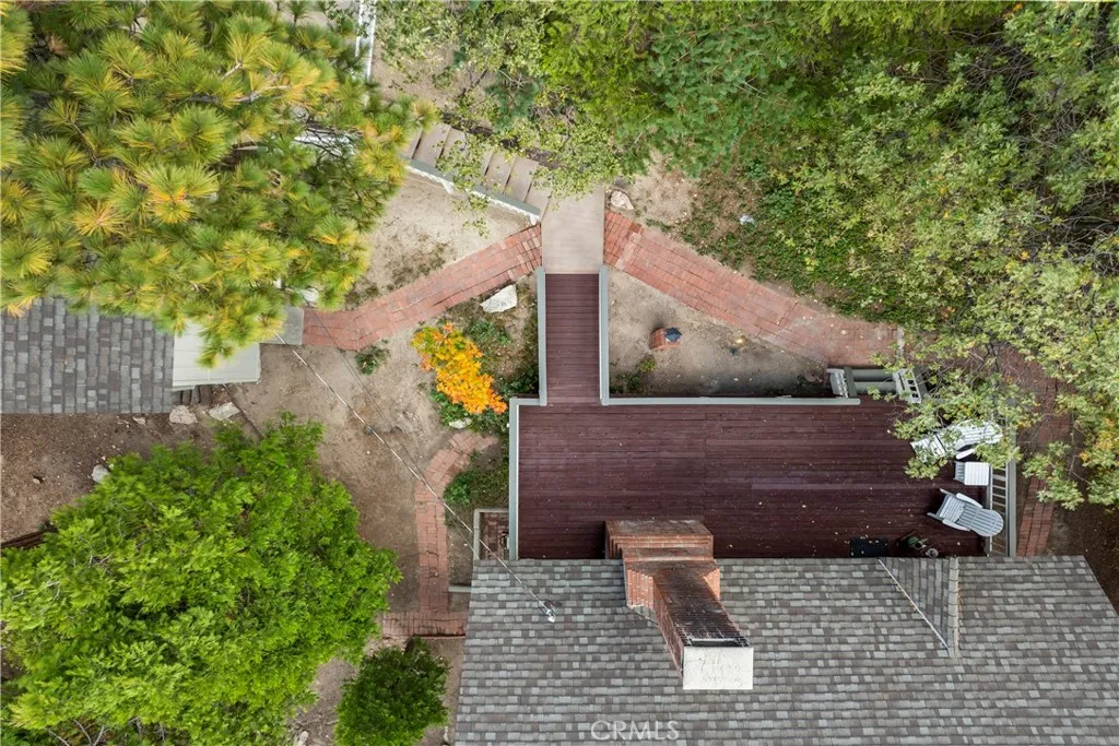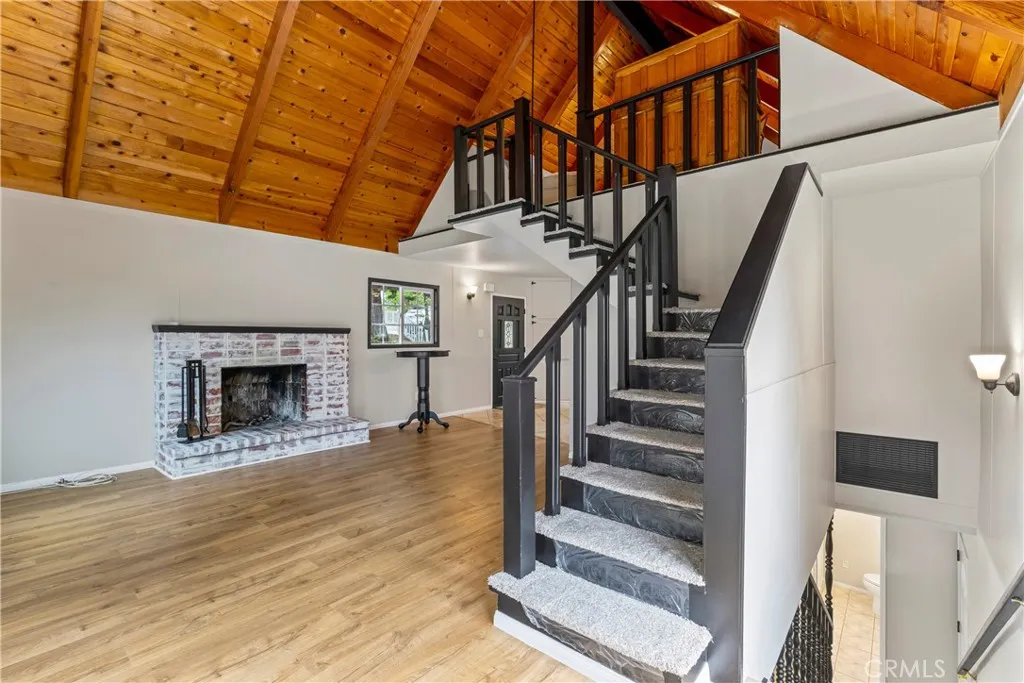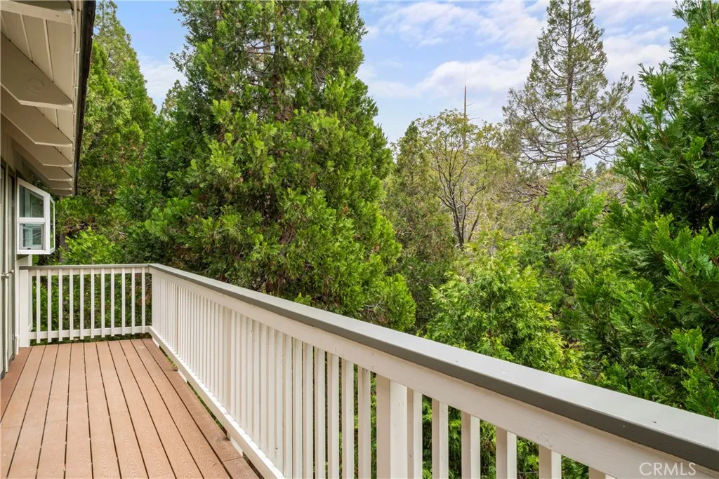 MID-CENTURY GEM WITH LAKE RIGHTS IN PRESTIGIOUS GRASS VALLEY NEIGHBORHOOD. Join one of the premier residential areas in Lake Arrowhead with LAKE RIGHTS and its own Grass Valley Lake. This home blends modern updates with classic mountain charm, offering privacy, views, and a lifestyle thats both tranquil and connected. PROPERTY HIGHLIGHTS: This meticulously renovated cabin w/2 BD, 2 Full BA on two levels and THREE SCENIC DECKS (front, back and lower level). The cozy homes entrance is set back well off the street. Street-LEVEL garage entry plus lighted concrete steps lead to a custom front door with vintage glass and A-Frame overhang. OPEN FLOOR PLAN: Step inside to an inviting open-concept layout featuring a foyer, bright kitchen w/island, dining nook and expansive living room. Soaring cathedral ceilings in wide plank caramel pine pair beautifully with ebony wood-framed windows and doors, while a whitewashed brick fireplace anchors the large living area with timeless elegance. Sliders open to a spacious deck for morning coffee or evening entertaining. Above the main living area, a sun-drenched loft offers flexible space for a home office, reading retreat or guest sleeping. LOWER-LEVEL COMFORT: Two generously sized bedrooms with large windows and custom cabinetry are downstairs. One BD has wood wainscotting accents and is adjacent to the first large, gleaming full bath. The ensuite bedroom leads to deck with entrance to this level for easy backyard access. BONUS SPACES & OUTDOOR LIVING: A finished workroom/office with a large window is just steps from the garage. A brick-pave
