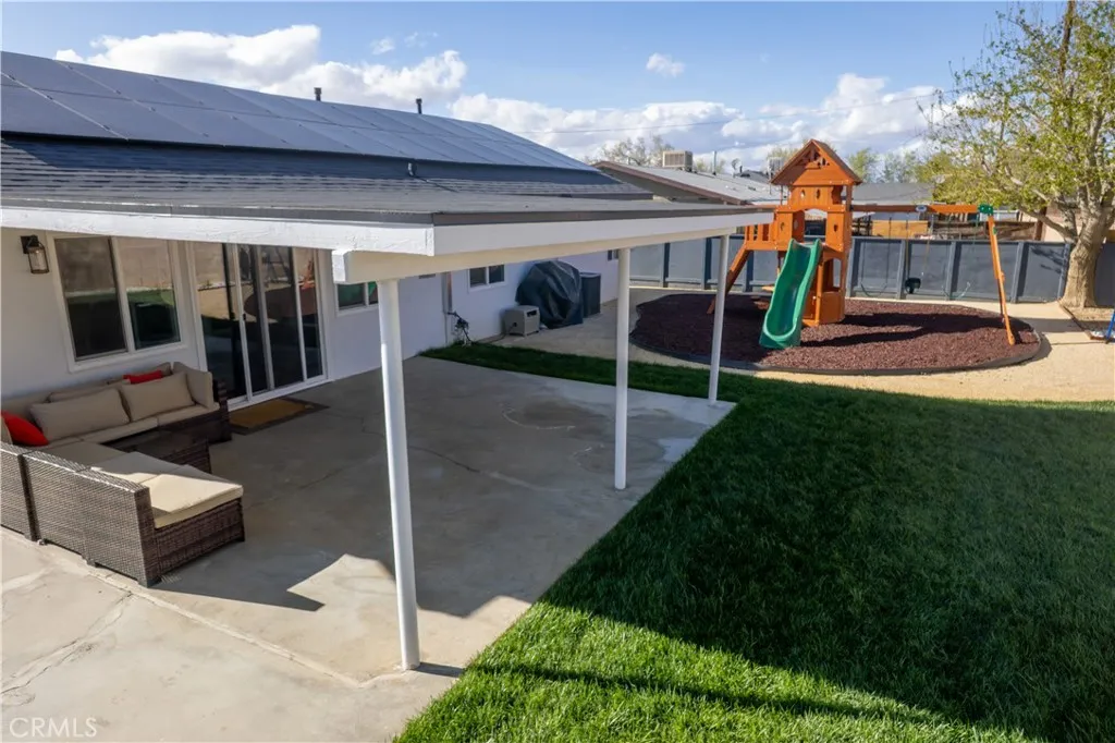 Like new construction! Serene and in move in ready with recessed lighting throughout. Quiet neighborhood just minutes from freeway. New security system with outdoor cameras and door/window sensors to allow you to rest assure when away. Brand new HVAC system installed June 2025! New Furnace installed Dec 2024. New play structure for your kids to enjoy along with mulch around play area for a safer play space. Newer gate has just been installed with new electrical motor for automatic gate access. Plenty of parking in spacious driveway, as well as secured RV Parking with a second gate for privacy. Clean layout that includes a small bar with a mini fridge and office nook. Title shows 4 bedrooms but walls were taken down from one room to open up living room. Major renovations done with permits. Newer roof and windows, newer floors & kitchen, remodeled bathrooms, newer water heater along with new flex lines and new shut off valve. Newer and upgraded electrical breaker box. Newer garage epoxy floor and water pressure regulator. Covered patio for plenty of backyard shade for family and guest. New solar panels installed. Less than 5 miles from AV Hospital, Lancaster National Soccer Center, AV Fair, AV Event Center & AV Mall. Short drive to AV Poppy Reserve.