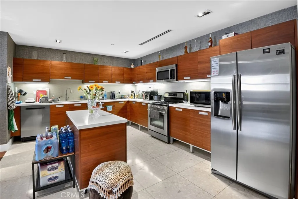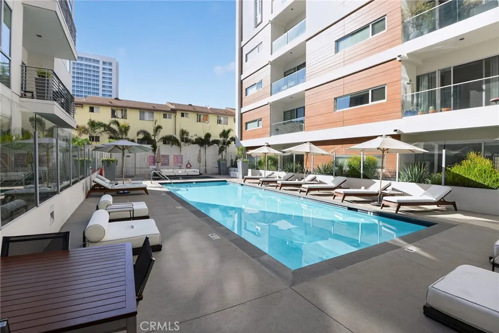 Just moments from the world-renowned Walk of Fame and Chinese Theater, this stylish condo is set in an award-winning luxury community surrounded by dining, shopping, and entertainment. This single-level, contemporary residence offers a spacious open floor plan with a refined yet glamorous vibe. Situated on the third floor, the home boasts soaring 9-foot ceilings, a private balcony, and access to premium amenities including a 24-hour doorman, resort-style pool, fitness center, billiards lounge with TV, and ample guest parking. The gourmet kitchen showcases a central island, quartz countertops, Pedini cabinetry, full tile backsplash, and a high-end Jenn-Air stainless appliances. Additional features include Caesarstone surfaces, recessed lighting, an in-unit washer/dryer, and a welcoming fireplace. The thoughtful layout provides a powder room for guests, a laundry nook, and abundant closet space including a walk-in. Living and dining areas feature wood floors, recessed lighting, fireplace, and direct balcony access through sliding glass doors. Two spacious bedrooms each serve as a private retreat with en-suite baths enhanced by designer tile and fixtures. Comfort and convenience continue with central A/C, a security system, spa, outdoor BBQ area, and two side-by-side parking spaces.