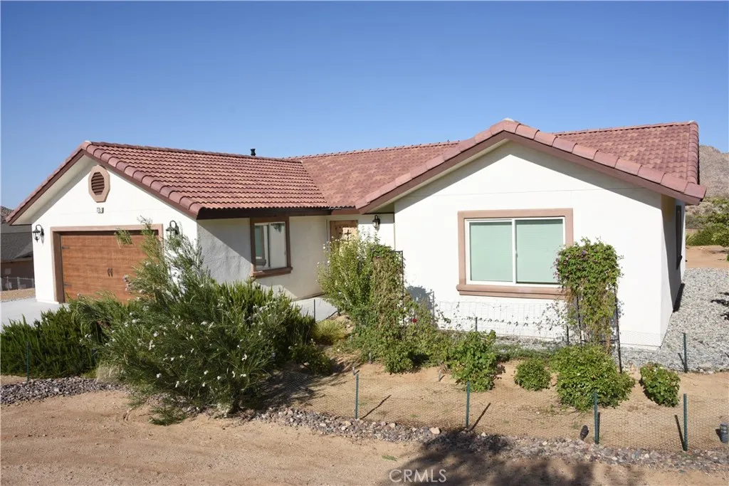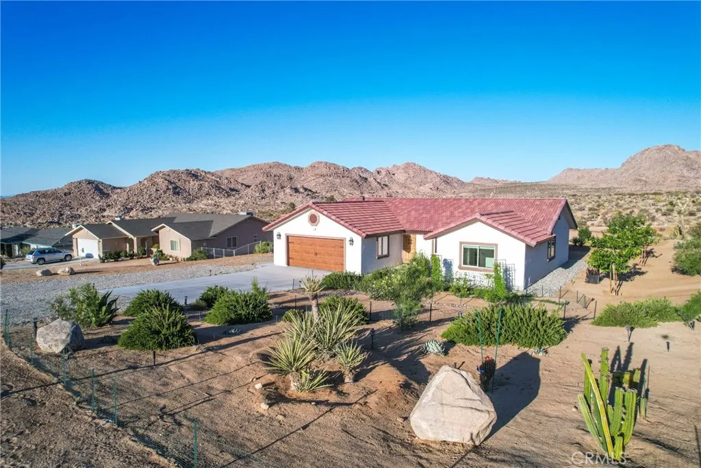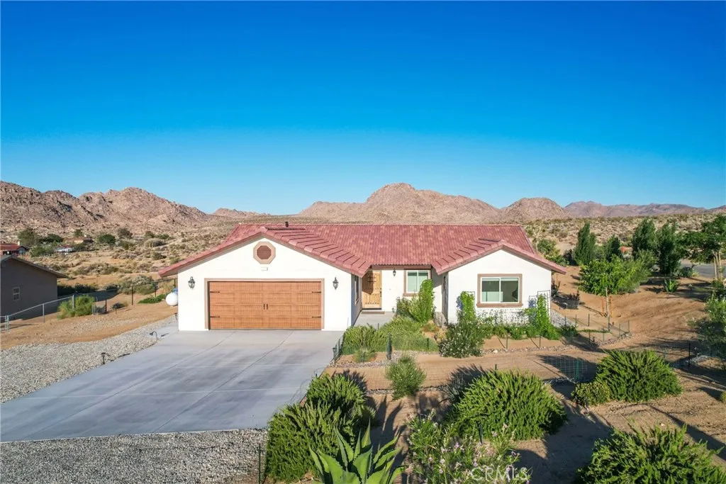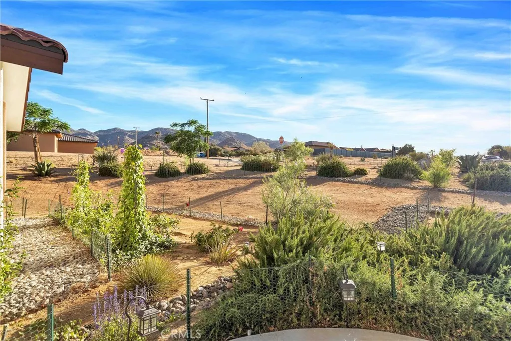 This corner lot property boasts stunning and unobstructed views of Joshua Tree National Park, situated south of Highway 62. It features a complete underground sprinkler system that covers the entire lot, and underground power instead of traditional overhead power. The property has never been lived in, and is adorned with mature trees such as a Santa Rosa plum tree, three fruitless mulberry trees, three umbrella trees, and several popular trees. The landscaping also includes plenty of agave and other plants, with fencing in place to protect them from wildlife. The backyard features a custom block stucco wall and a drainage ramp to channel any excess water off the property. Low voltage lighting illuminates the plants, landscaping, and walls at night. The home includes a new stainless steel counter depth refrigerator, honeycombed energy efficient pleated shades for window coverings, stucco eaves for low maintenance and fire protection, and a tile roof with low attic vents for a streamlined appearance. House also features a "whole house fan". There are three large bedrooms, including an extra large master suite on the opposite side of the home from the other bedrooms. The master suite has two sinks, a Kohler soaking tub, a separate walk-in shower with a seat, and Arizona subway tile installation. The master closet is a walk-in with a Martha Stewart wooden organizer and exclusive higher-end ceiling fans are found throughout the home. The outdoor LED ceiling fans in all rooms are by Casa Delta-Wing and have oil-rubbed bronze finish motors with solid wood walnut finish blades, int