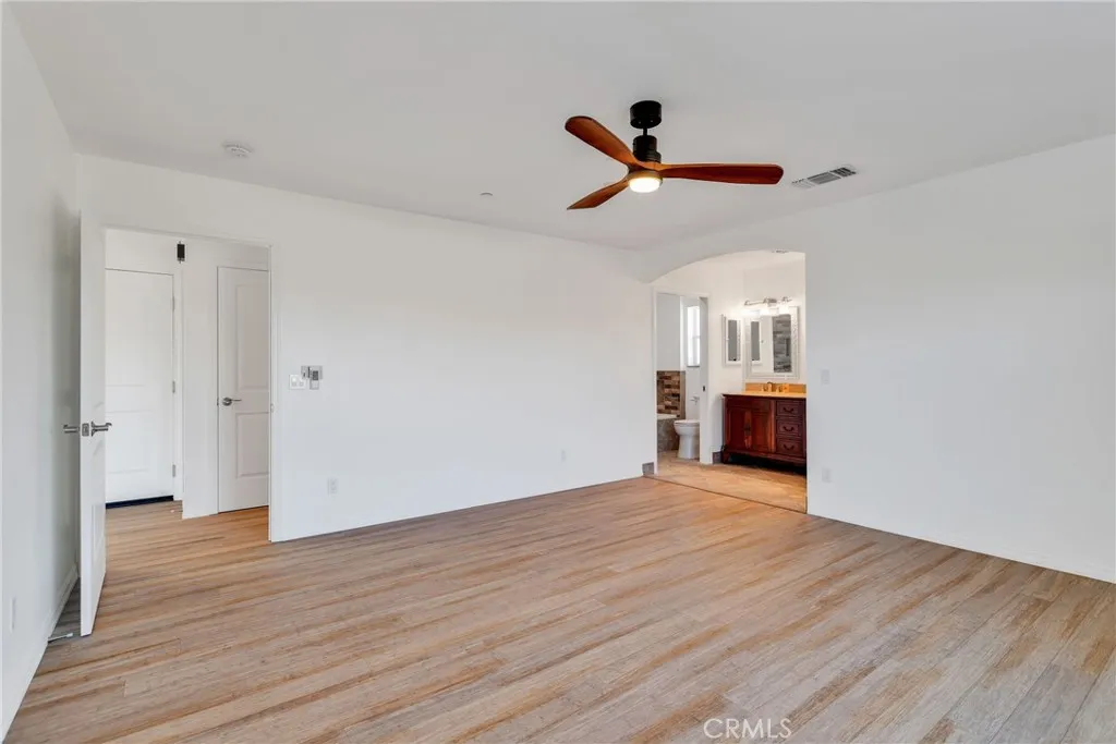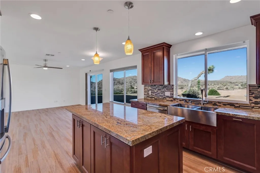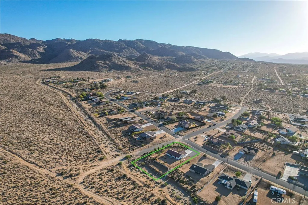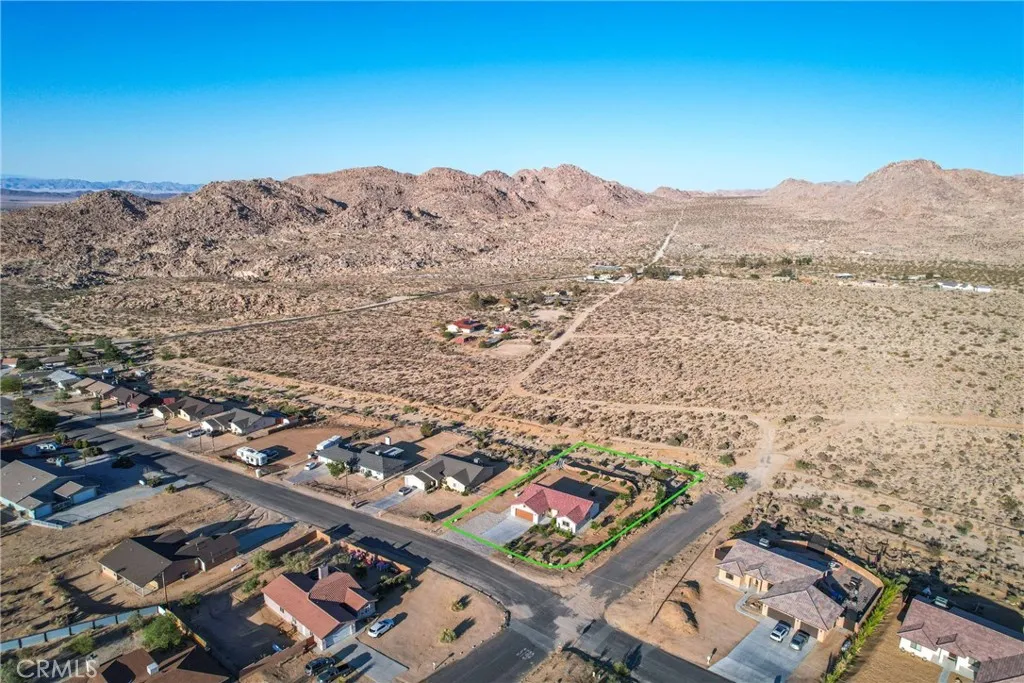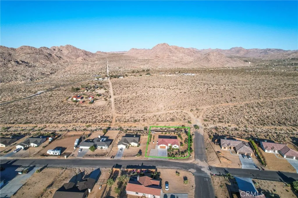 This corner lot property boasts stunning and unobstructed views of Joshua Tree National Park, situated south of Highway 62. It features a complete underground sprinkler system that covers the entire lot, and underground power instead of traditional overhead power. The property has never been lived in, and is adorned with mature trees such as a Santa Rosa plum tree, three fruitless mulberry trees, three umbrella trees, and several popular trees. The landscaping also includes plenty of agave and other plants, with fencing in place to protect them from wildlife. The backyard features a custom block stucco wall and a drainage ramp to channel any excess water off the property. Low voltage lighting illuminates the plants, landscaping, and walls at night. The home includes a new stainless steel counter depth refrigerator, honeycombed energy efficient pleated shades for window coverings, stucco eaves for low maintenance and fire protection, and a tile roof with low attic vents for a streamlined appearance. House also features a "whole house fan". There are three large bedrooms, including an extra large master suite on the opposite side of the home from the other bedrooms. The master suite has two sinks, a Kohler soaking tub, a separate walk-in shower with a seat, and Arizona subway tile installation. The master closet is a walk-in with a Martha Stewart wooden organizer and exclusive higher-end ceiling fans are found throughout the home. The outdoor LED ceiling fans in all rooms are by Casa Delta-Wing and have oil-rubbed bronze finish motors with solid wood walnut finish blades, int